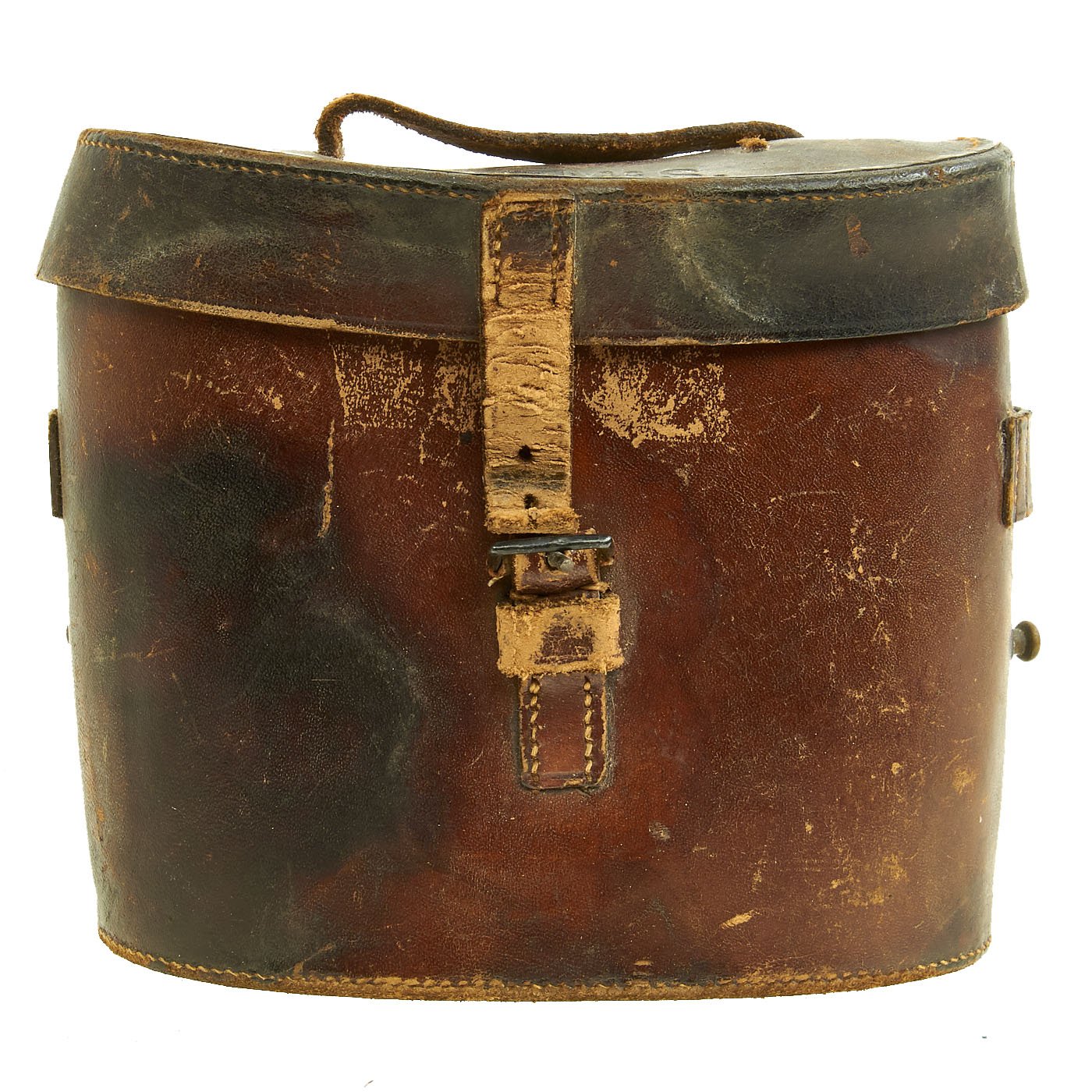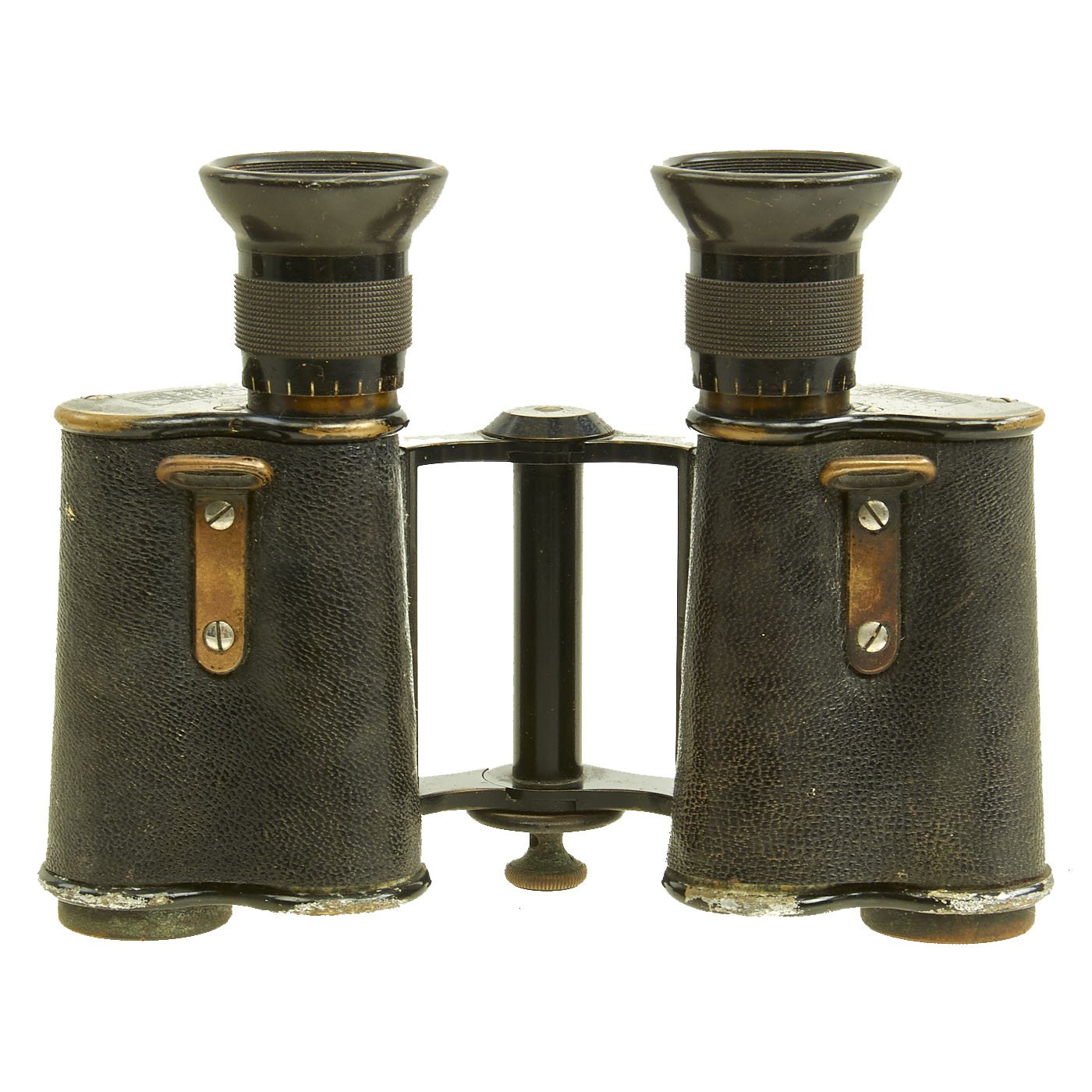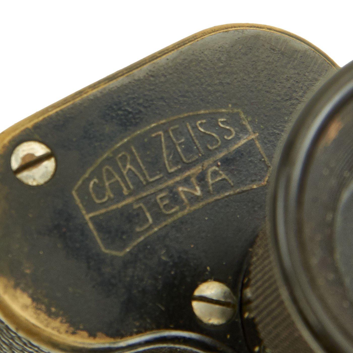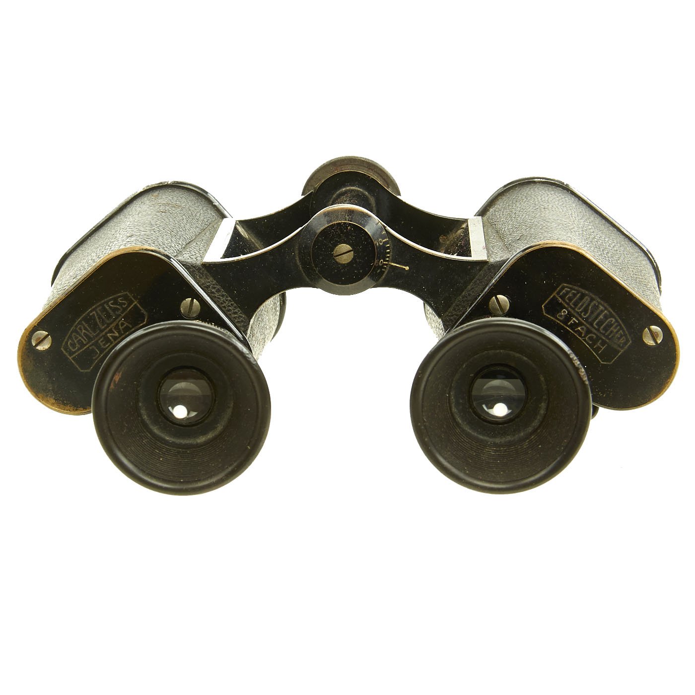Original Items: One of a Kind. This is a very nice set of Early style British WWI Feldstecher (Field Glass) Binoculars, made by the legendary optical company Carl Zeiss of Jena, Germany. British forces had long imported quality optics from Germany, so at the start of WWI, many officers were equipped with this type of binocular. They complete with their original brown leather carry case with burgundy velvet lining. The back of the barrels are marked with the maker information: