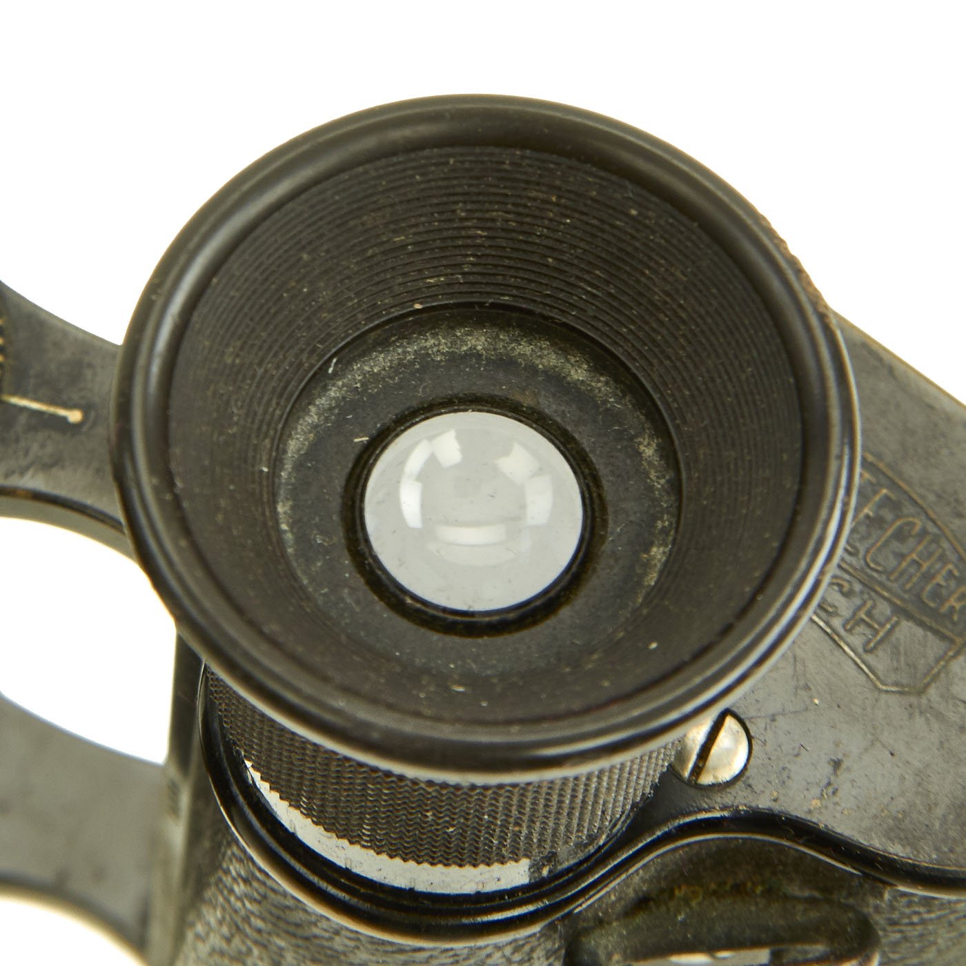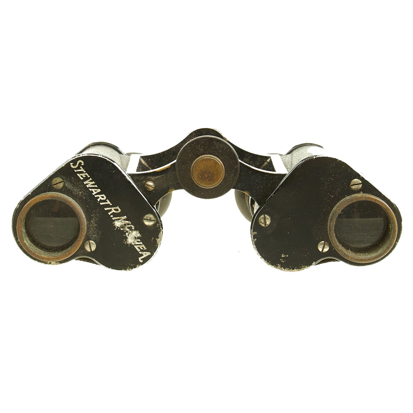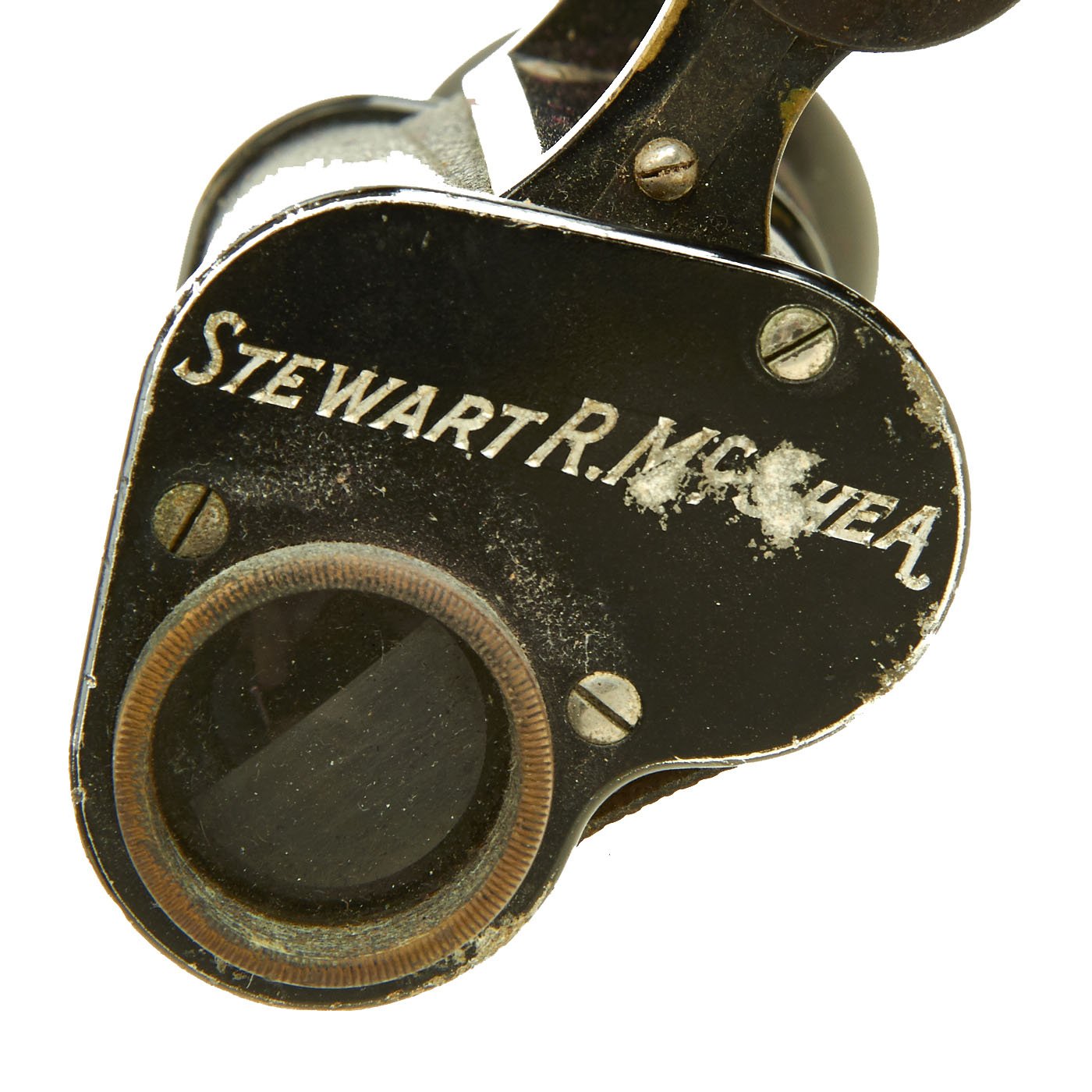 The field glasses are fully functional, and have resin/bakelite eyepieces that have no chipping or cracks. Optics are mostly clear, with a bit of dust from the years, and could use a cleaning. No cracks or chips, and the focus diopter controls work smoothly, though they are bit stiff. There is some wear the the aluminum and brass fittings, but nothing major. The bottom of the right side was engraved post manufacture with STEWART R. McSHEA, the name of the soldier who owned them. The leather covering on the barrels is intact, though it has shrunk a bit and pulled away from the body.