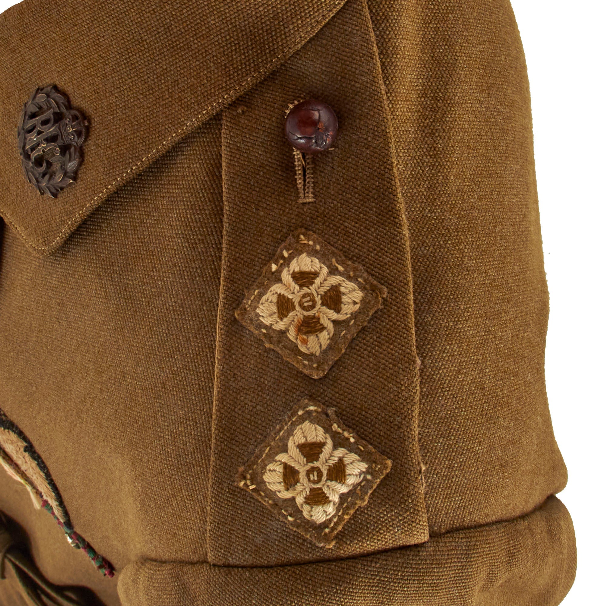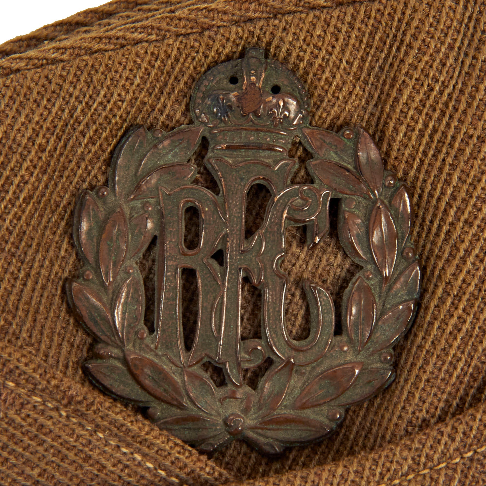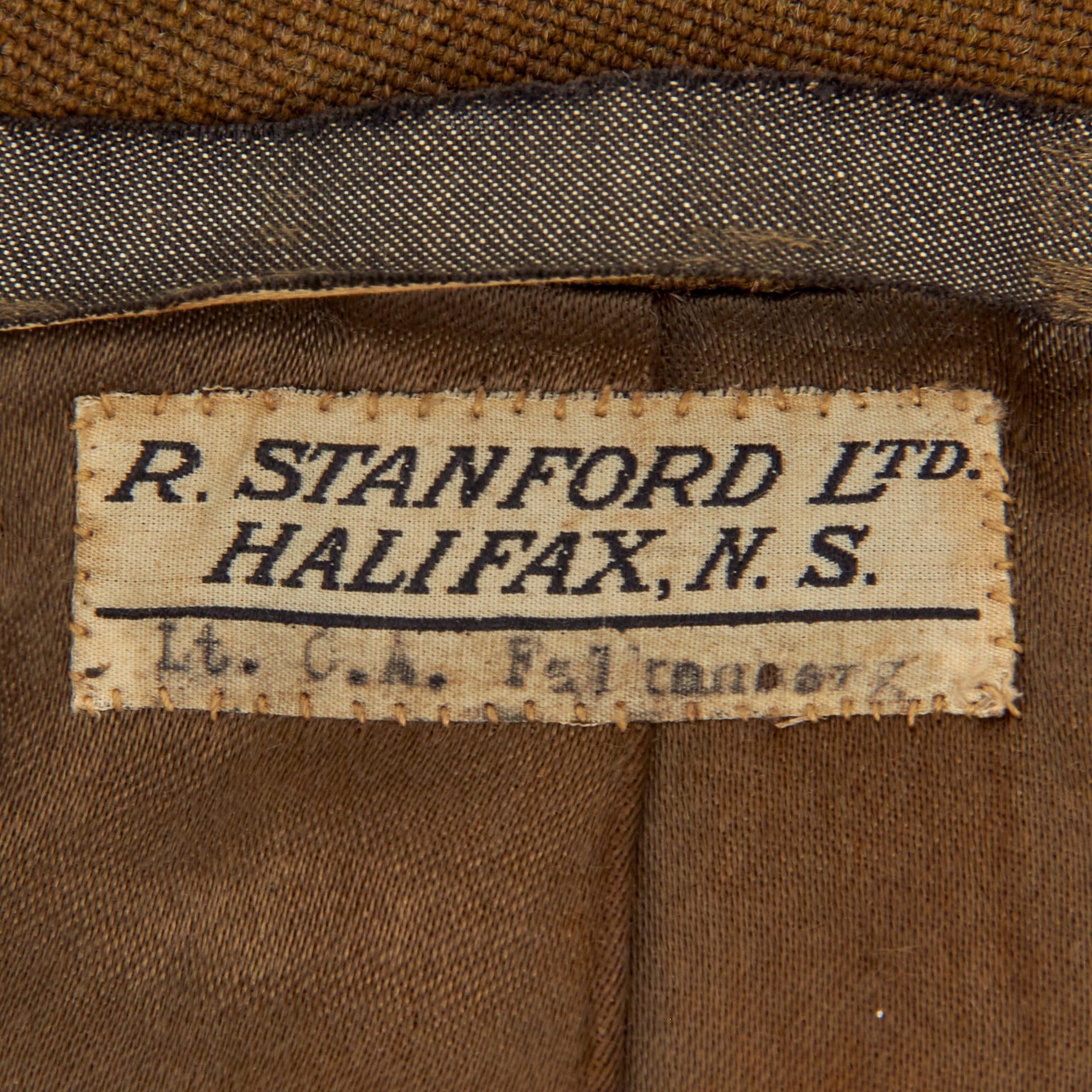 The uniform set consists of a jacket, breeches and overseas cap, all offered in wonderful condition. The coat is named to a LT C.A. FAL***** with the last part of his name unfortunately unable to be read. The coat was manufactured by R.STANFORD LTD / HALIFAX, N.S. meaning he could have been a Canadian pilot. The two rank pips on the shoulder straps indicate the rank of Lieutenant. All leather buttons are present and in good condition. The RFC collar devices are tarnished but still present. The left breast features a beautiful set of embroidered RFC wings just above a ribbon bar. The ribbon bar has not been retained very well, with a lot of material loss present.