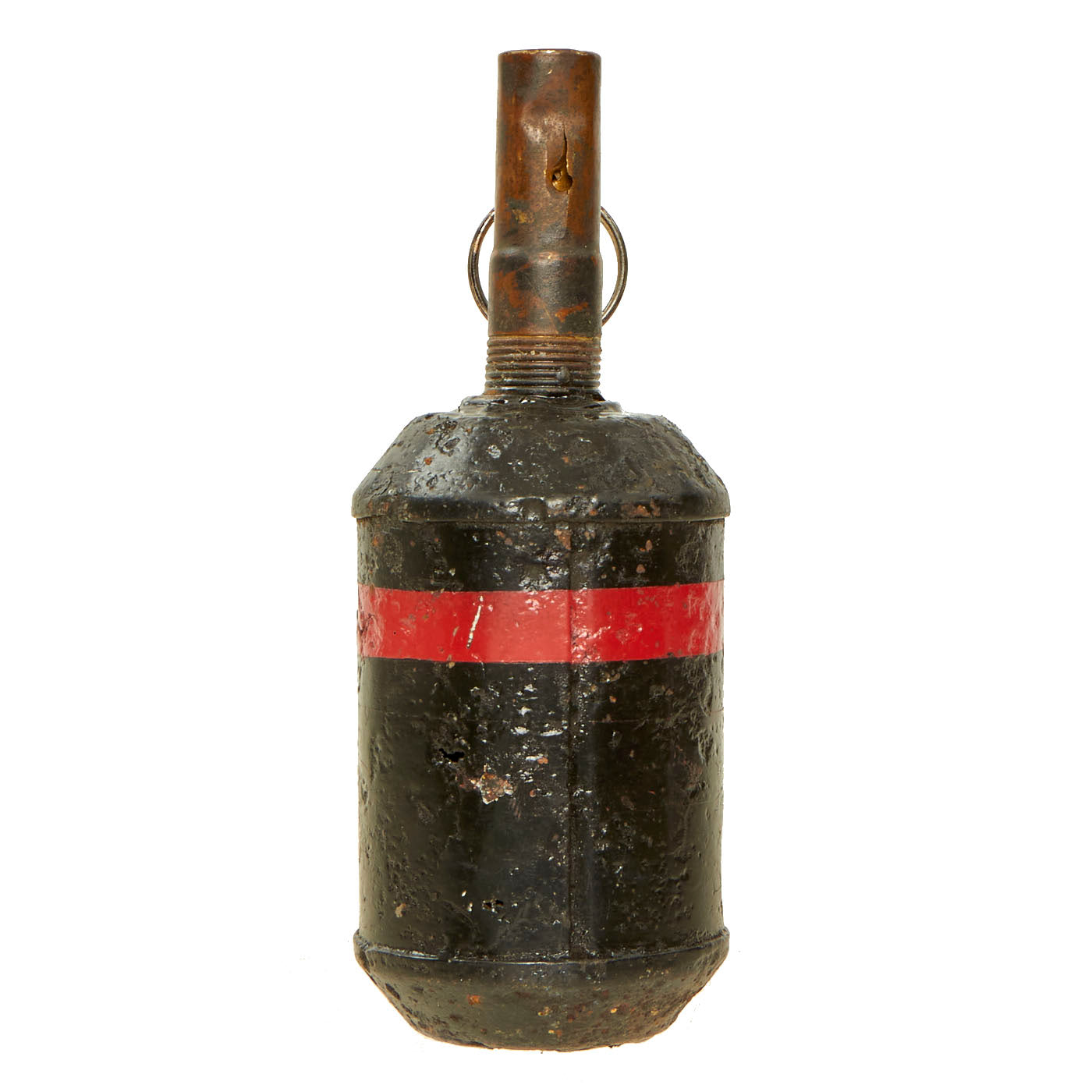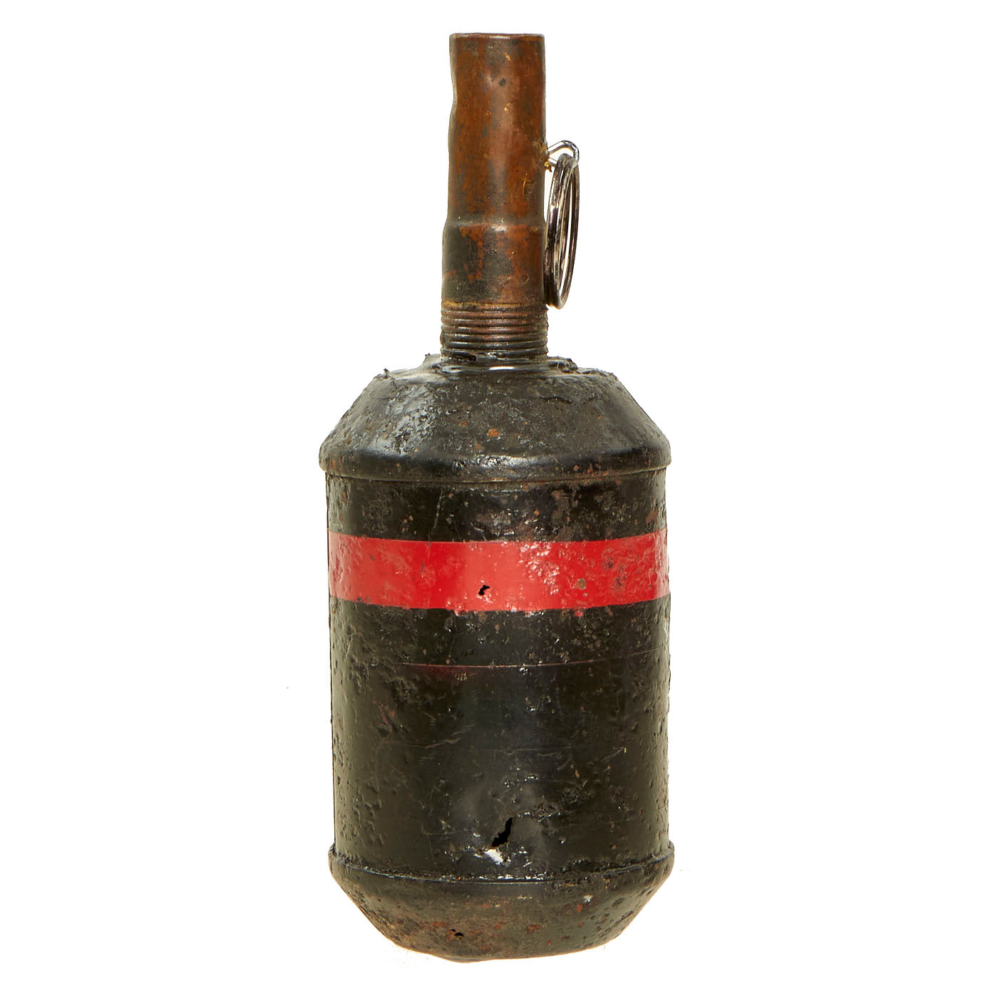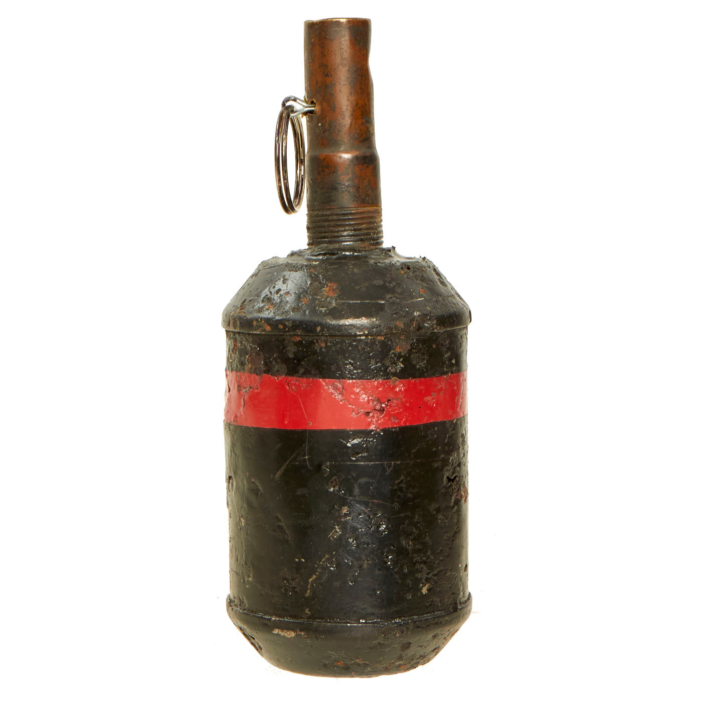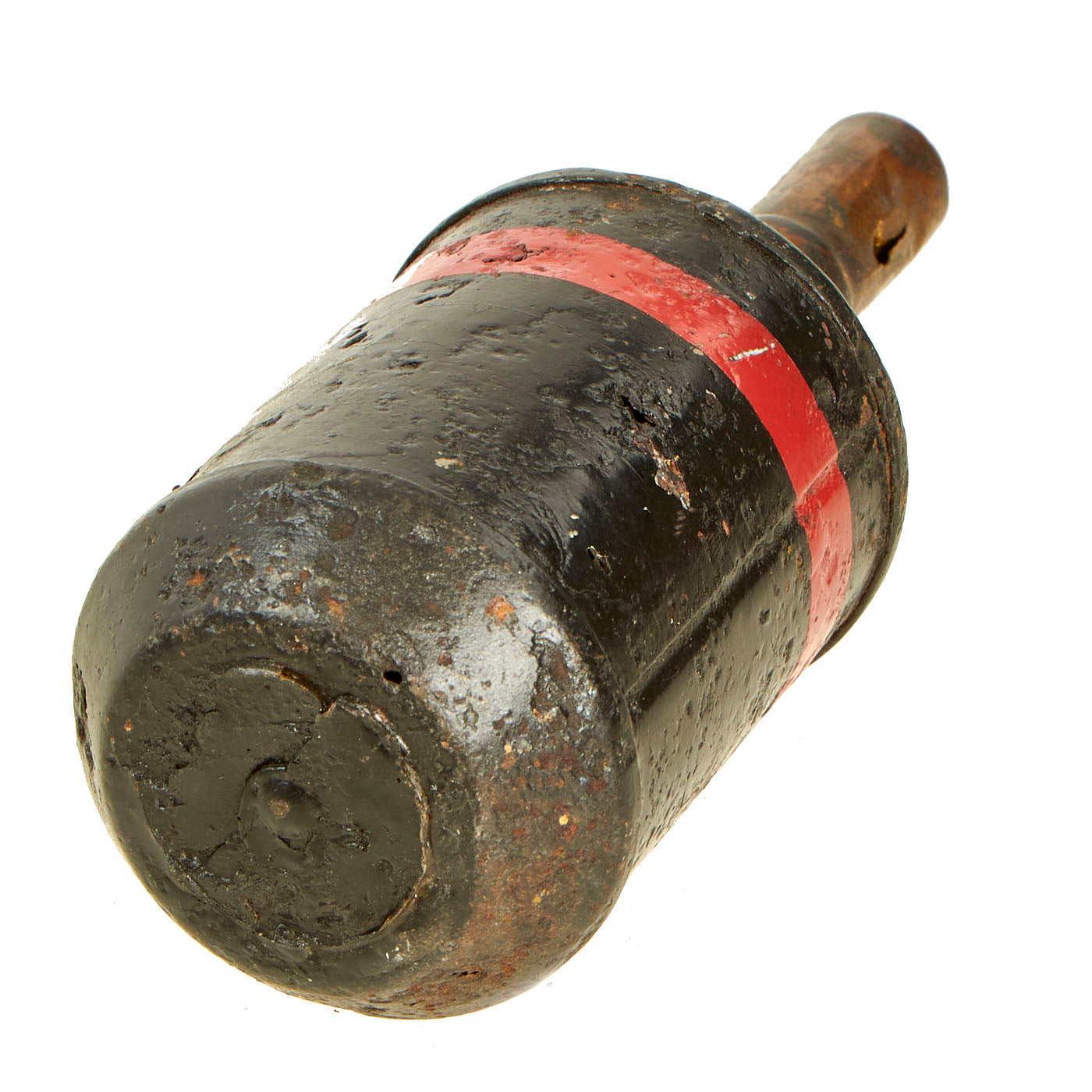 The condition of this example reflects one that has been dug up from a distant battlefield after being buried for many years. The body was cleaned up and repainted for display purposes and is the correct all black body with red band around the top. There is old pitting present and oxidation, all signs of having been ground dug. The body itself is still solid with minor holes present from rust damage, but nothing that subtracts from the beauty of it.