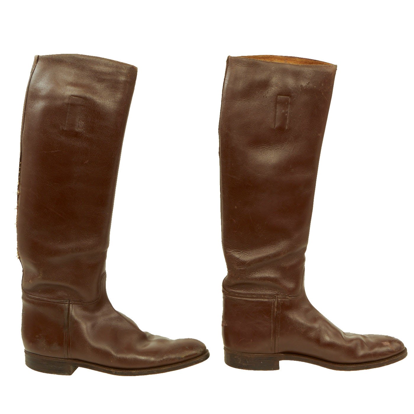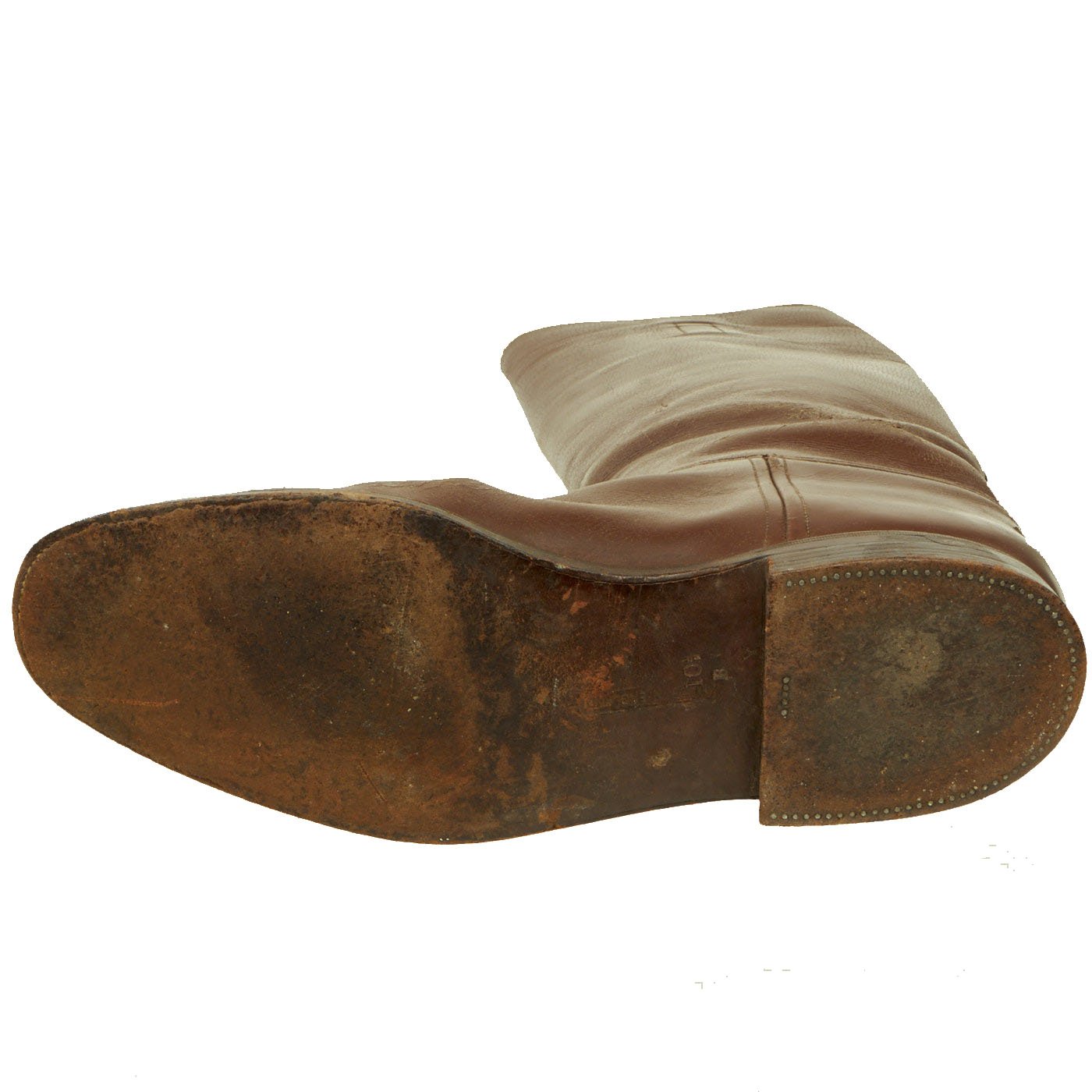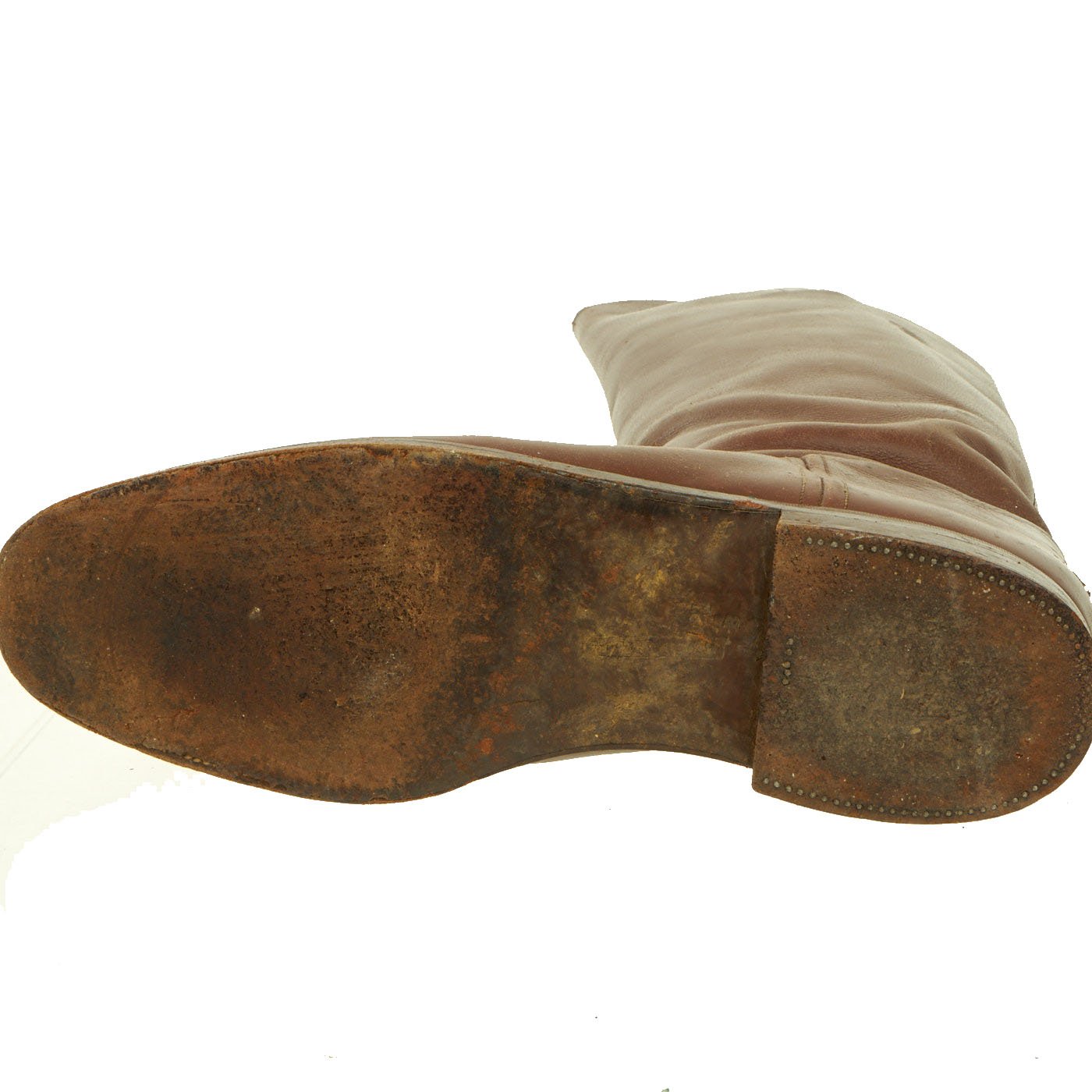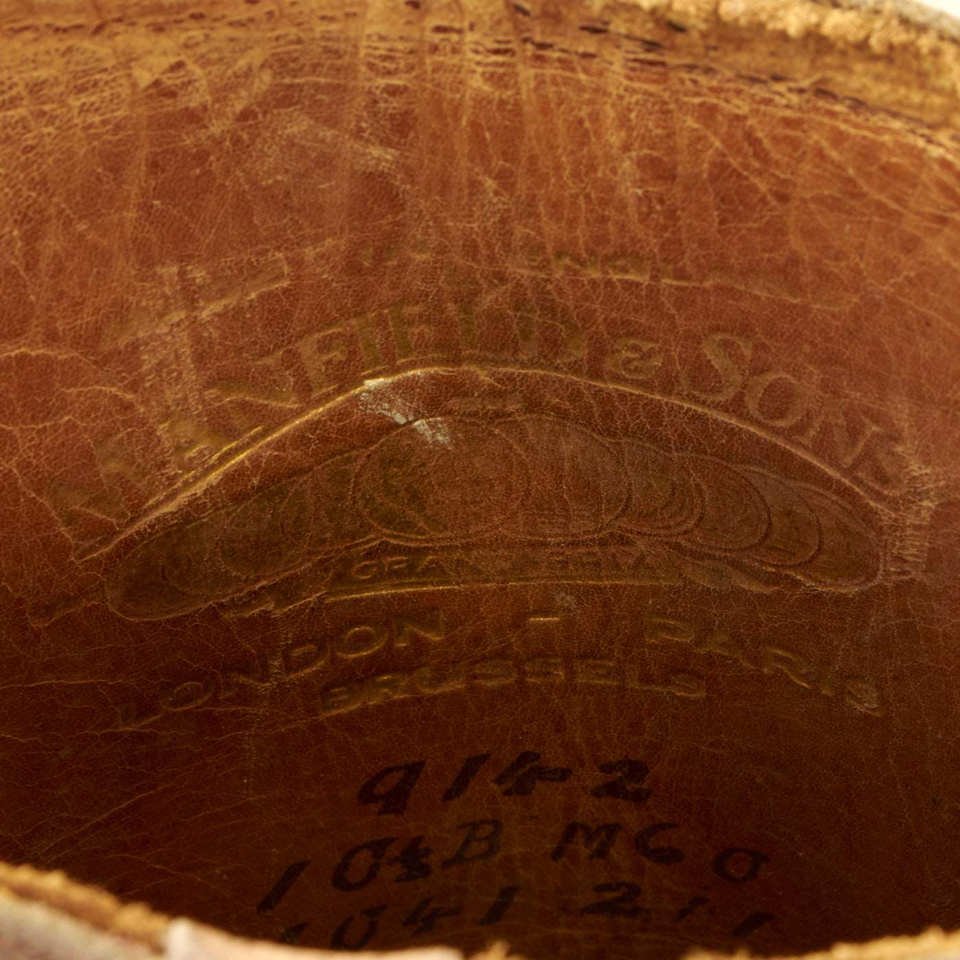 Original Items: Only One Set Available. This is a fine pair of World War One vintage high quality knee high boots in brown leather in size 10 1/2 UK manufactured by MANFIELD & SONS of LONDON - PARIS and BRUSSELS. The makers logo is embossed on the inside of both boots, and was originally gold, but that has mostly faded. There are further specifications written below the maker mark in ink.