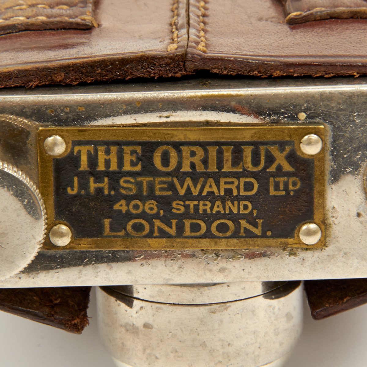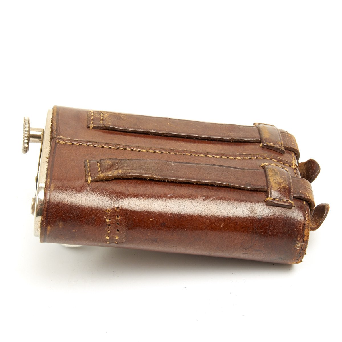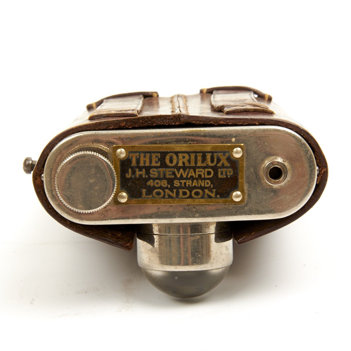 Not currently operational, the flashlight features a a large "Fish Eye" lens and was beautifully made of nickel plated steel and contained in it custom fitted brown leather case with belt loops to rear to be worn on a Officer's Sam Browne Belt. Remains of the Owner's name ink can be found on the exterior bottom of the leather casing but requires heavy magnification to read.