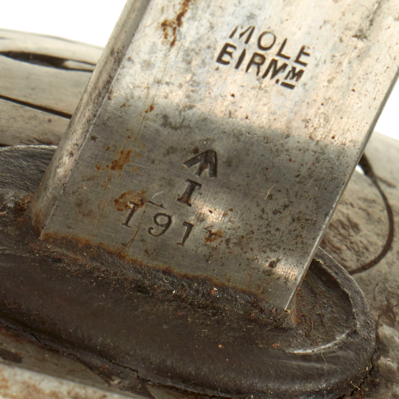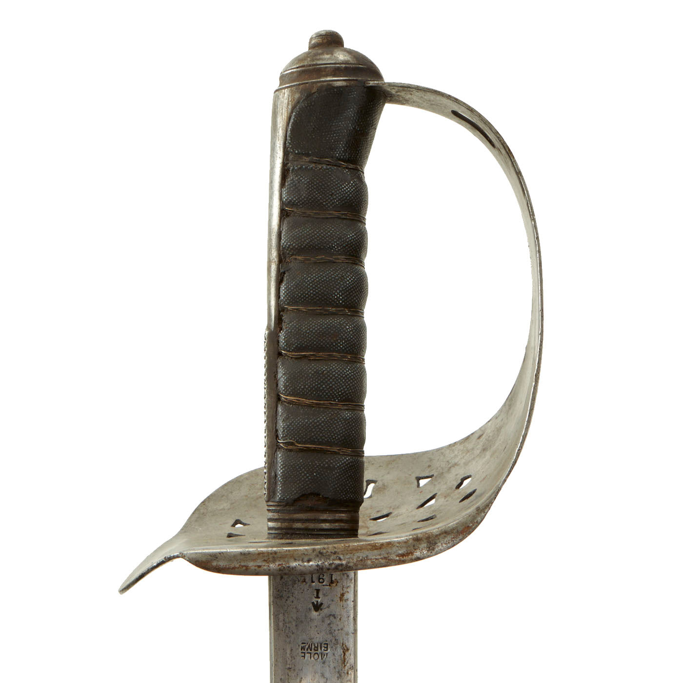 Original Item: Only One Available. Imported from the Kingdom of Nepal in 2003, this is an original British manufactured and issued Pattern 1898 Infantry Sword sword in the original leather clad field scabbard. It is dated 1917 on the blade ricasso, and also stamped 4.18 under the guard, indicating issue in April 1918. There are also inspection stamps with broad with marking on the ricasso. The bade is maker marked MOLE / BIRMm indicating that the sword was made by the firm of Robert Mole in Birmingham.