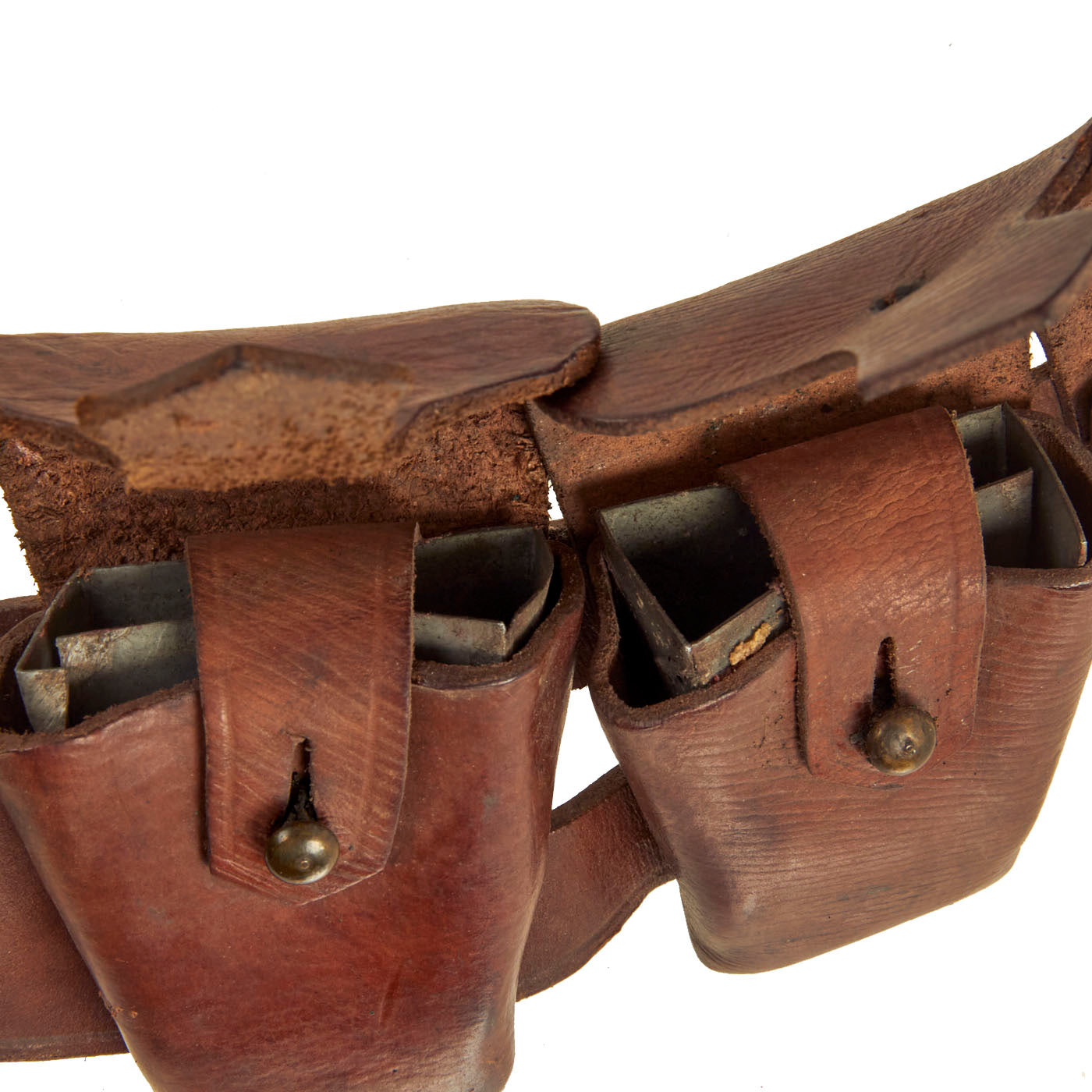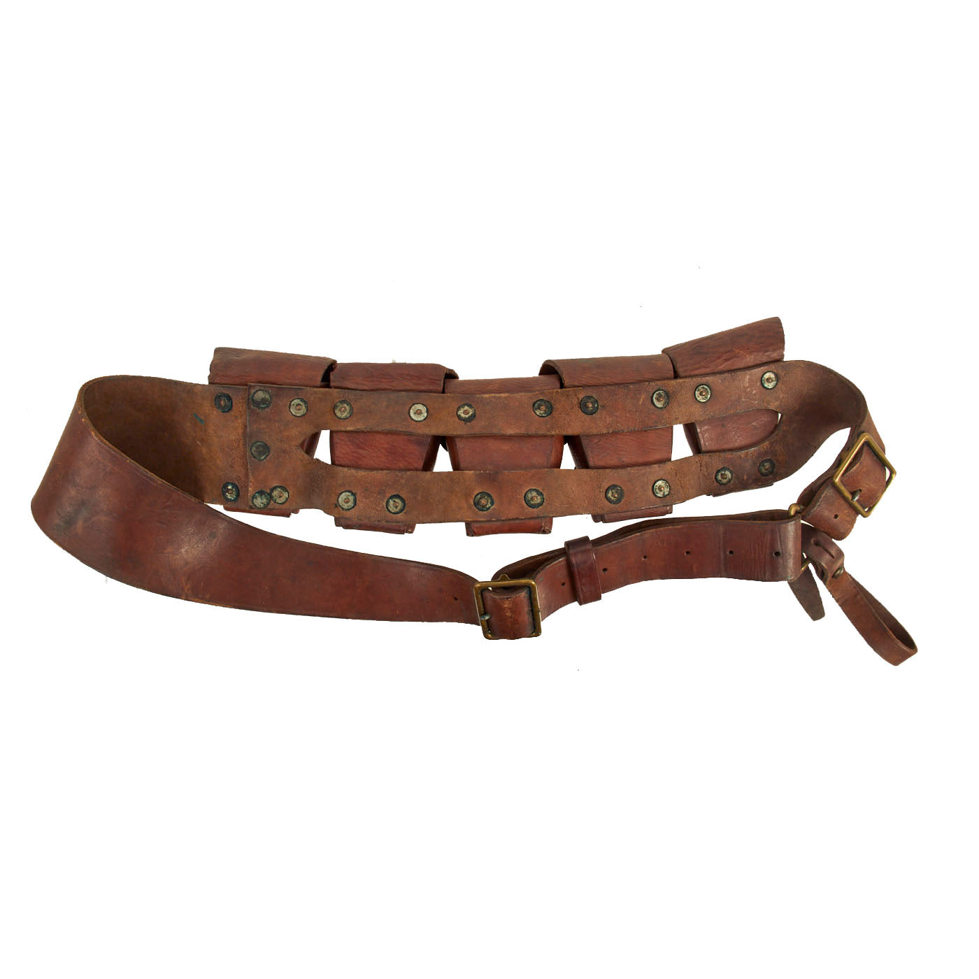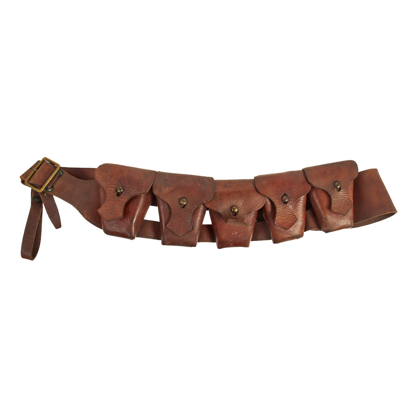 Original Item: Only One available. Designated "Bandoliers for Mounted Cavalry P-1903" this is a brown leather bandolier with five leather pockets, each designed to carry two 5 round stripper clips of .303 cal. Ammunition. Though developed a decade before The Great War, they saw much use during the conflict, and were in use after as well.