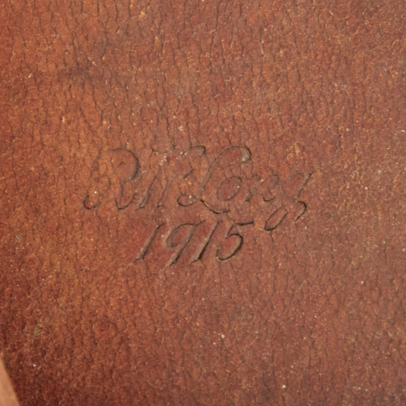 The right side is stamped with R H Long / 1915, for Richard Henry Long Shoe Manufacturing Company in Massachusetts. Yes, this is an American manufacturer, however, RH Long produced leather goods for the British Government during The Great War. The leather is worn, and has faded to a wonderful russet color, but has very little cracking. The inner securing straps are all still present and all brass studs are present.
