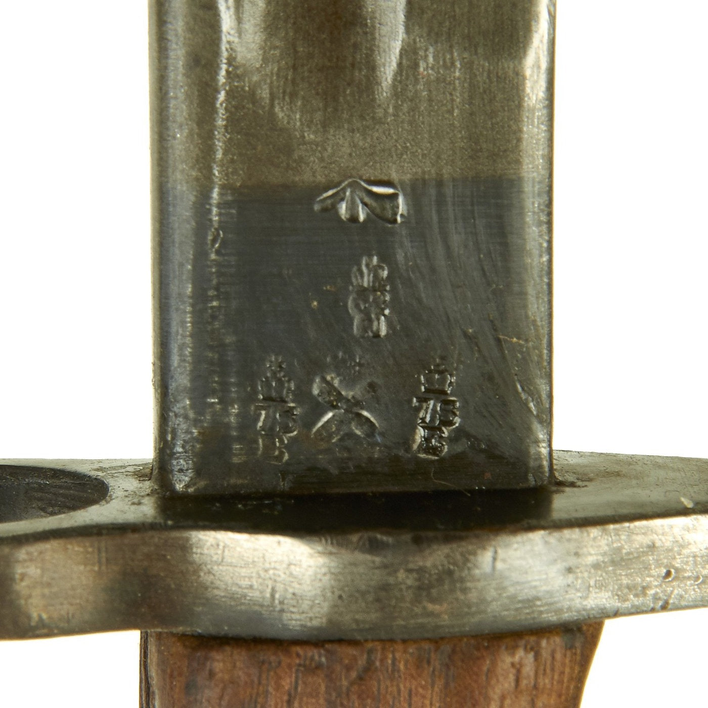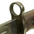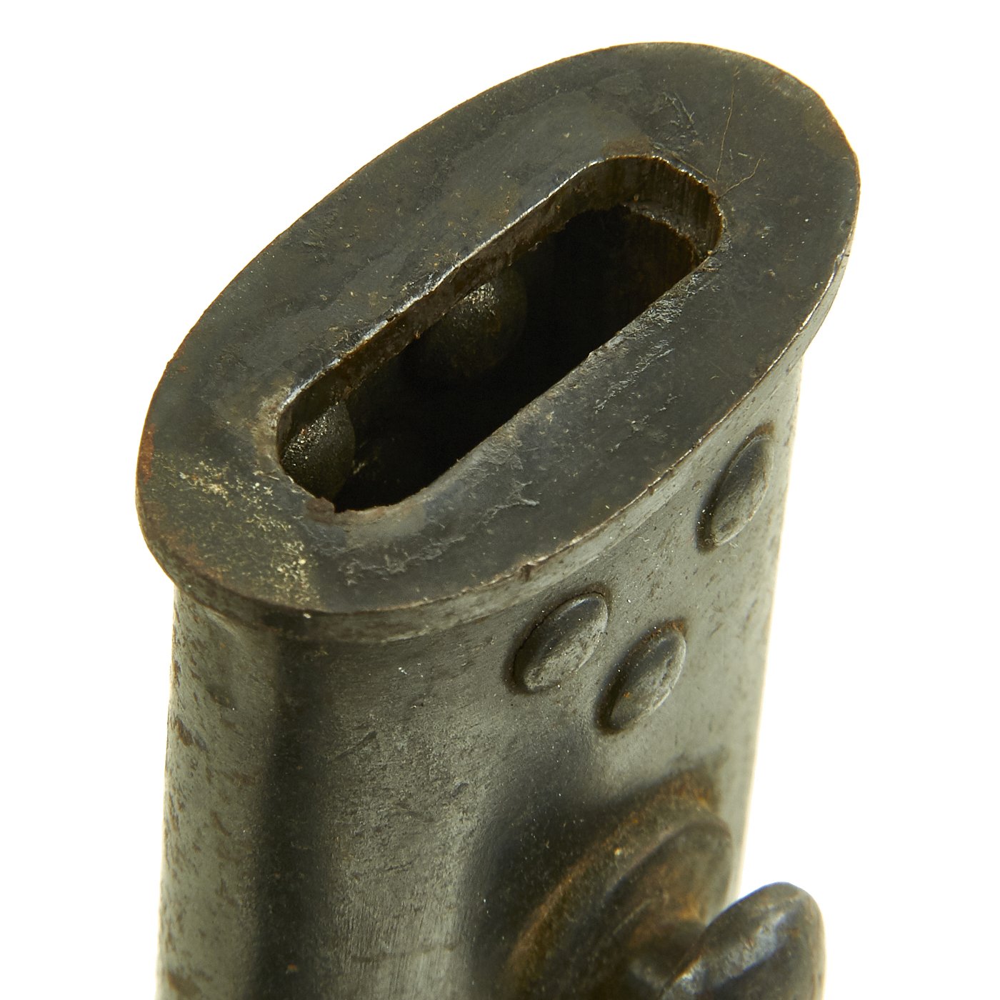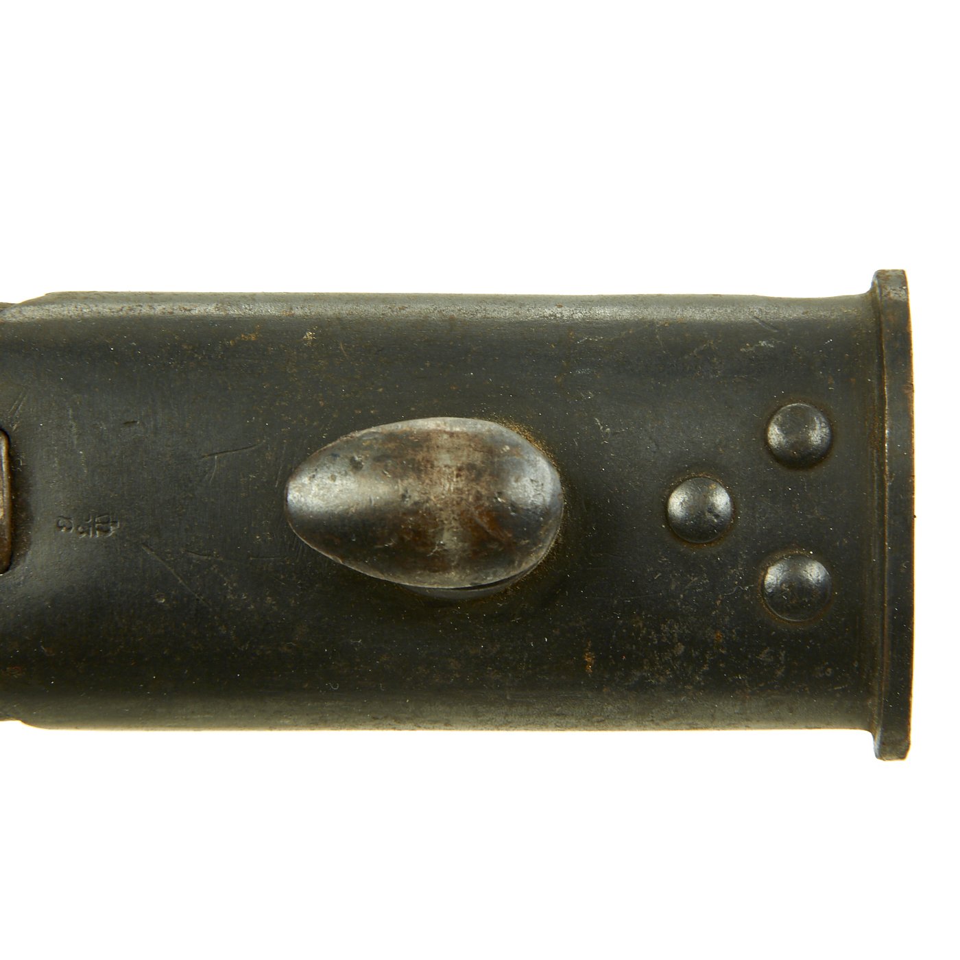 The bayonet comes with its correct No. I Mk. II Scabbard, with steel fittings and the correct "lozenge" style frog stud. It has the correct three rivets to attach the throat springs, and has an inspection stamp on the stud side of the throat.