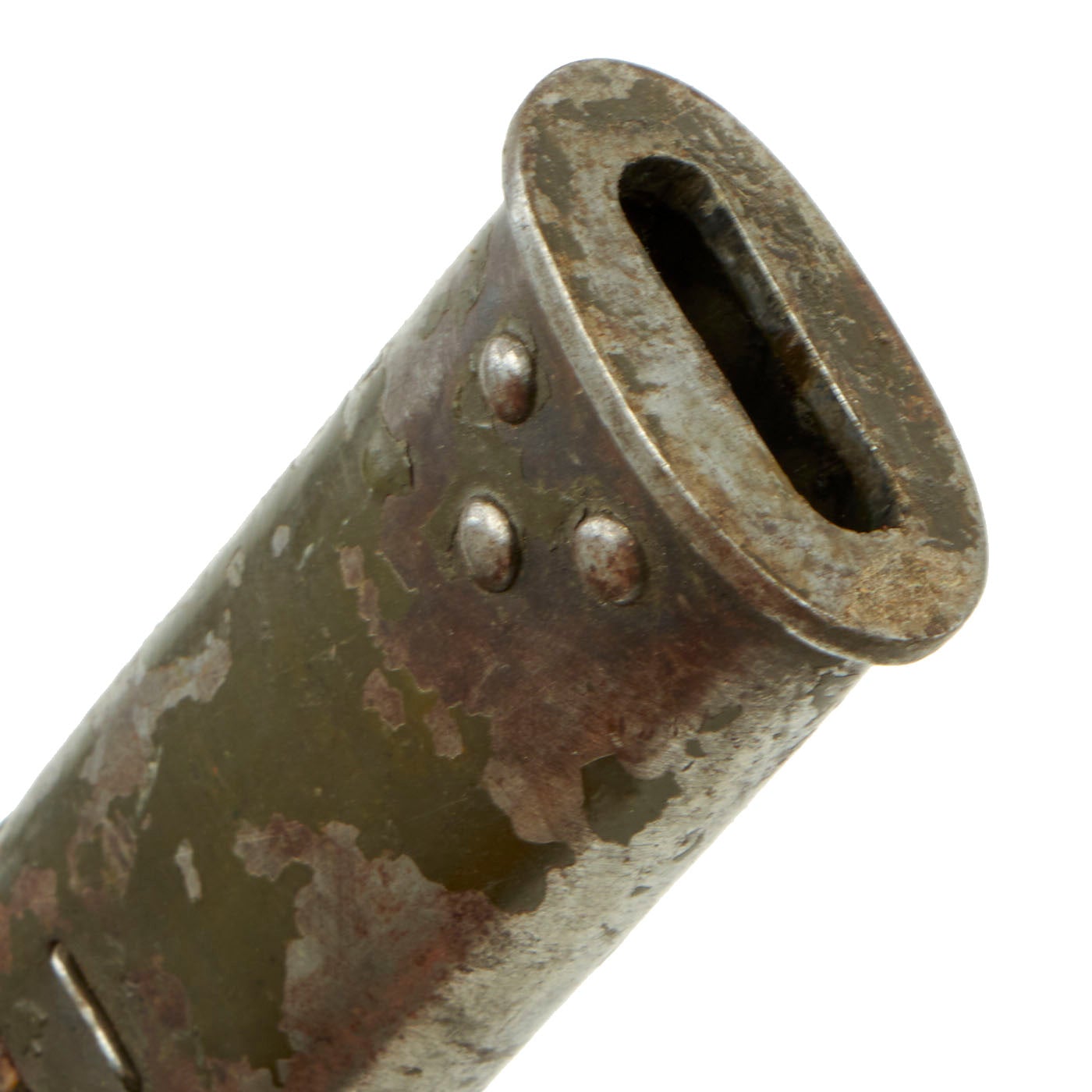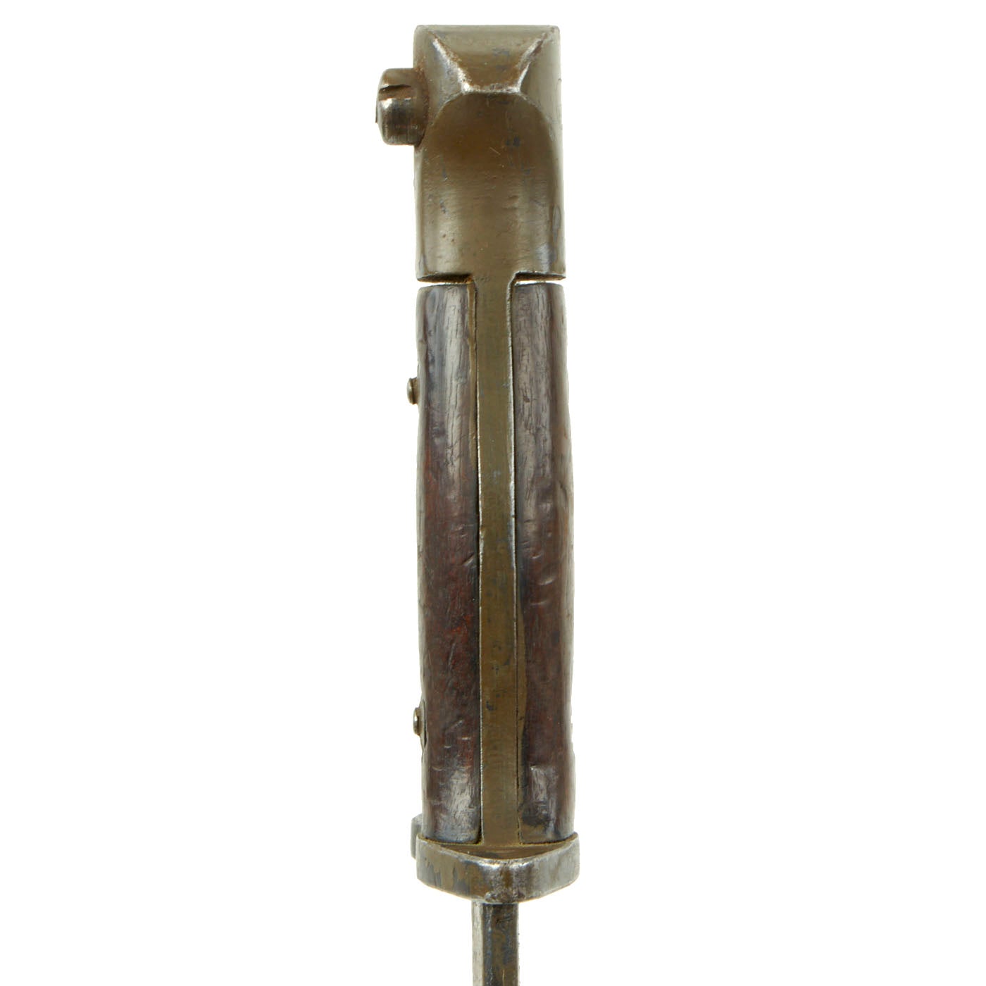 The bayonet comes with its correct No. I Mk. II Scabbard, with steel fittings and the correct "lozenge" style frog stud. It has the correct three rivets to attach the throat springs, and was painted green at one point, commonly done when bayonets were reissued for WWII