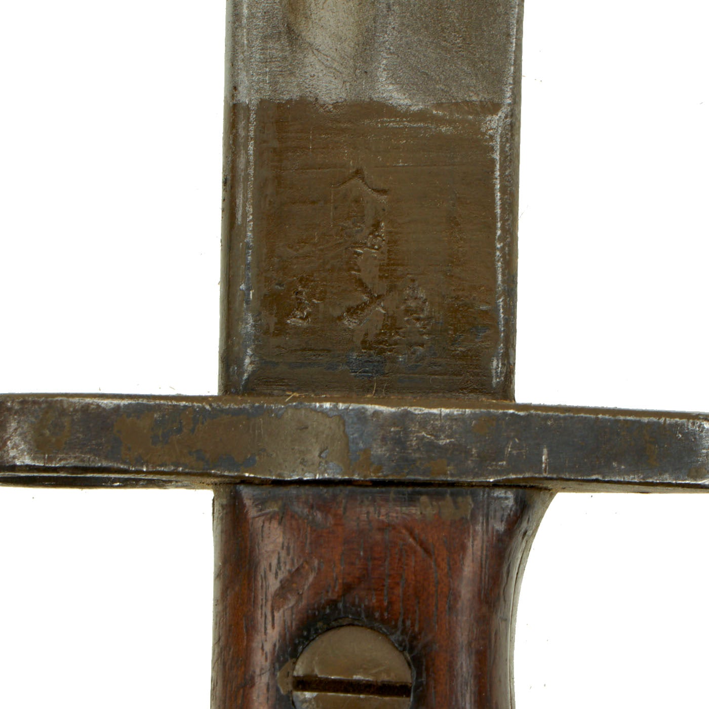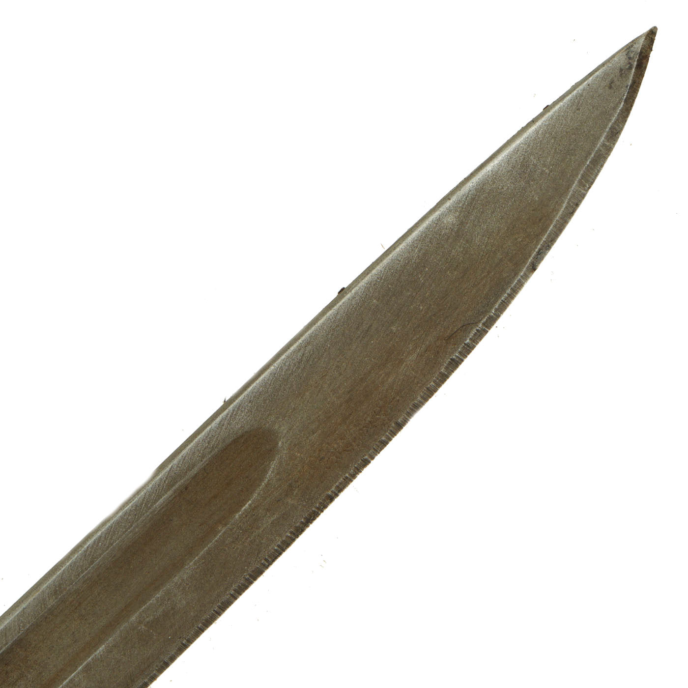 In it's original form, the P-1907 had a hooked guard (quillon), which was then removed from the pattern in early WWI due to the questionable use and increased production time. Unlike the 1903, the 1907 had a single edged blade that was less wide, but made of thicker stock.