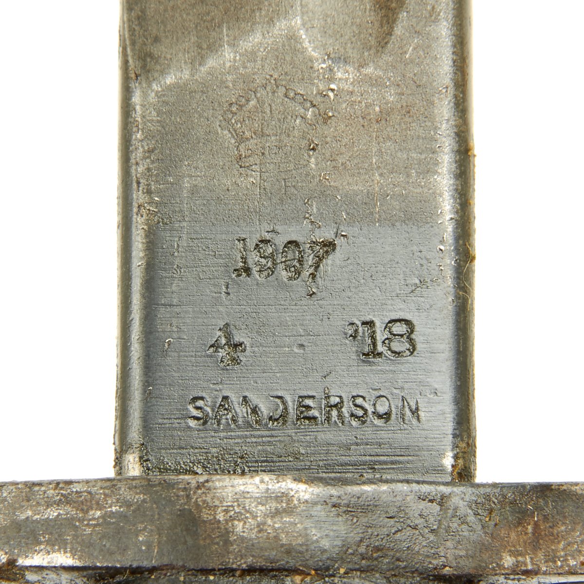 The bayonets we offer here were all WW1 era production made by SANDERSON for the British Army, and are marked as so on the blade ricasso. Direct from long term storage these are in very good condition with all original their original markings and dates. Each comes complete with correct WW1 steel mounted leather Scabbard with oval frog stud.
