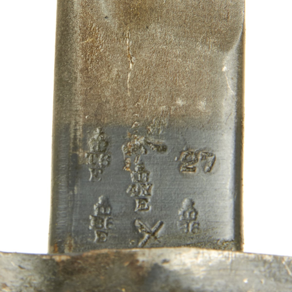 In it's original form, the P-1907 had a hooked guard (quillon), which was then removed from the pattern in early WWI due to the questionable use and increased production time. Unlike the 1903, the 1907 had a single edged blade that was less wide, but made of thicker stock.