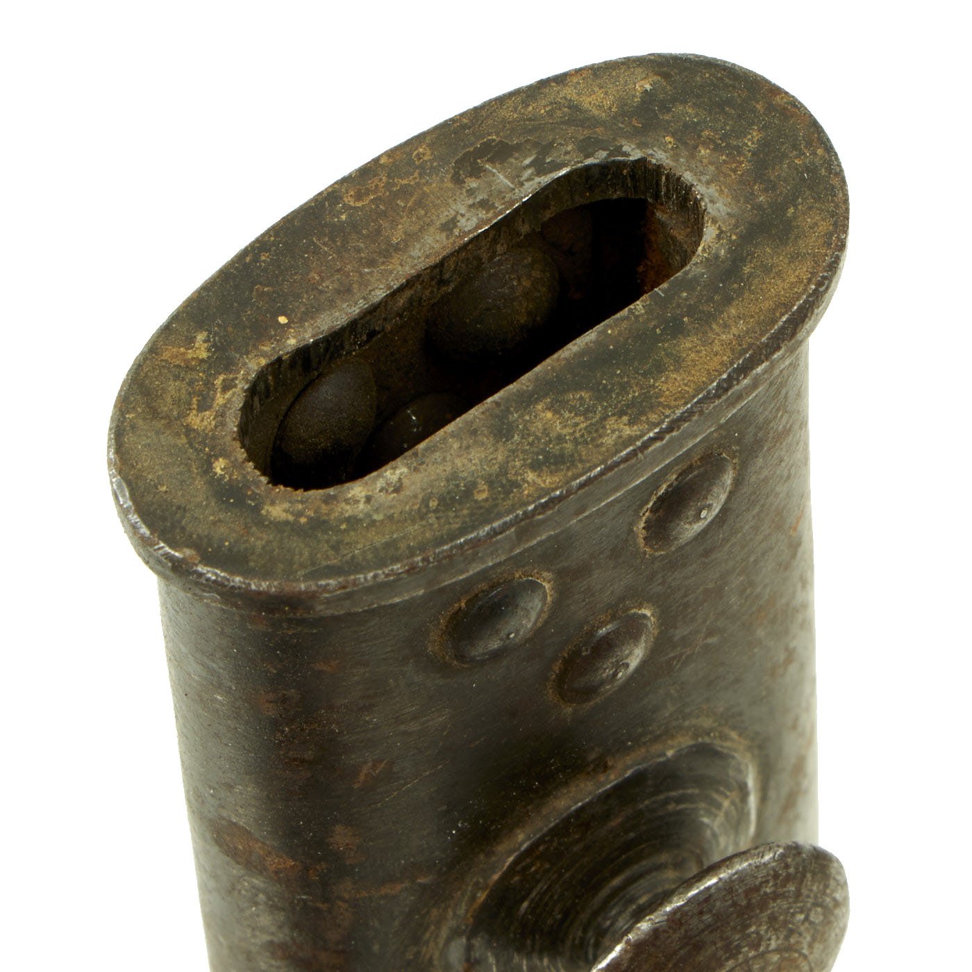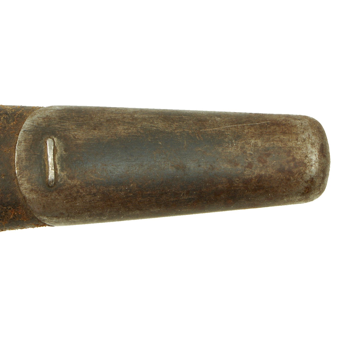 The blade ricasso is marked 1913 / 5 17 on the blade ricasso over the round REMINGTON logo, and has various inspection markings on the reverse ricasso. Condition is very good, with a good amount of the original finish on the blade and handle, though the pommel is worn bright. There also appear to be Egyptian markings stamped into the metal. There is no major corrosion that we can see, just some areas of staining, and the original machine marks are visible on the blade.