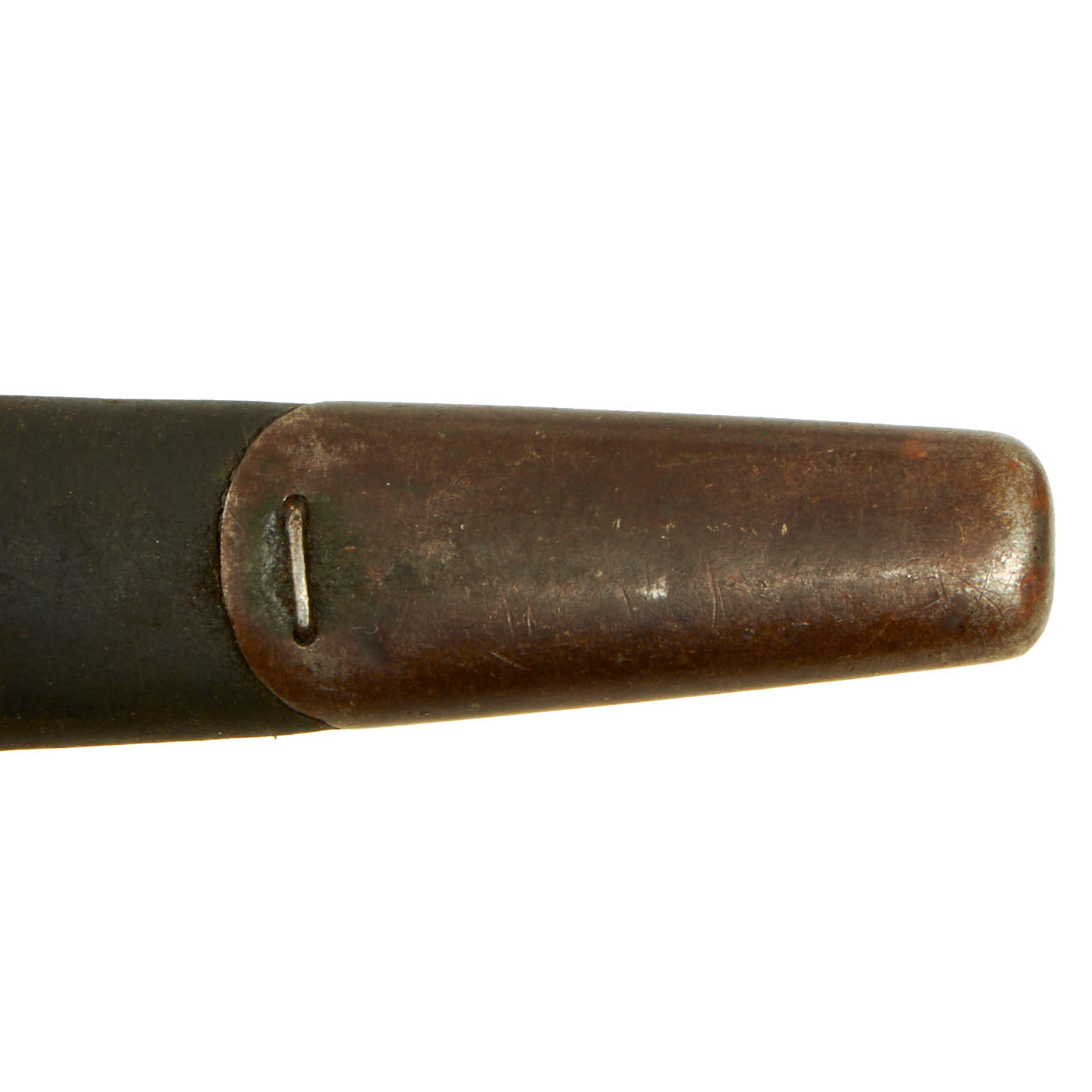 The blade ricasso is marked 1913 / 1 16 on the blade ricasso over the round REMINGTON logo, and has various British Acceptance markings on the reverse ricasso. Condition is very good, with the expected wear to the handle and blade. There is no major damage or rust that we can see. The scabbard is also in good shape, with intact leather, and most of the original green paint on the fittings. This could have been used by an American during the war, but the personal history has been lost to time. This is NOT an American overstamp, it still retains all British proof marks.