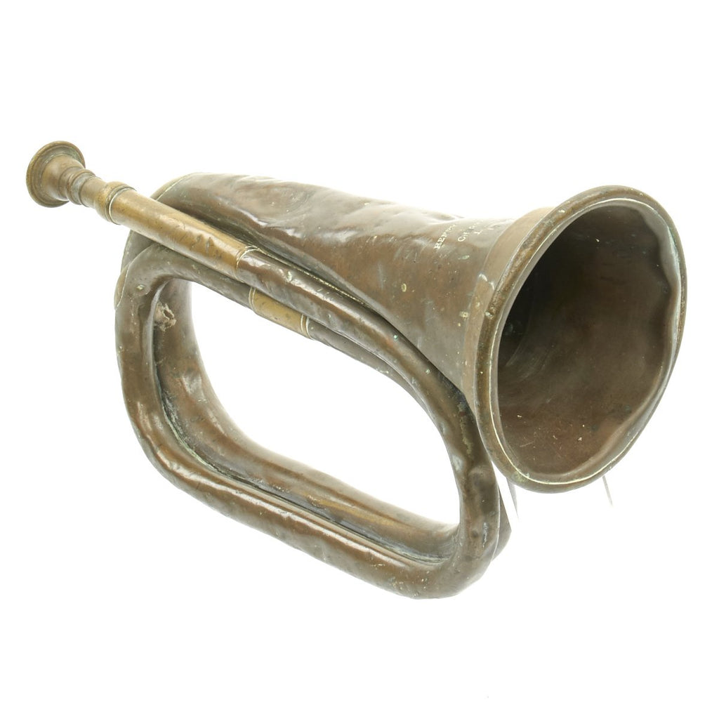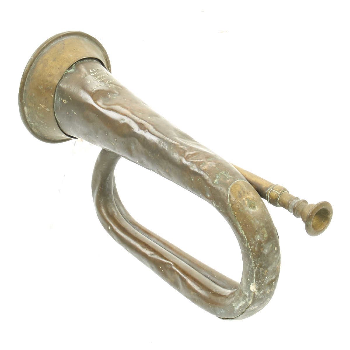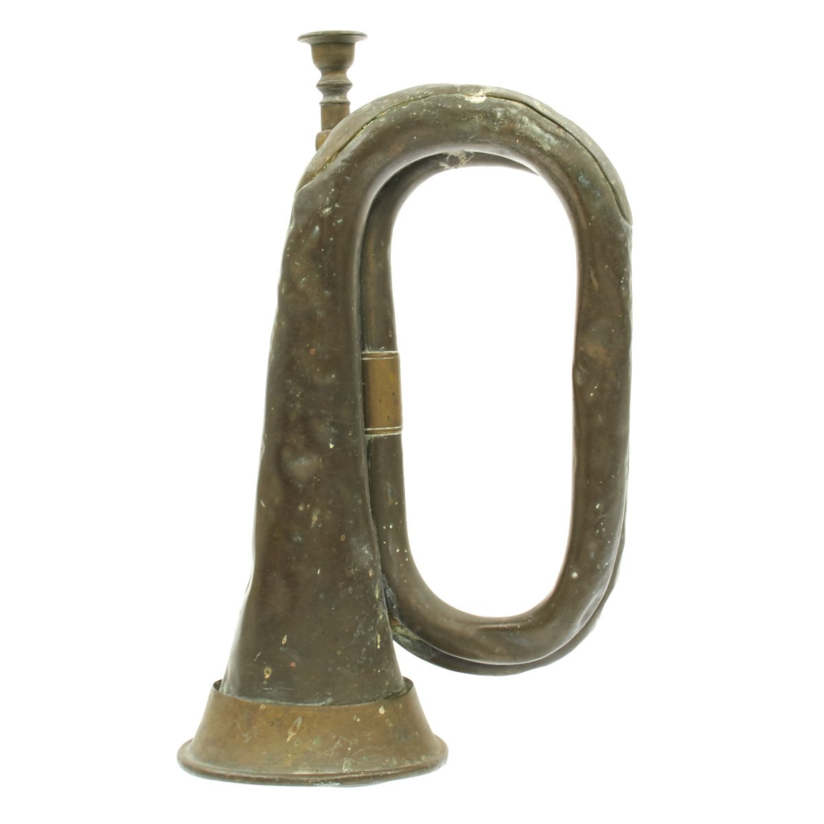 This Bugle, which is totally authentic, has lain in an attic for probably 75 years, and has the expected dings and dents from field use. The mouthpiece is present but seized in the receiver, and the cord ring has broken off. Still, it does ring clearly when blown. According to the family this was brought back from the trenches during that awful conflict of WWI.