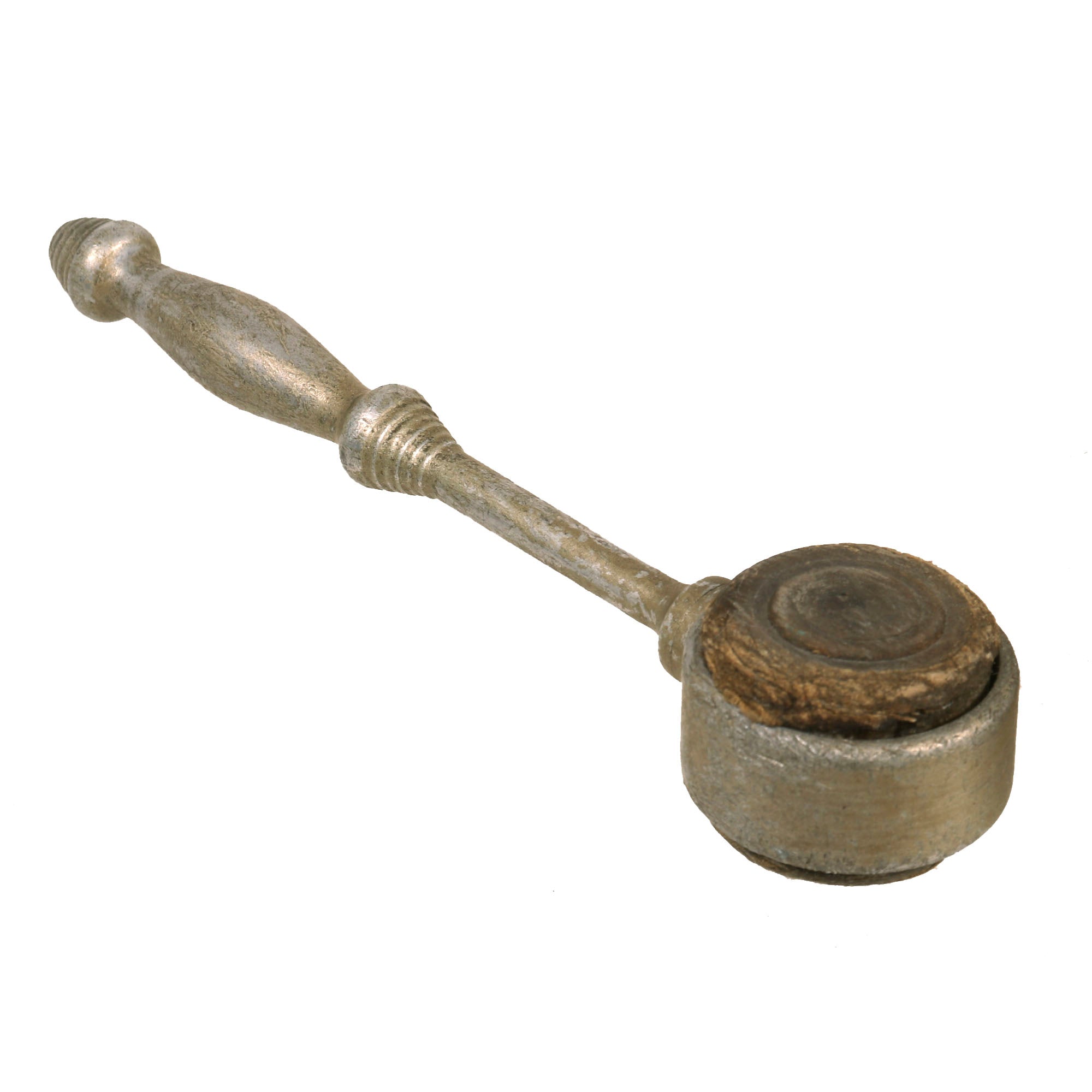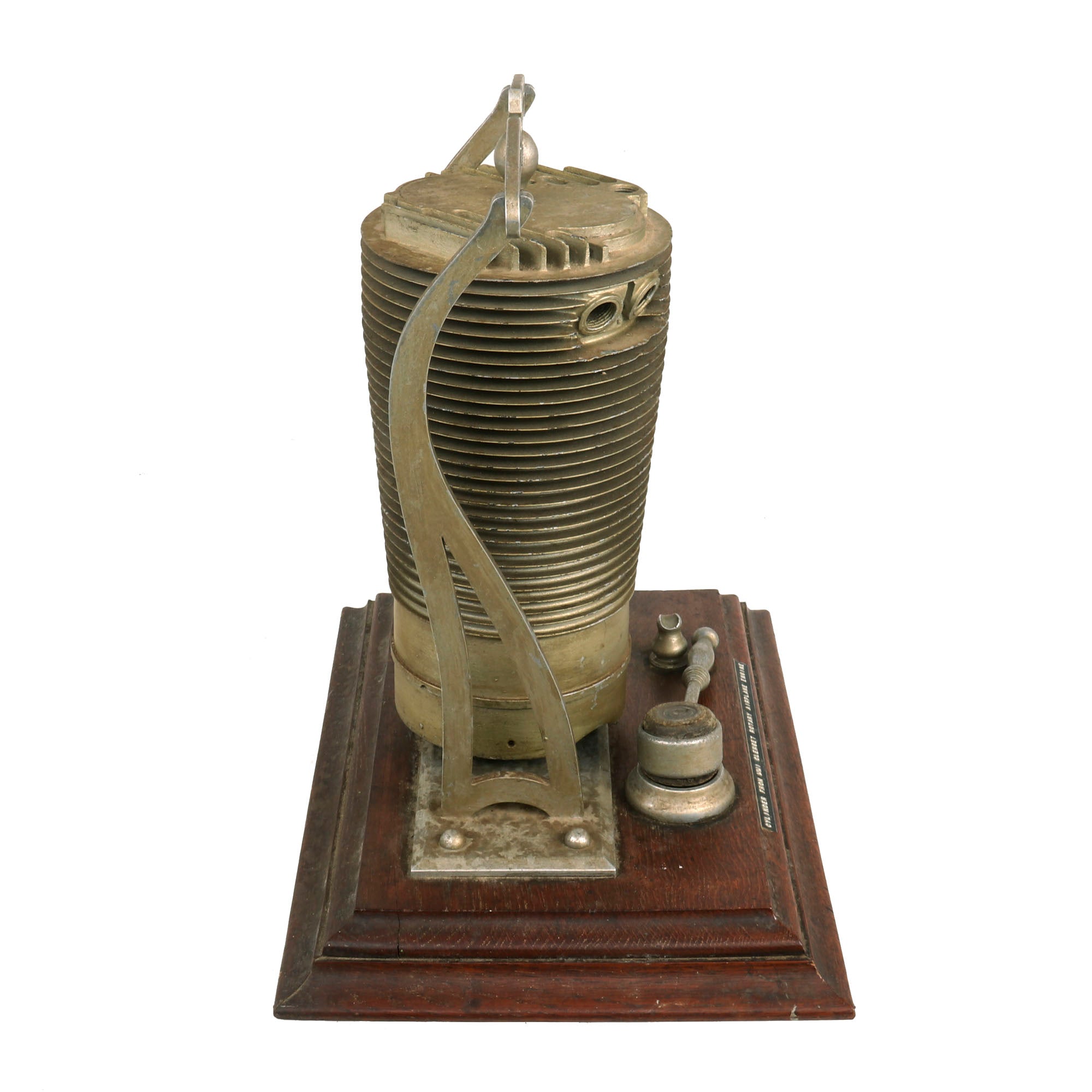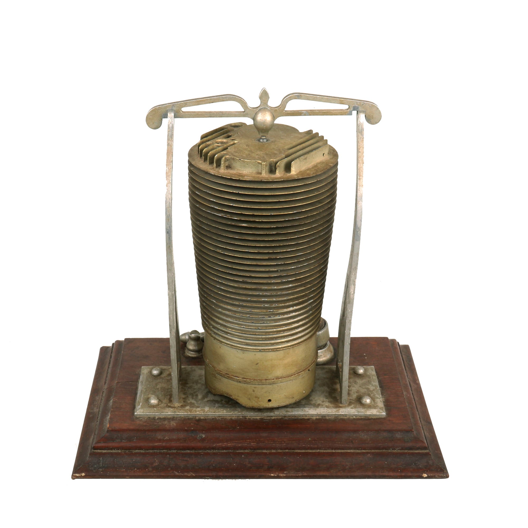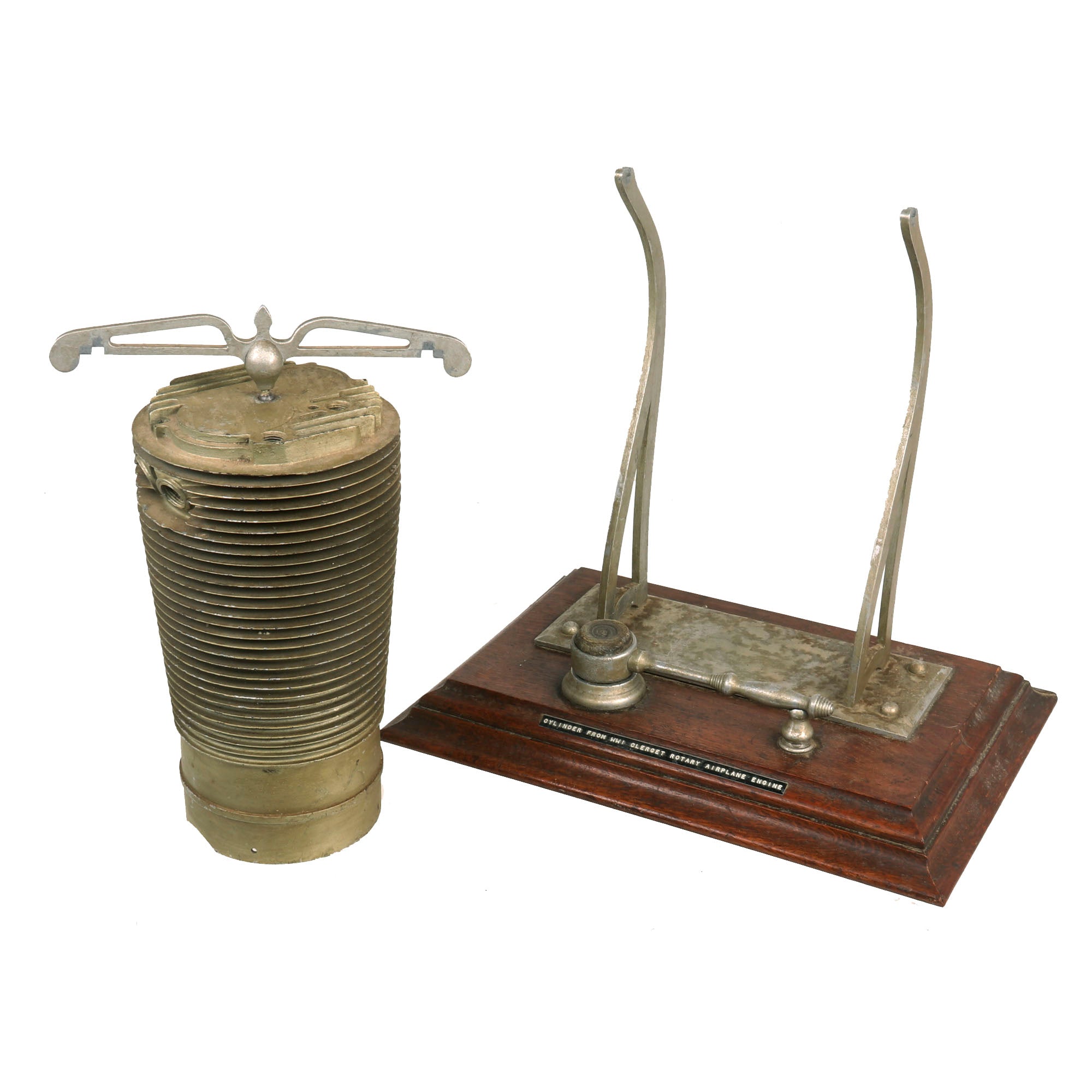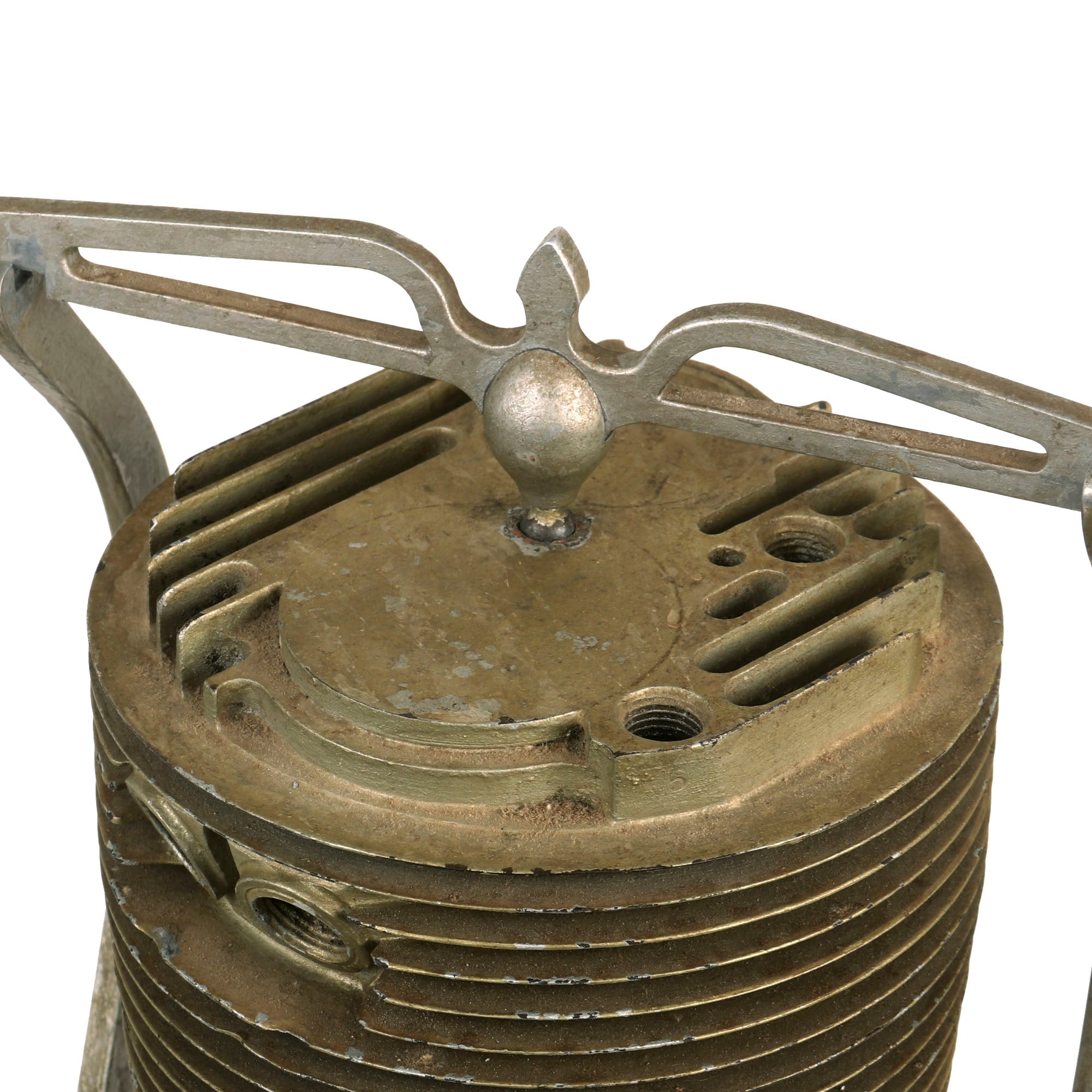 The Clerget 9B was one of several engines used on the Sopwith camel, and we have confirmed with period photographs that this is definitely from a 9B. The gong is mounted on an aluminum stand attached to a 16" x 11" wooden base, and altogether the gong is about 16" tall and weighs 17 lbs.