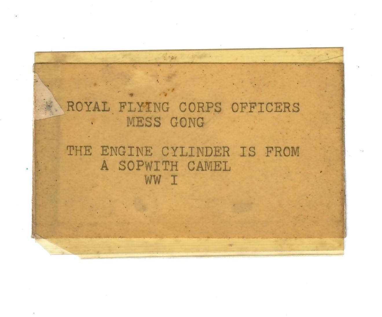 Original Items: One-of-a-kind. This is a wonderful pair of items for the Royal Flying Corps (RFC), the predecessor of the Royal Air Force (RAF). This is a fantastic British WWI Dinner Gong with a stand and beater, made from one of the cylinders off of a Sopwith Camel, one of the best known aircraft of WWI. It was very common in the British Military items to be repurposed as adornments for regimental museums, clerical offices, and of course, the officer's mess. This came to us with an original tag in old plastic wrapping, which describes the piece: