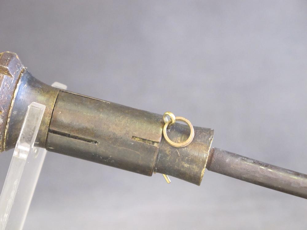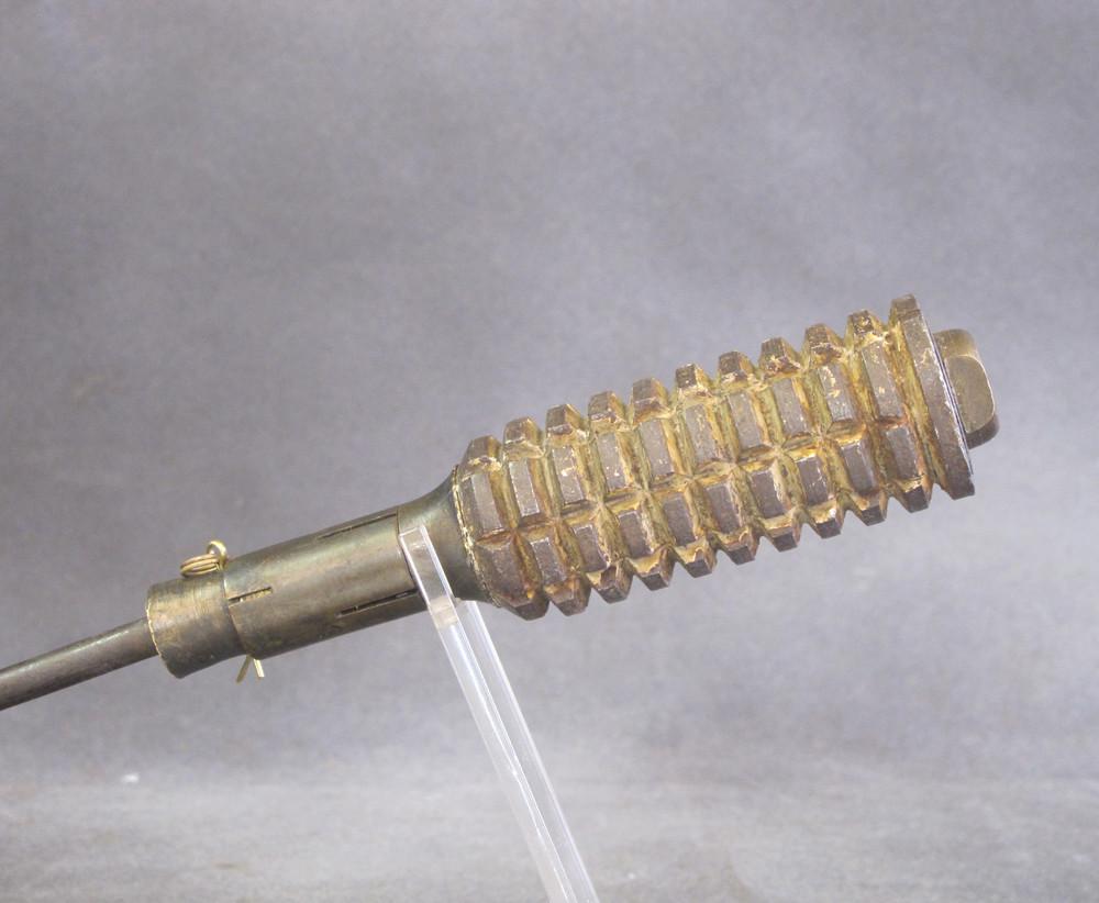 The rifle grenade n°20 Mk I, dated June 1917, is a simplification of the rifle grenade n°3, making it more economic and simple to manufacture, without scarifying anything on the safety side. Both the externally pre-fragmented steel body and the internal percussion detonator mechanism remain unchanged, but the safety wind vane is replaced by a simple sliding releasing socket pulled back by the departure momentum, blocked at rest by a safety pin.