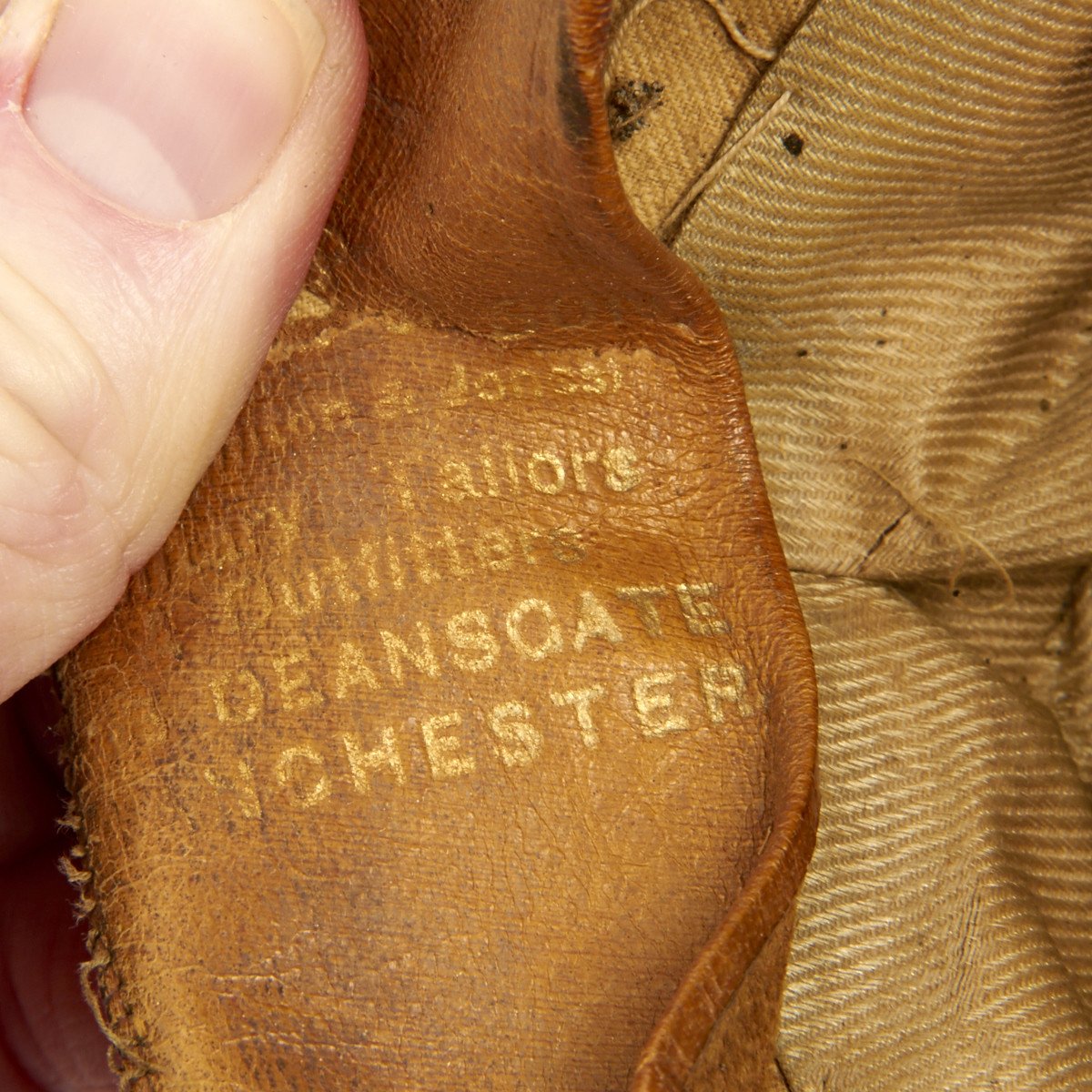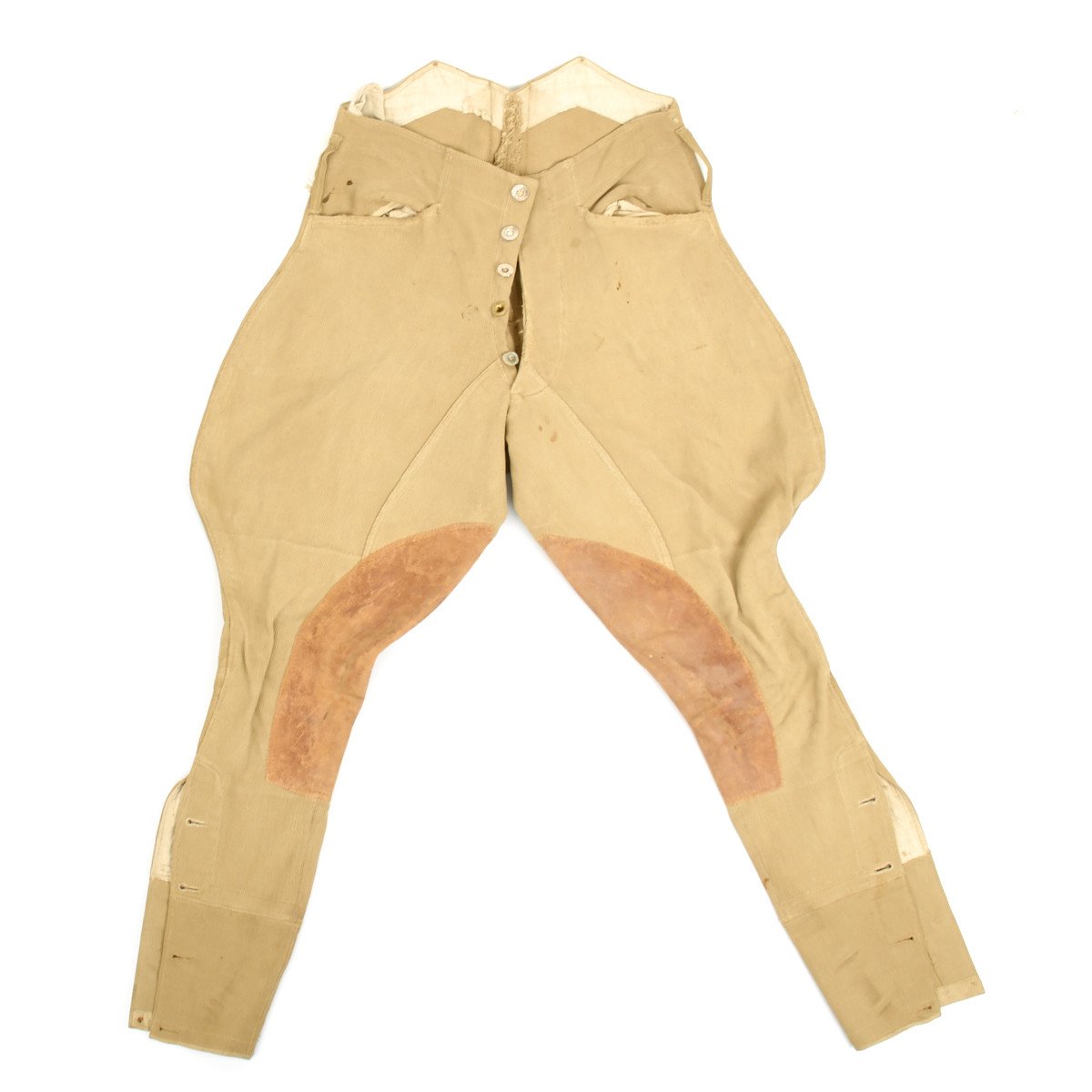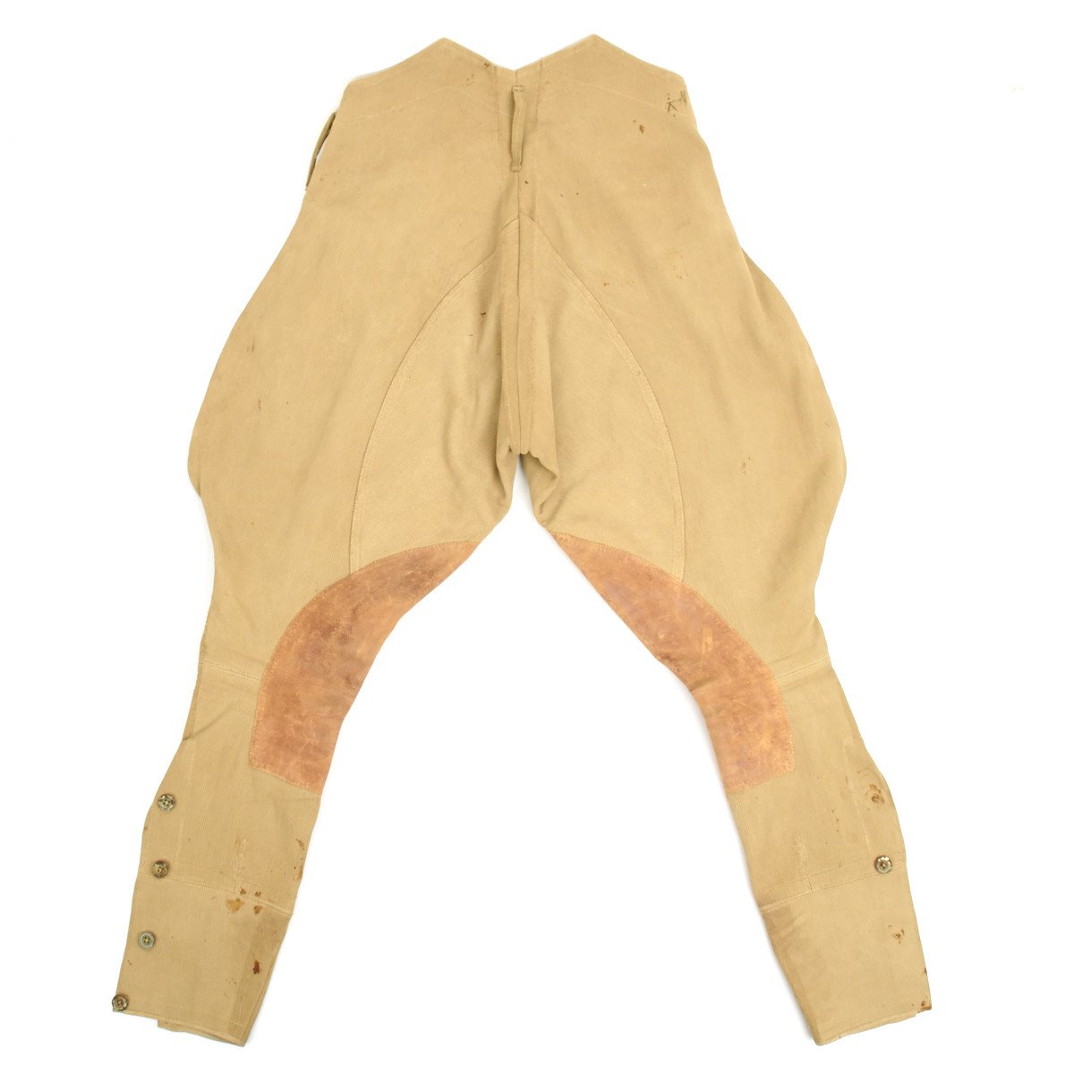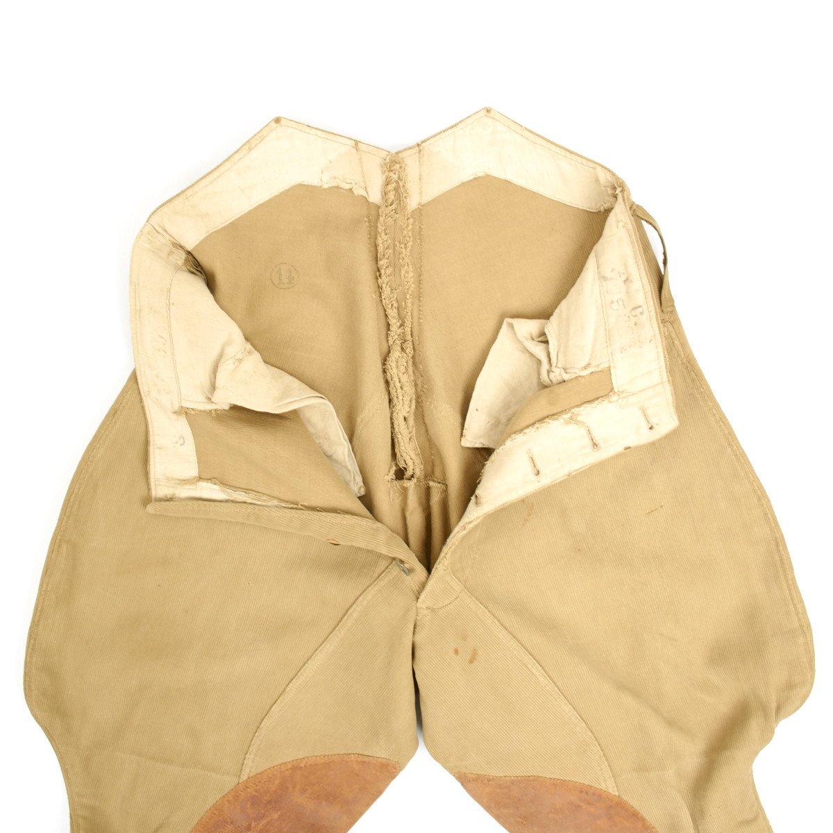Wonderful leather padded jodhpurs or riding pants with correct buttons nicely ink stamped in multiple places on the interior.