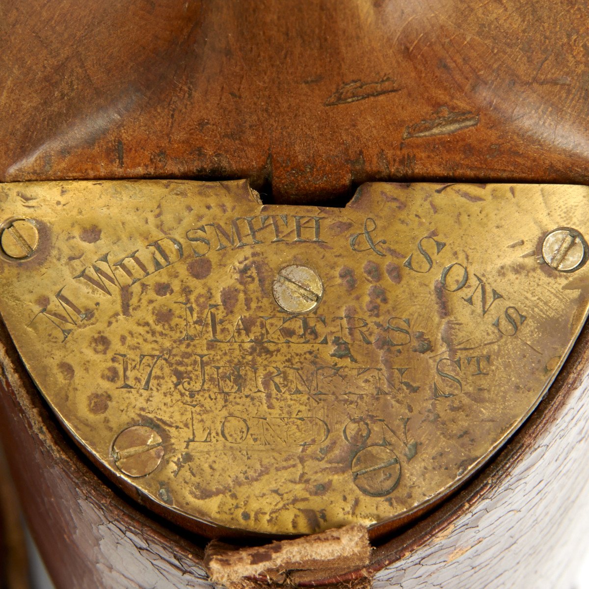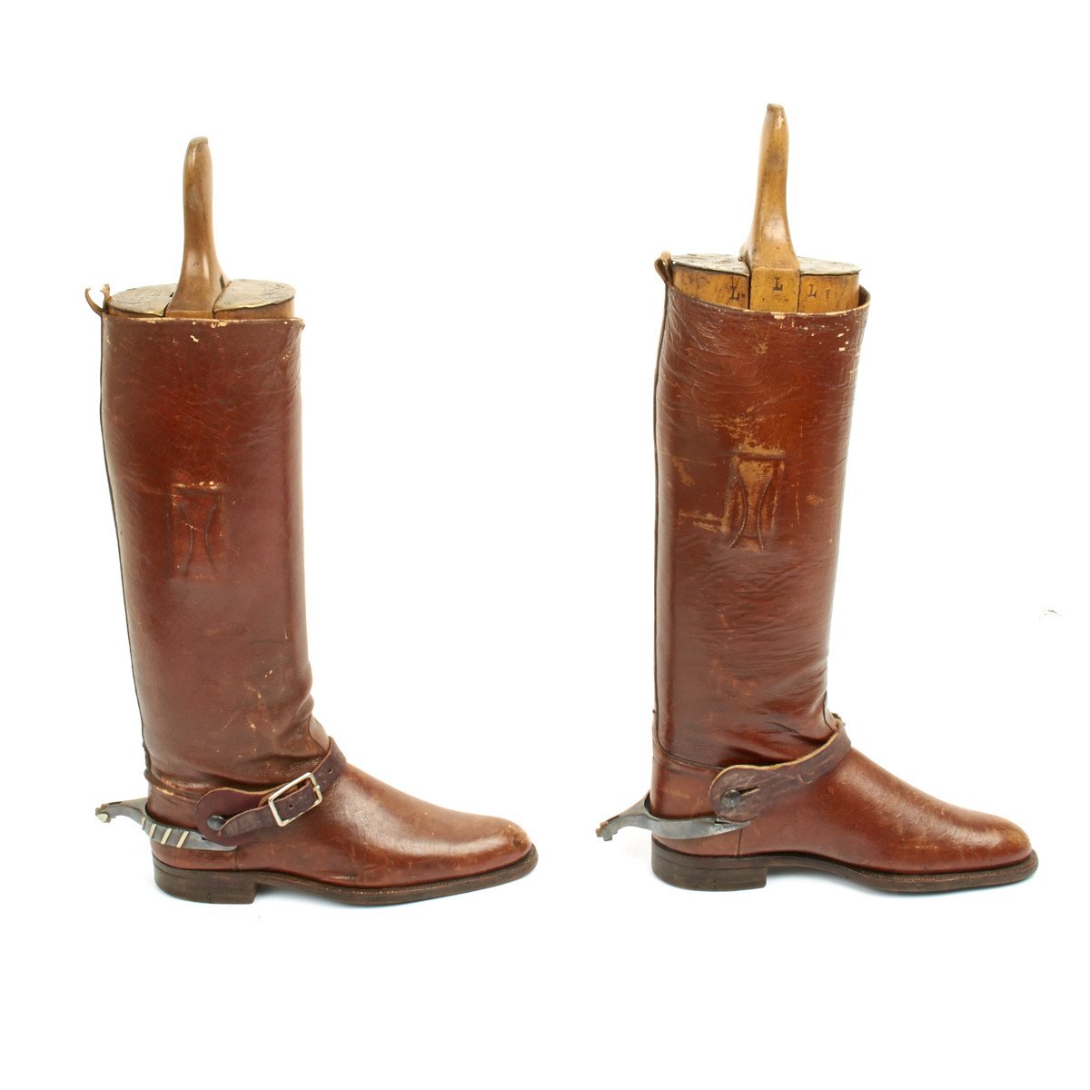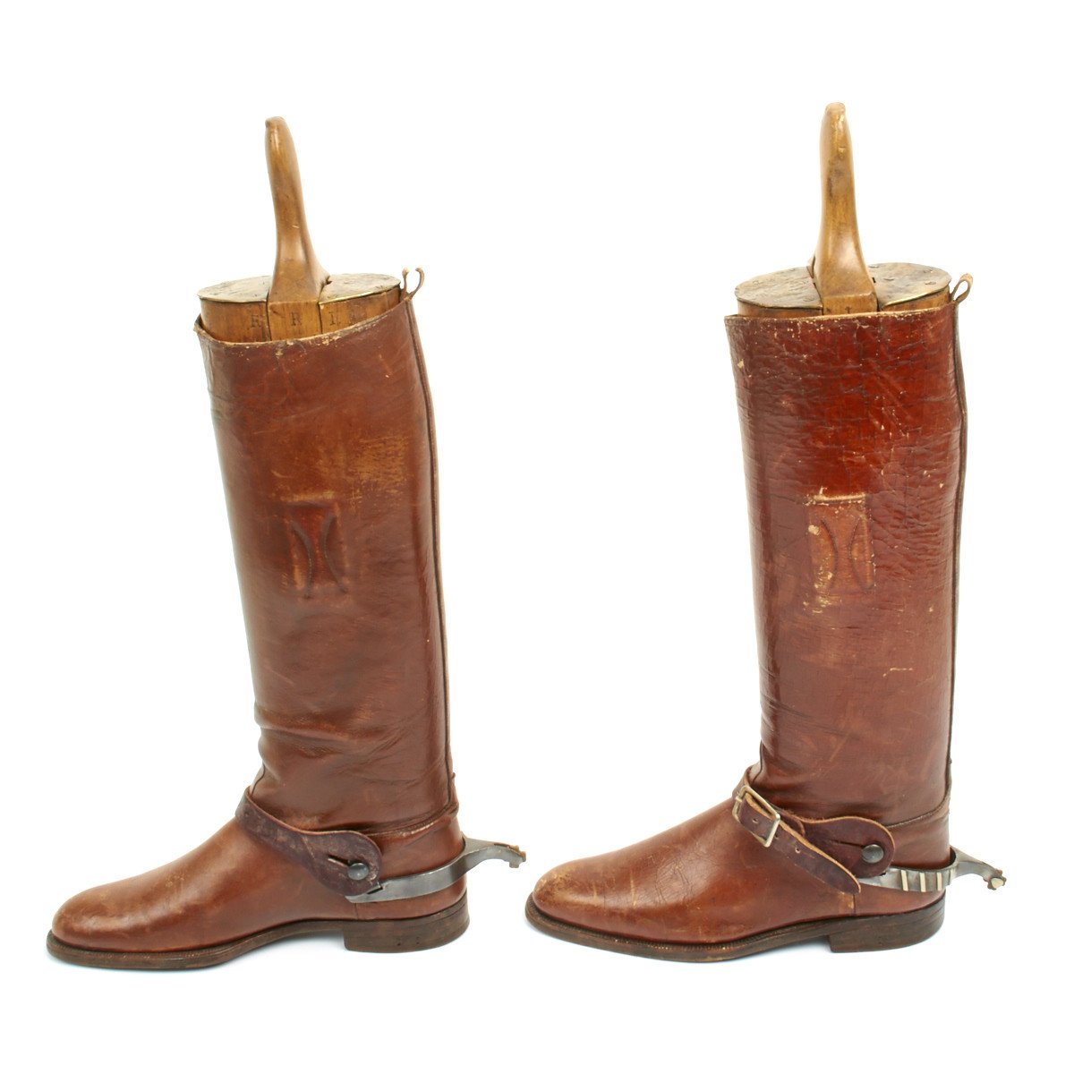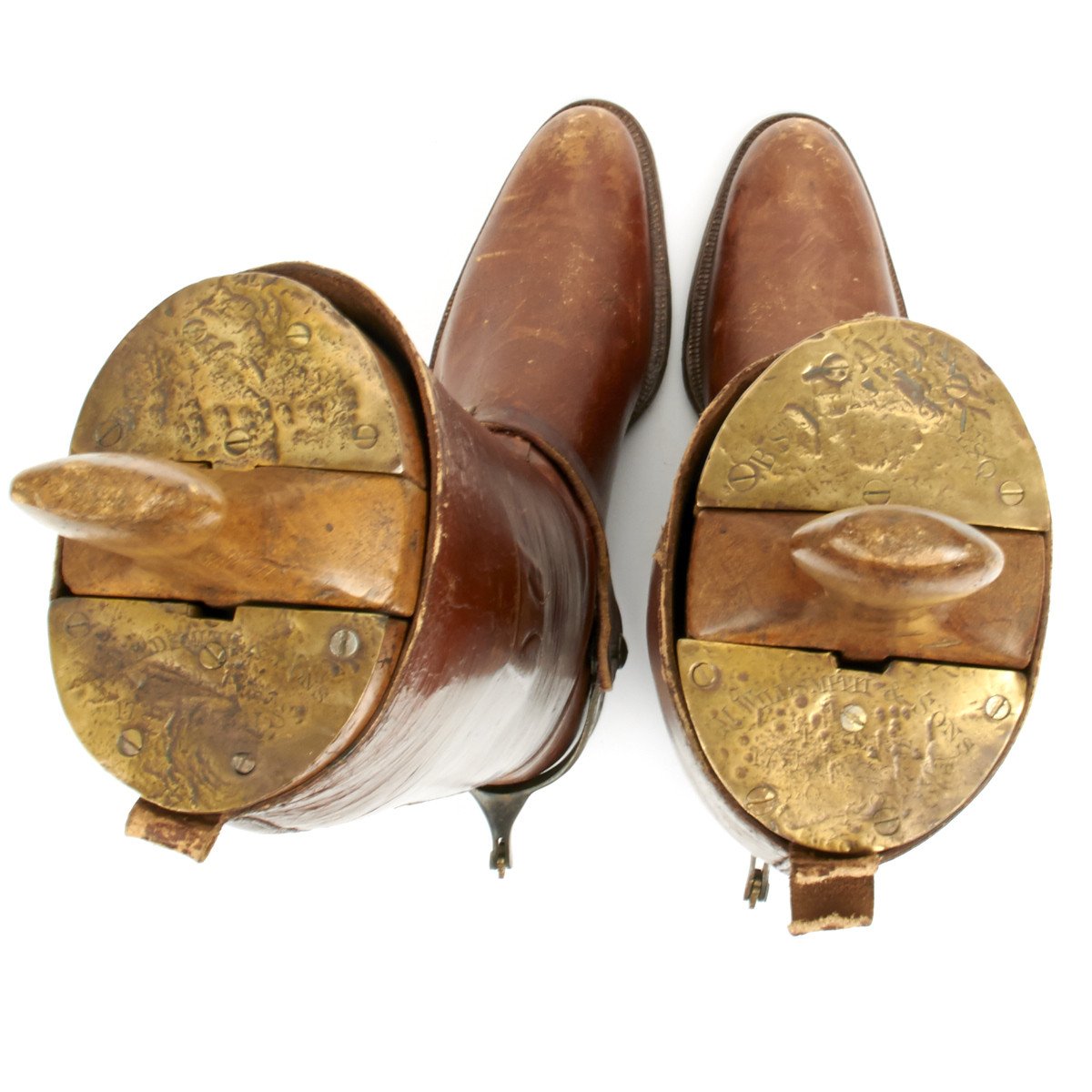 Exceptional boot trees comprised of wood and brass complete with maker name as follows: