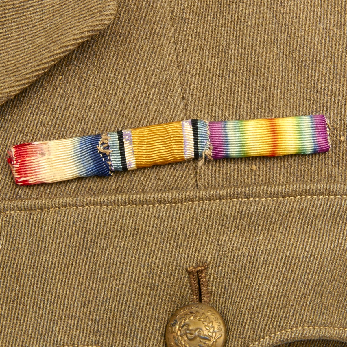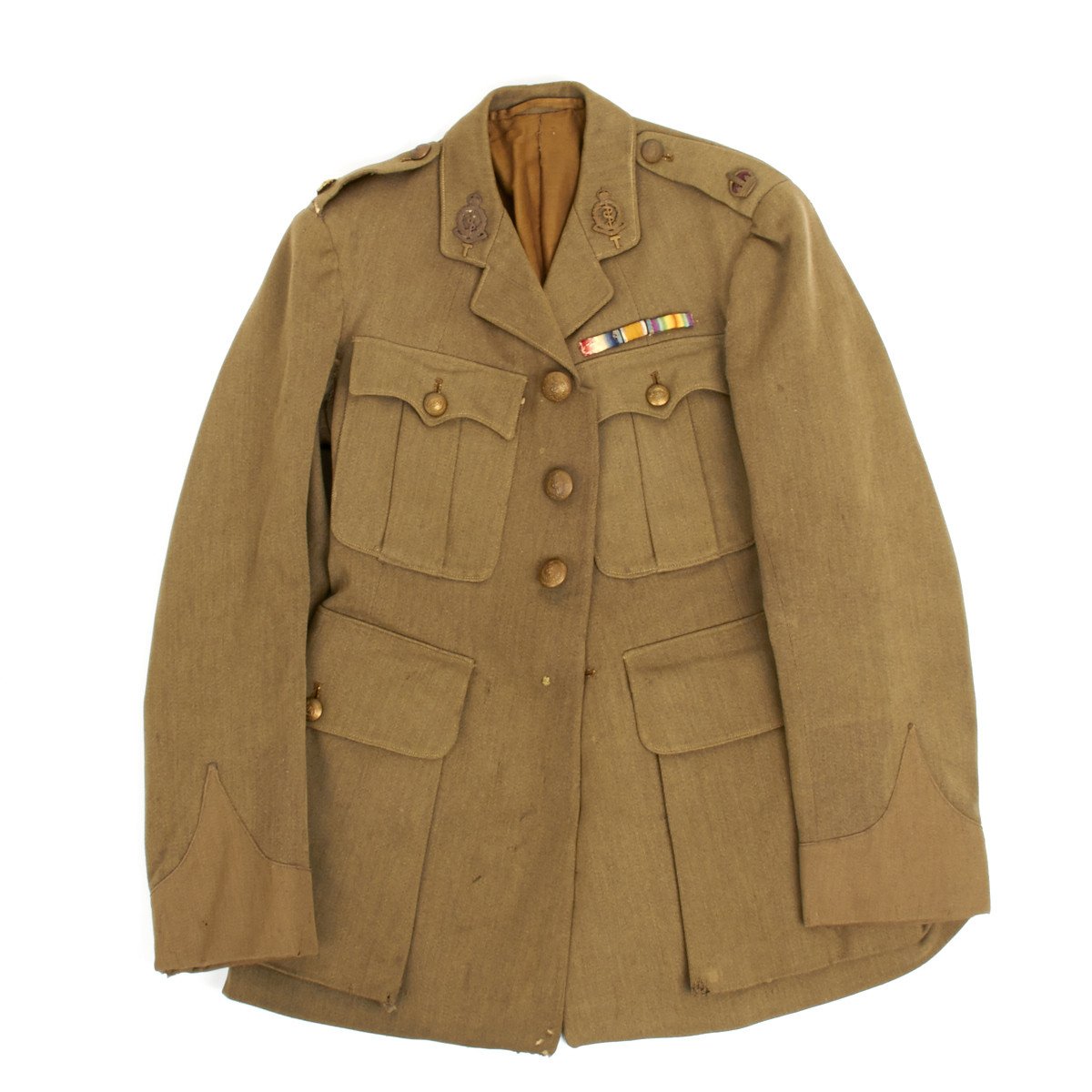 Officer tunic, approximate size 36, with correct RAMC buttons, collar insignia, kings crown epaulet pins, and ribbon medal bar with the following awards: 1914-15 star, War Medal and Victory Medal.