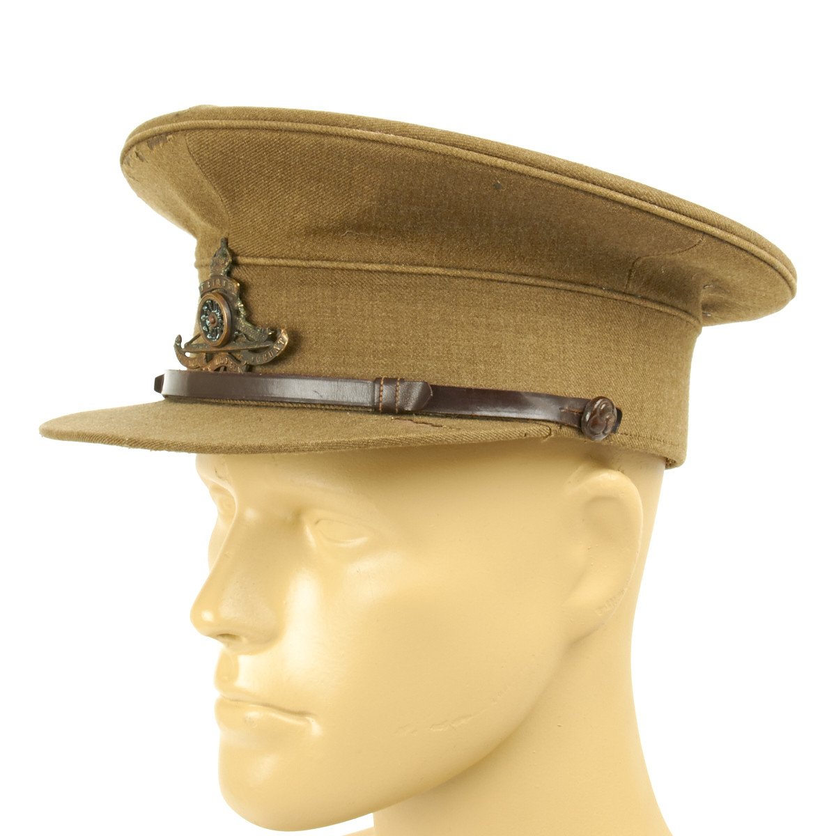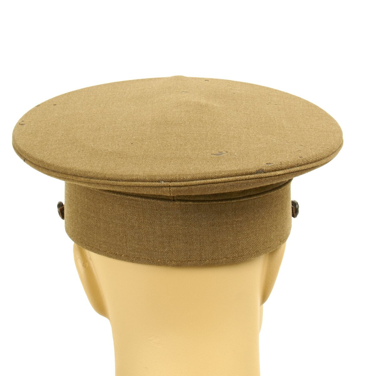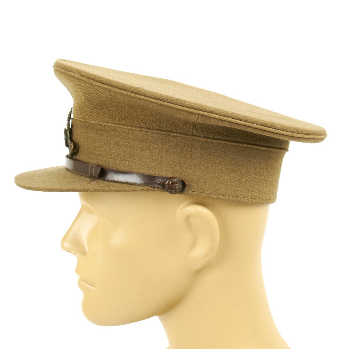 Original Item: Only One Available. Another item straight out of the attic! A genuine British World War One officer's peaked hat complete with the original leather chinstrap and leather hat band with maker's name printed in gold on the inner lining.