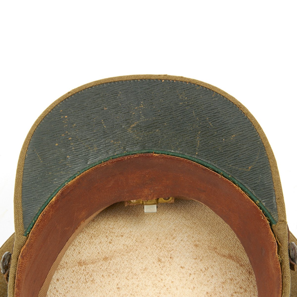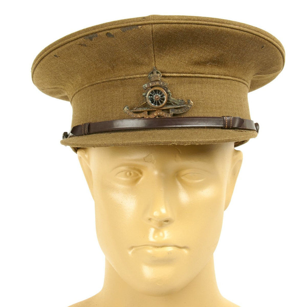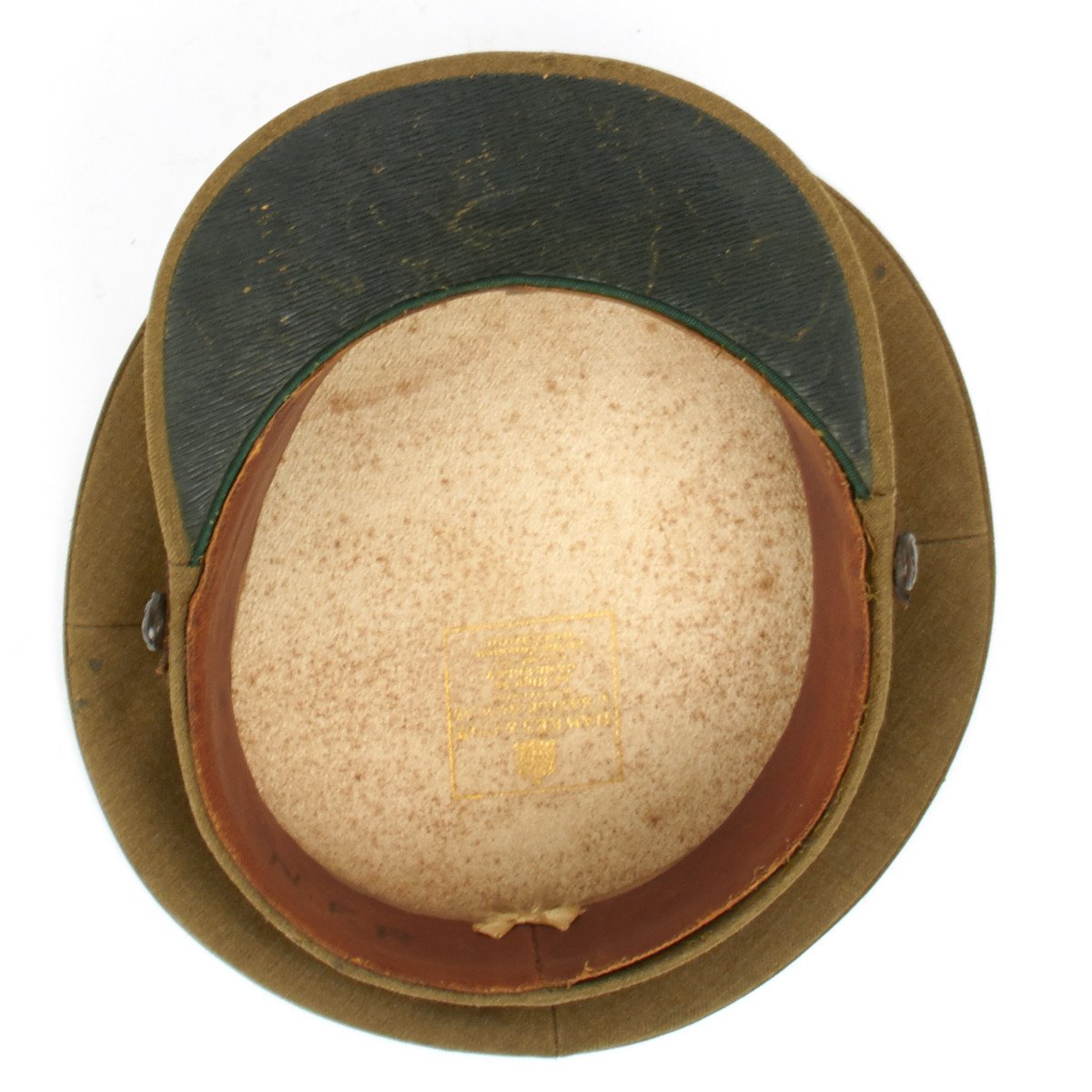 Original Item: Only One Available. Another item straight out of the attic! A genuine British World War One officer's peaked hat complete with the original leather chinstrap and leather hat band with maker's name printed in gold on the inner lining.