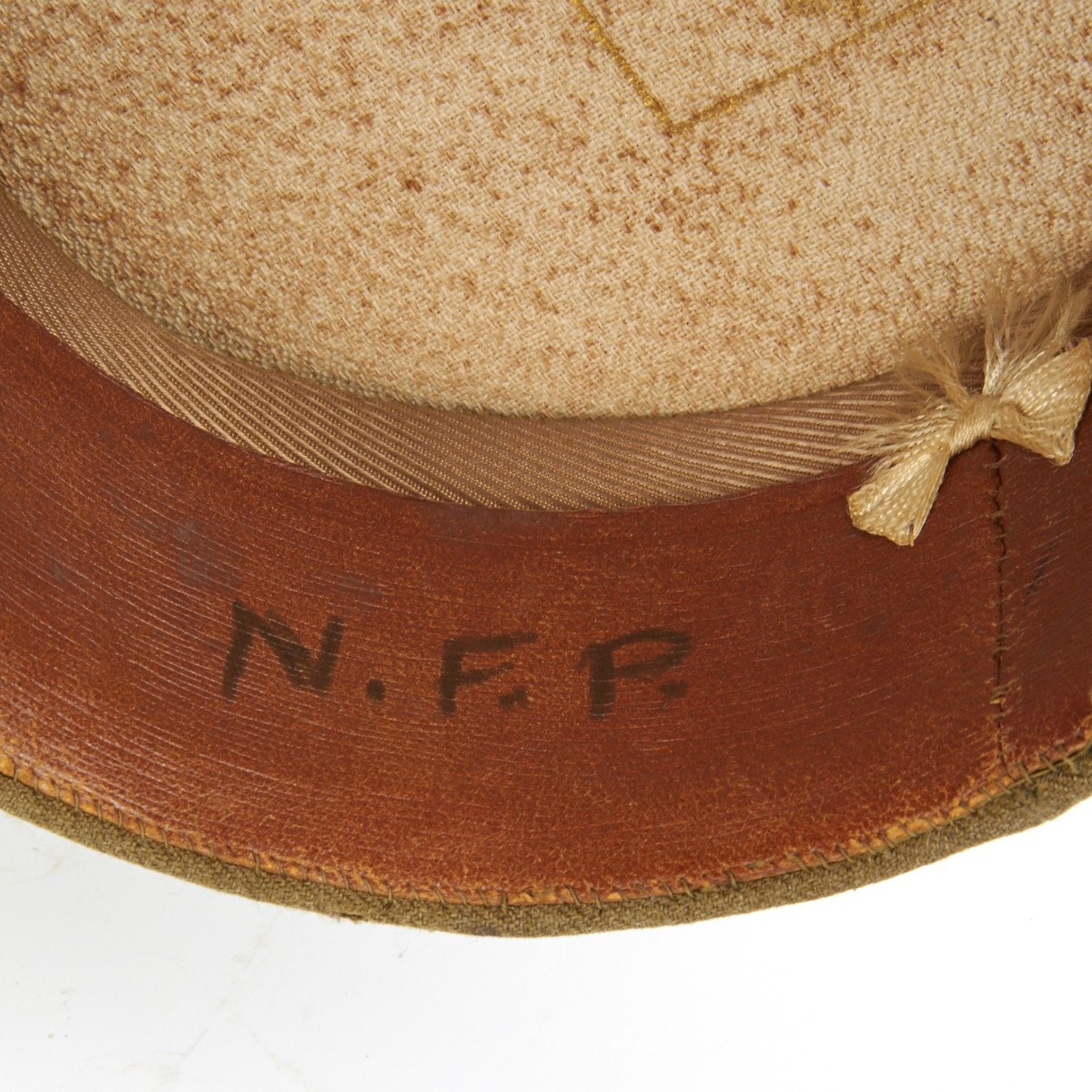 Complete with roan leather sweatband bearing the hand written initials "N.F.P". Partially hidden under the leather sweatband is a partial tailor's paper label.
