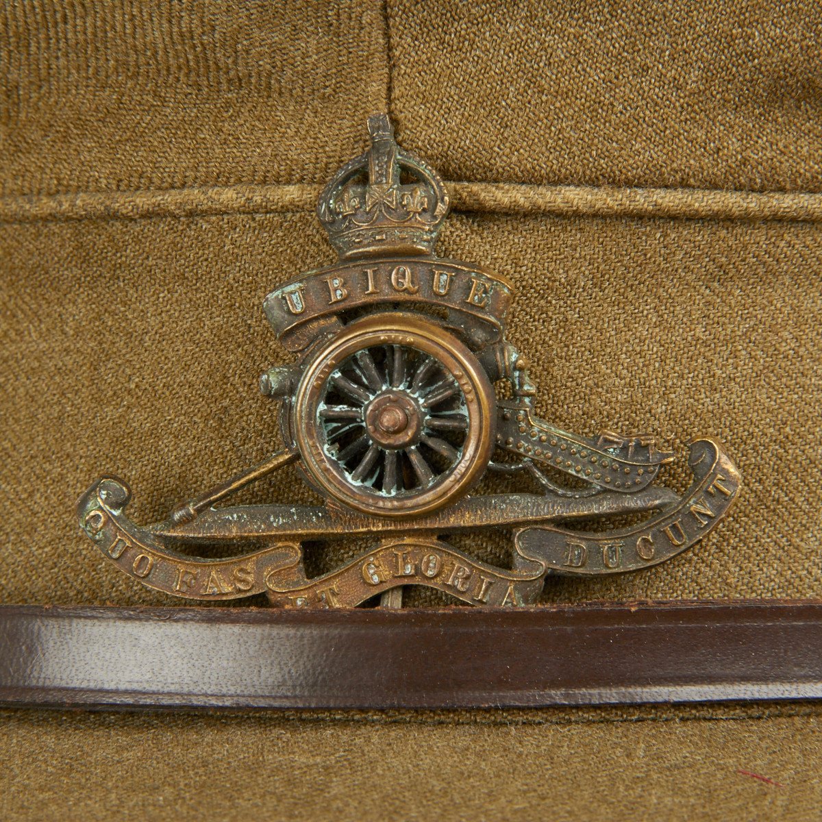 The brass hat badge is that of the Royal Artillery. The gun depicted on the cap badge is a 9pdr Rifled Muzzle Loader of about 1871, and the rammer used to ram the charge into the muzzle is also seen, to the left of the carriage wheel. "Ubique", surmounting the gun, means "Everywhere", and the Motto below Quo Fas et Gloria Ducunt, "Where right and glory lead us".