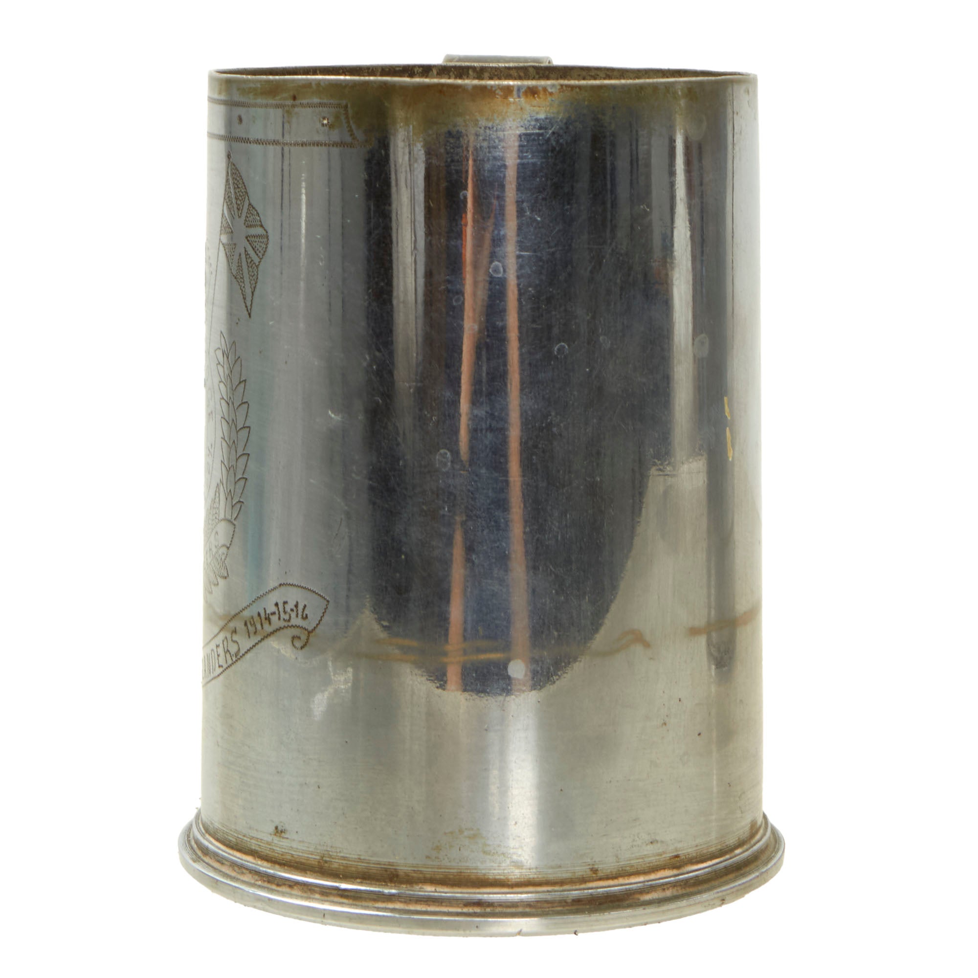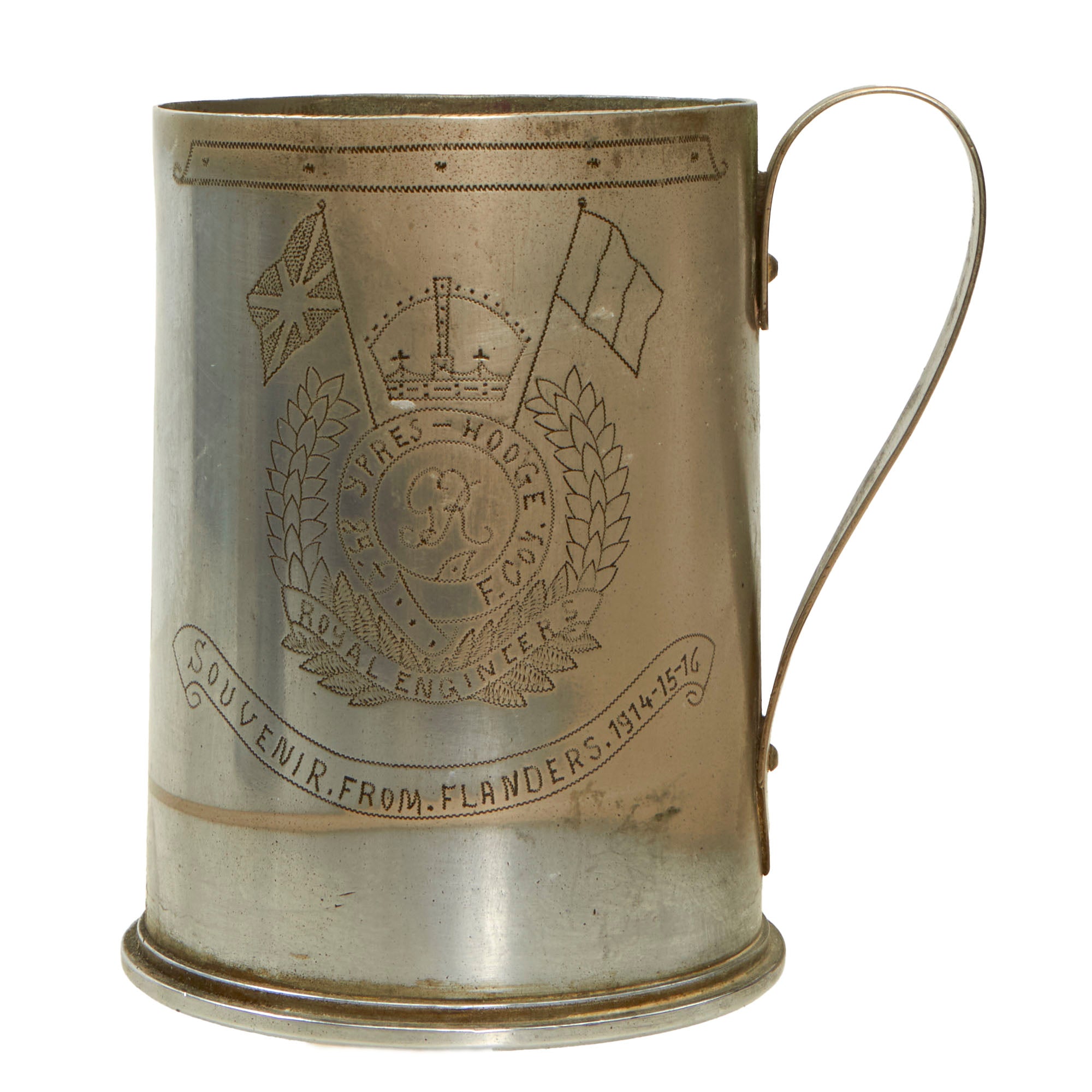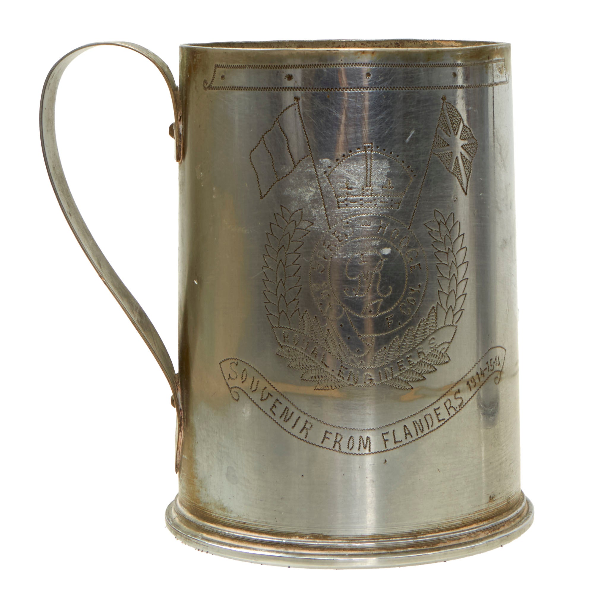 This is a lovely pair of Trench Art mugs made from 18 Pounder shells, dated 1910 and 1915. The sides of each mug bear the insignia of the Royal Engineers, with the inscription YPRES-HODGE 89. F. COY / ROYAL ENGINEERS. Below each insignia is a scroll reading SOUVENIR FROM FLANDERS 1914-15-16. The mugs measure roughly 5¼” tall with a 4” base diameter.