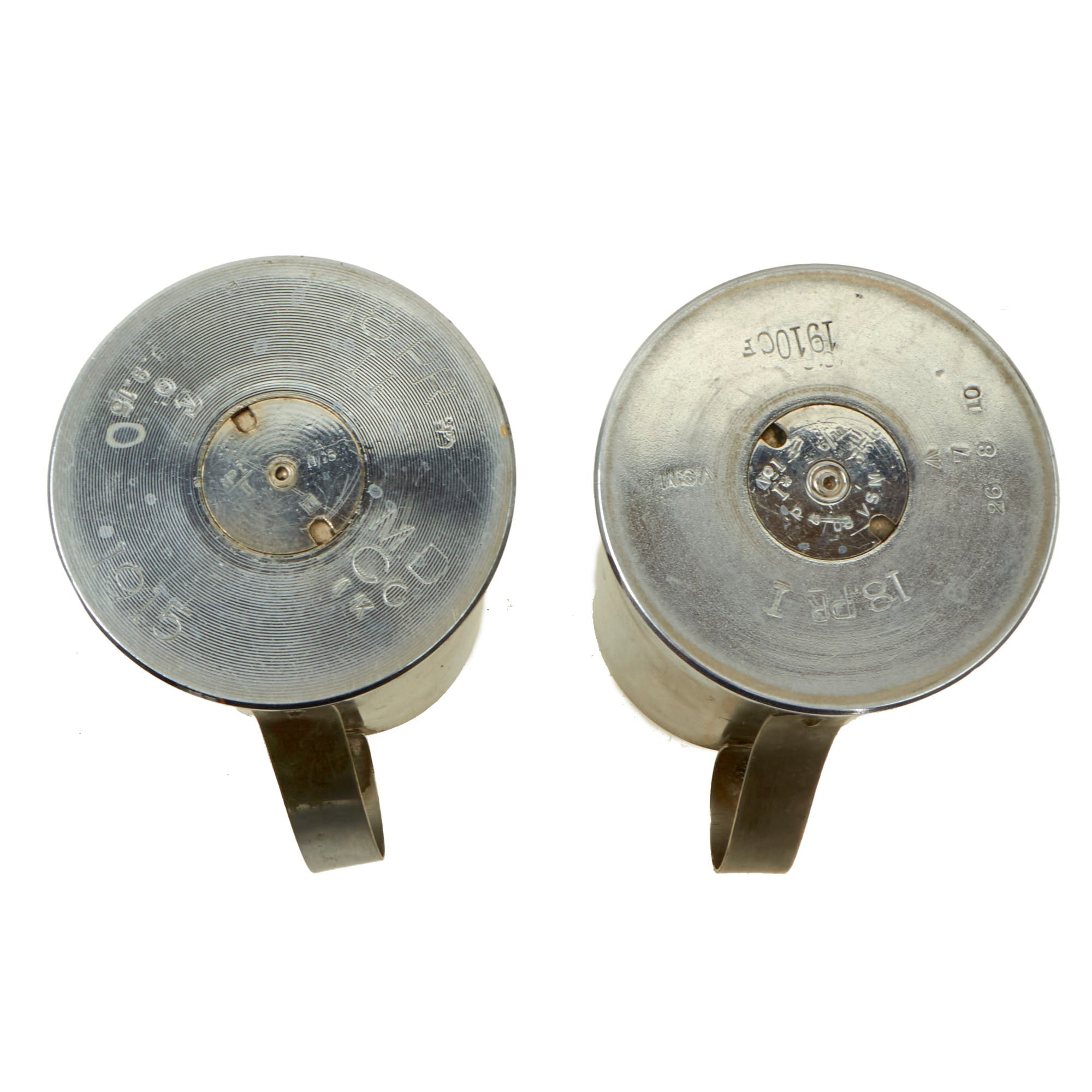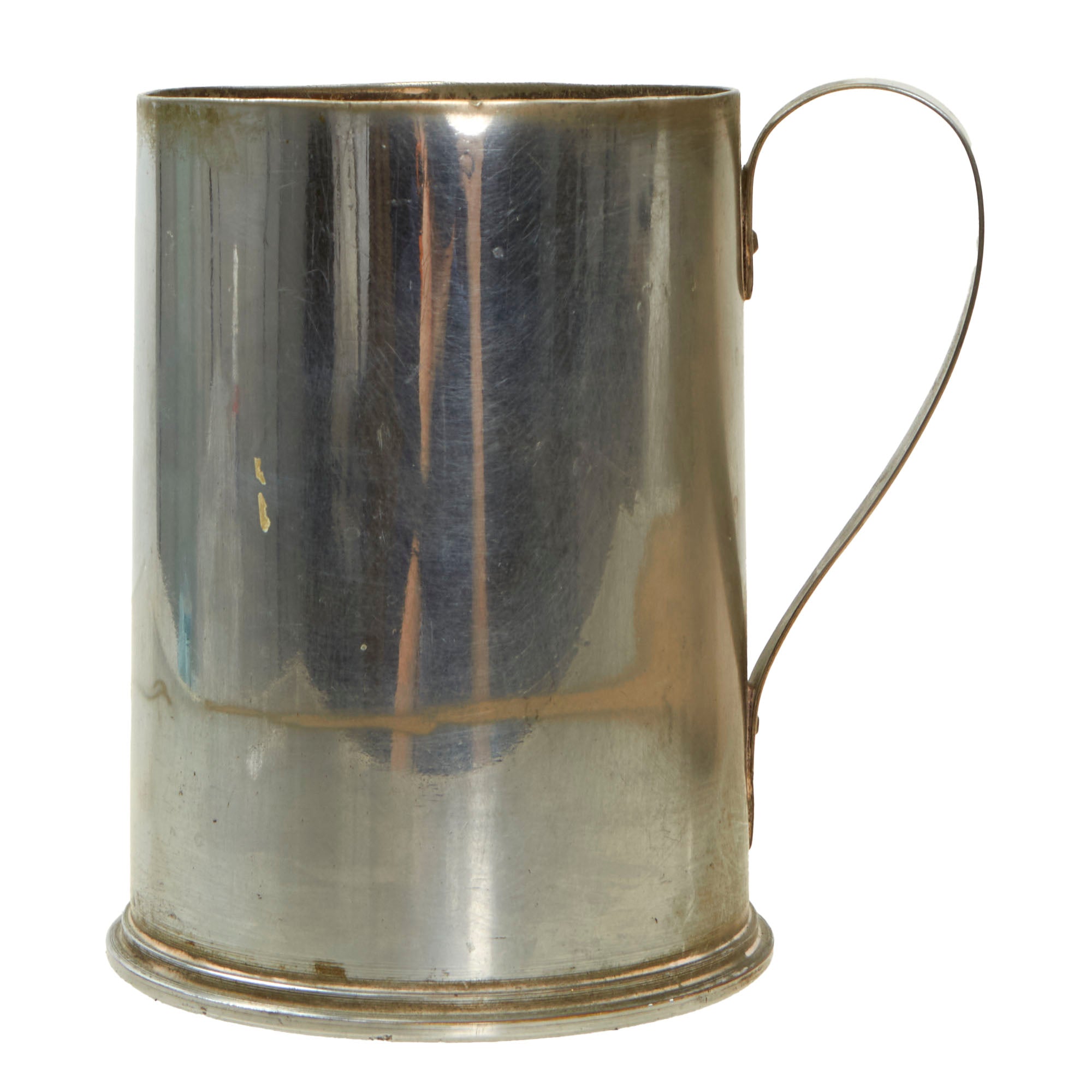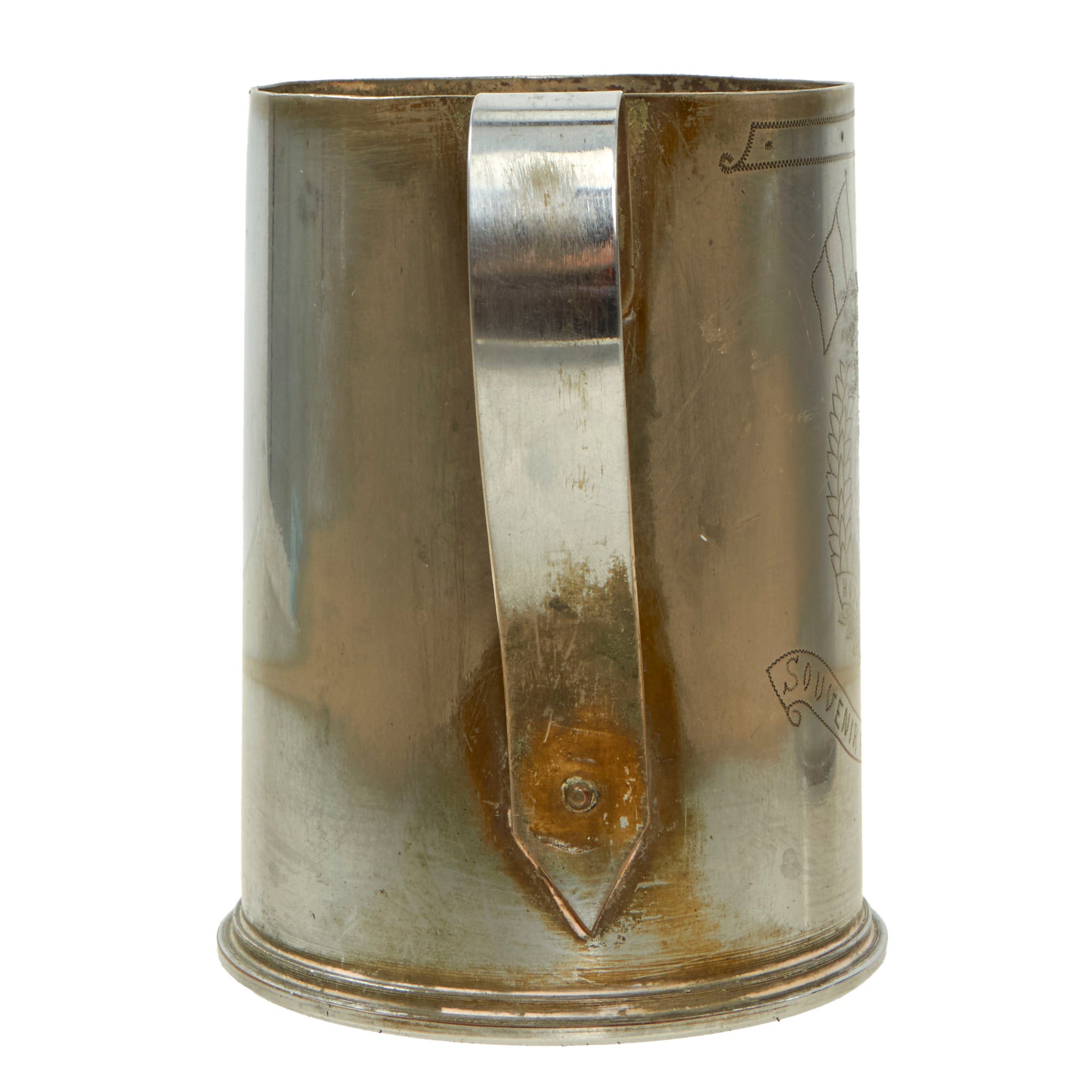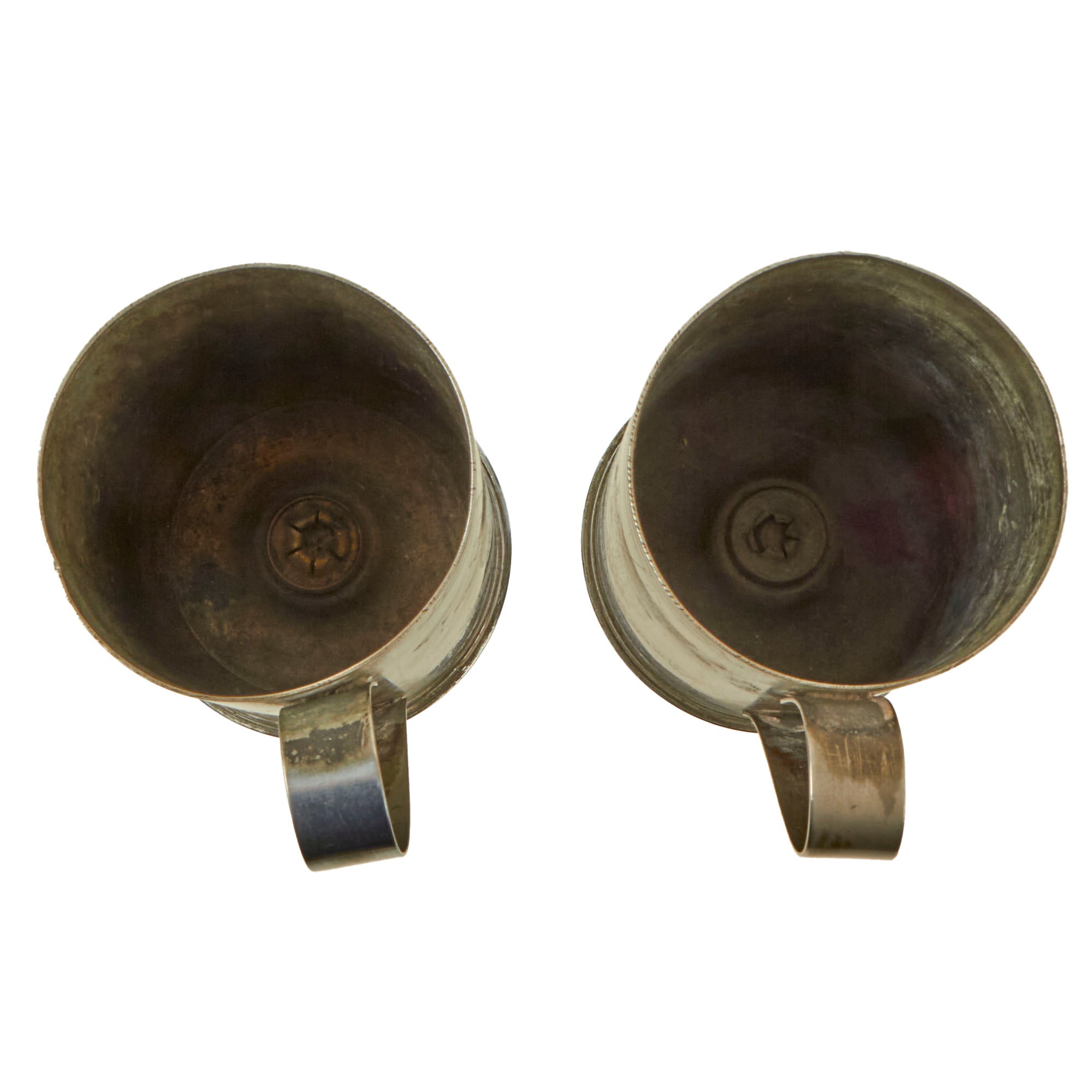 This is a lovely pair of Trench Art mugs made from 18 Pounder shells, dated 1910 and 1915. The sides of each mug bear the insignia of the Royal Engineers, with the inscription YPRES-HODGE 89. F. COY / ROYAL ENGINEERS. Below each insignia is a scroll reading SOUVENIR FROM FLANDERS 1914-15-16. The mugs measure roughly 5¼” tall with a 4” base diameter.