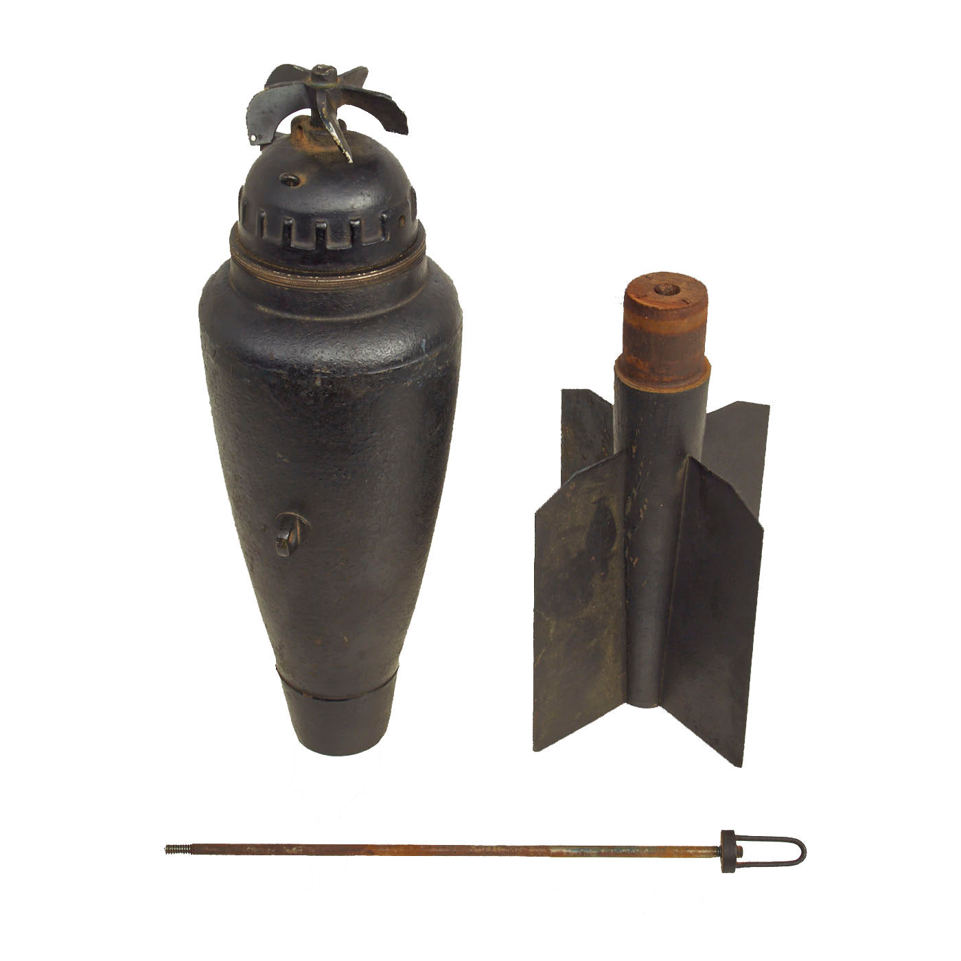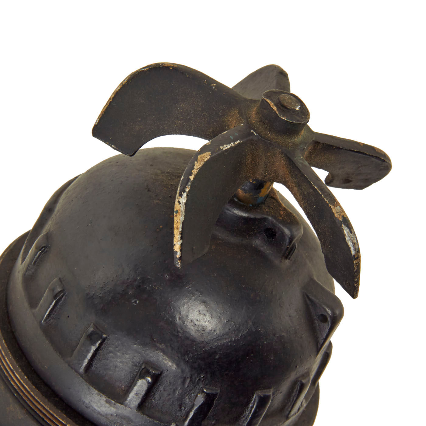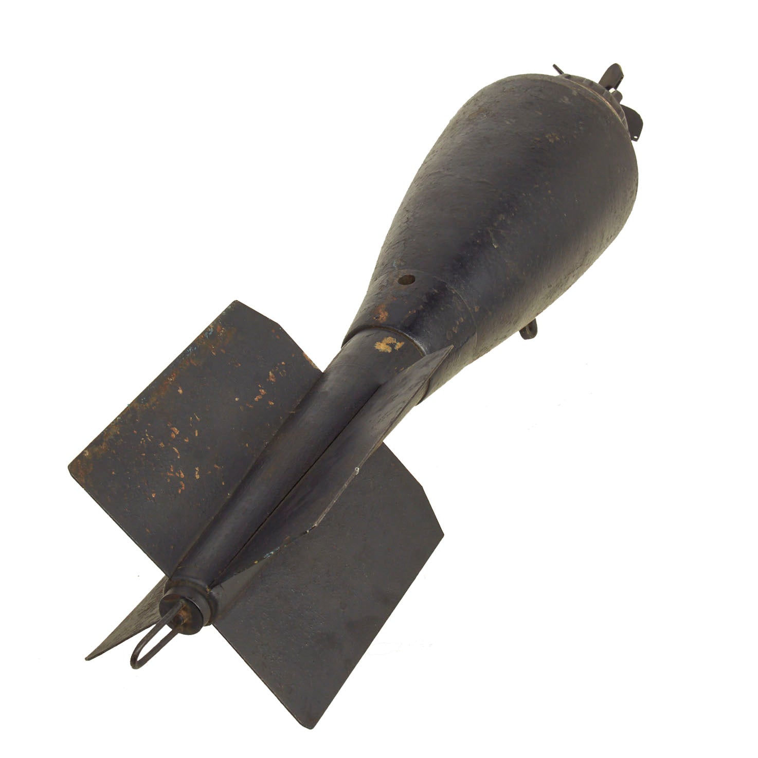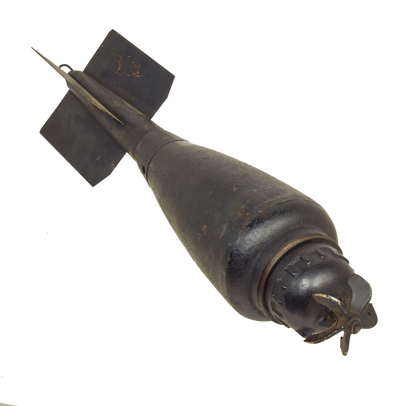 The bomb is in great condition with a “functional” fan assembly on the fuse. The fuse is still able to be removed from the nose for inspection of the interior. The black paint is a repaint as these were more of an orange / brown color. There is no extensive damage present and all fins are present.