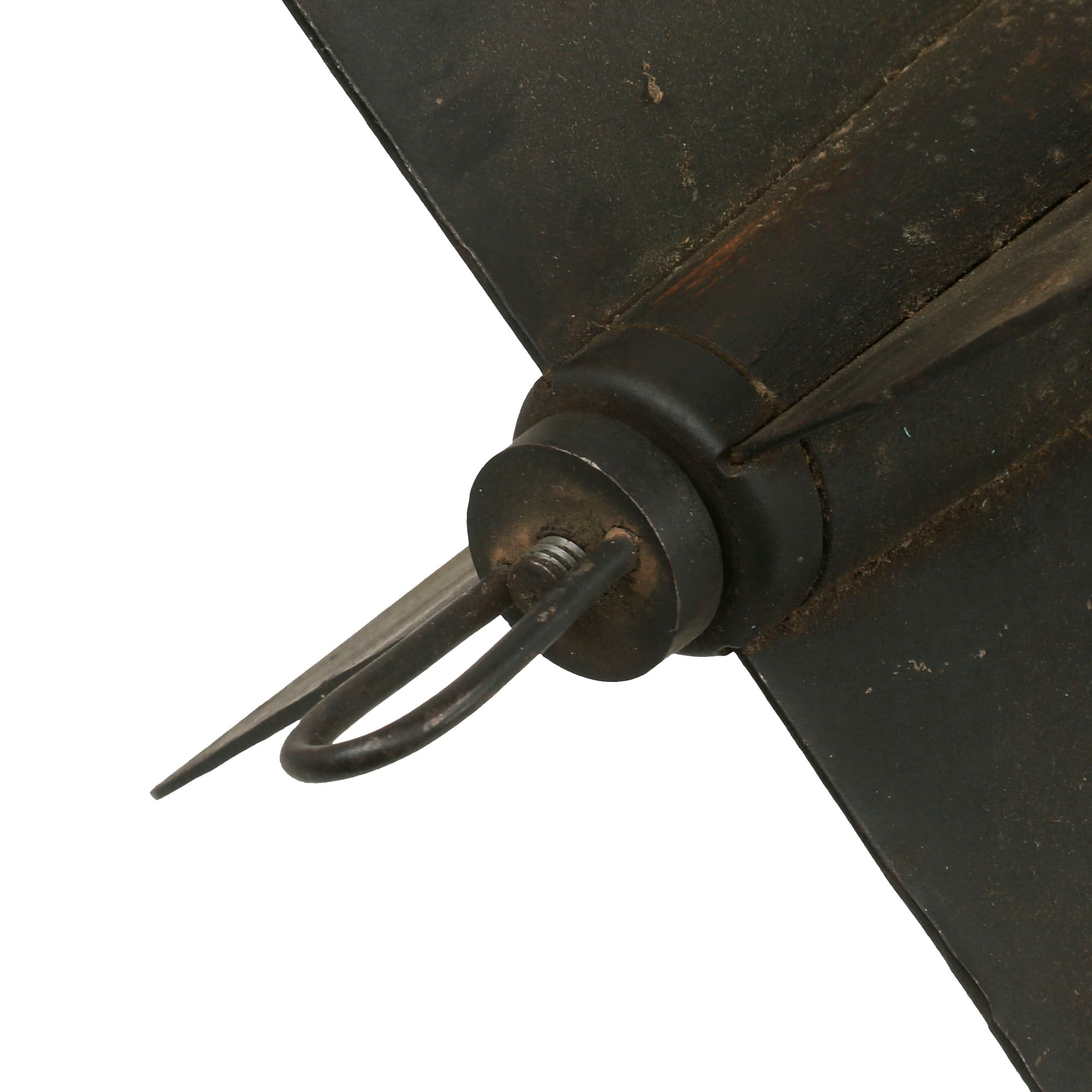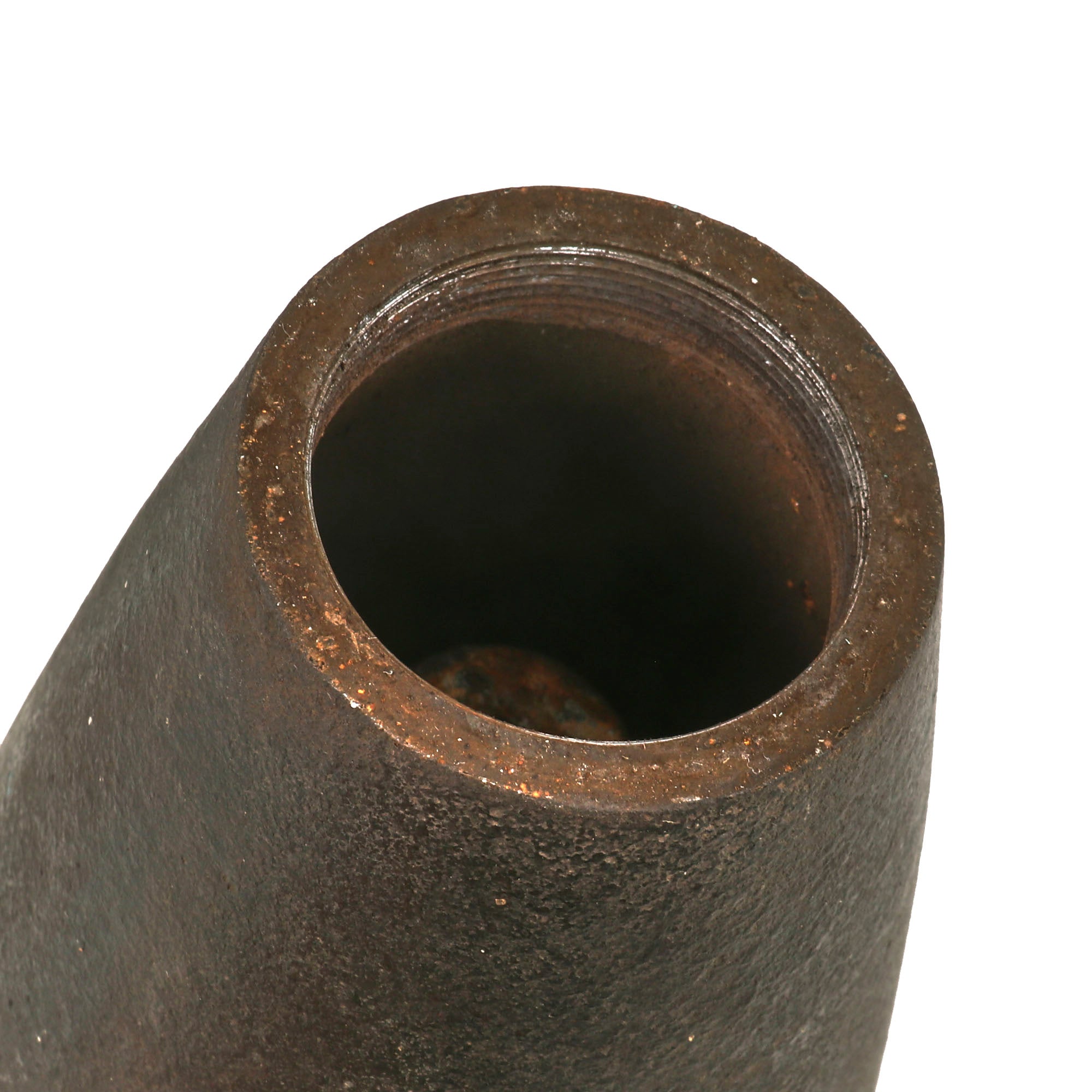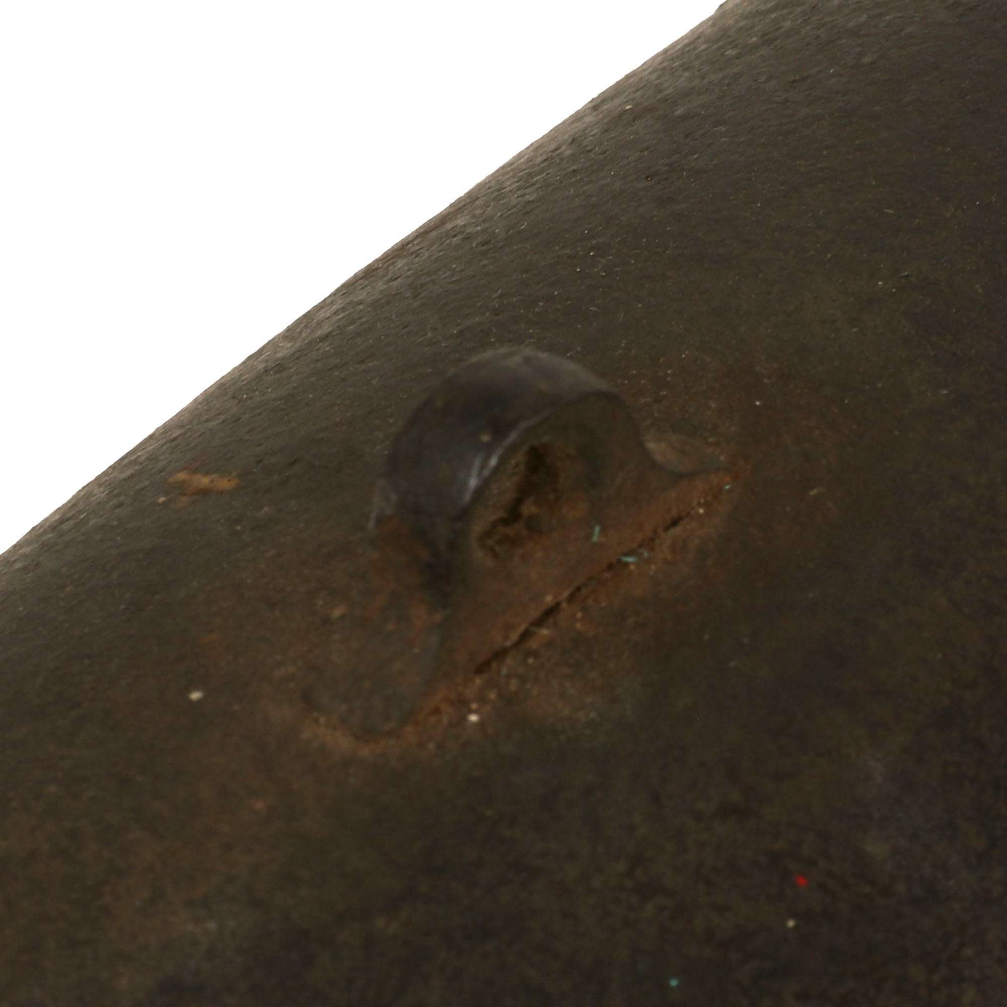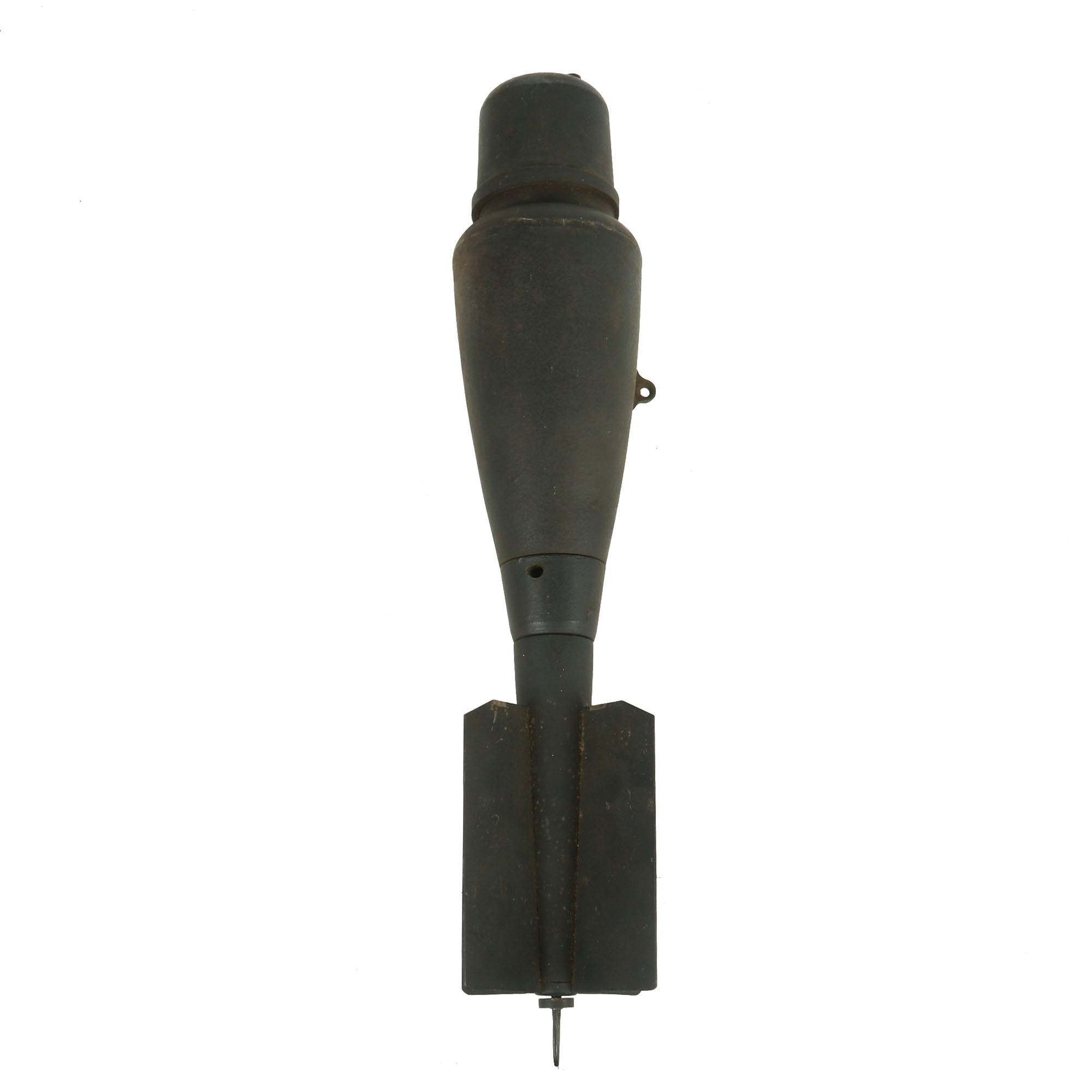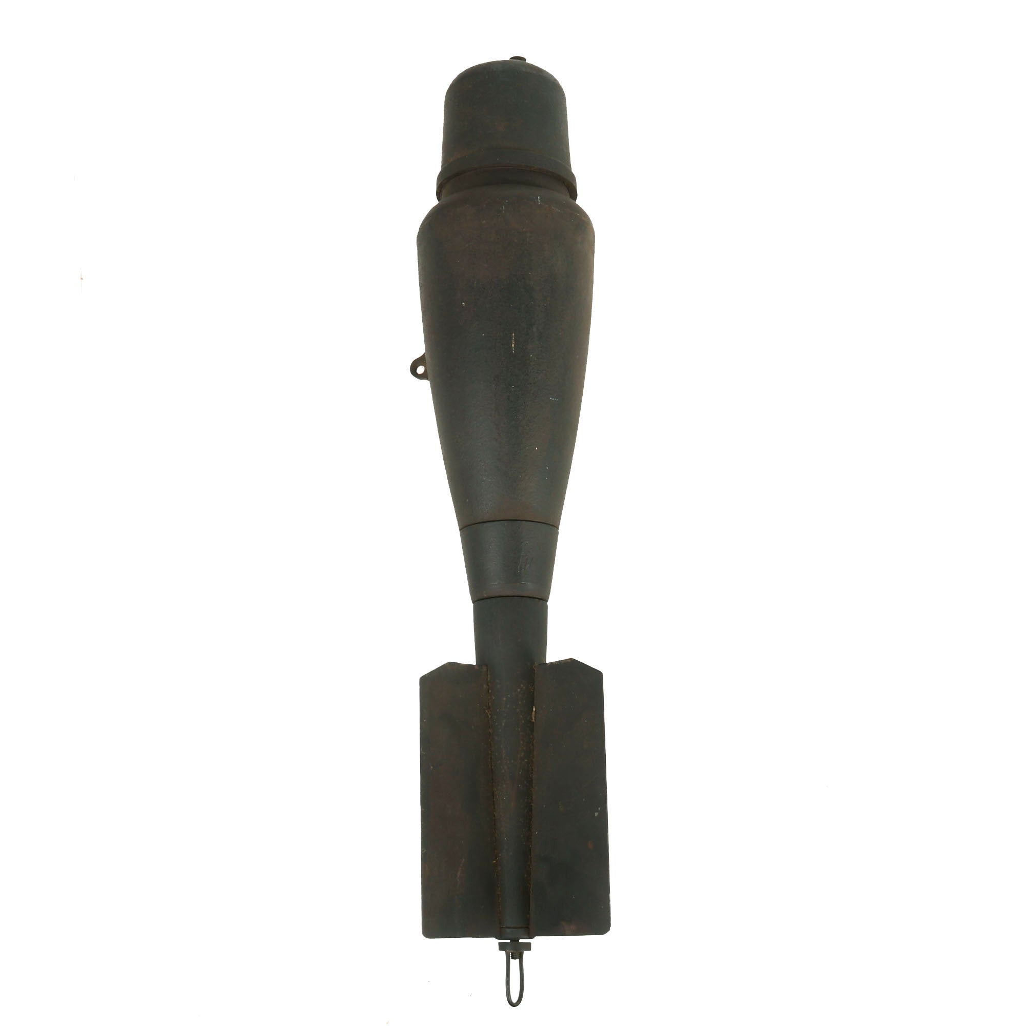 The bomb is in great condition with a “functional” fan assembly on the fuse. The fuse is still able to be removed from the nose for inspection of the interior. The black paint is a repaint as these were more of an orange / brown color. There is no extensive damage present and all fins are present. The fuze cover makes a great addition to an already great piece.