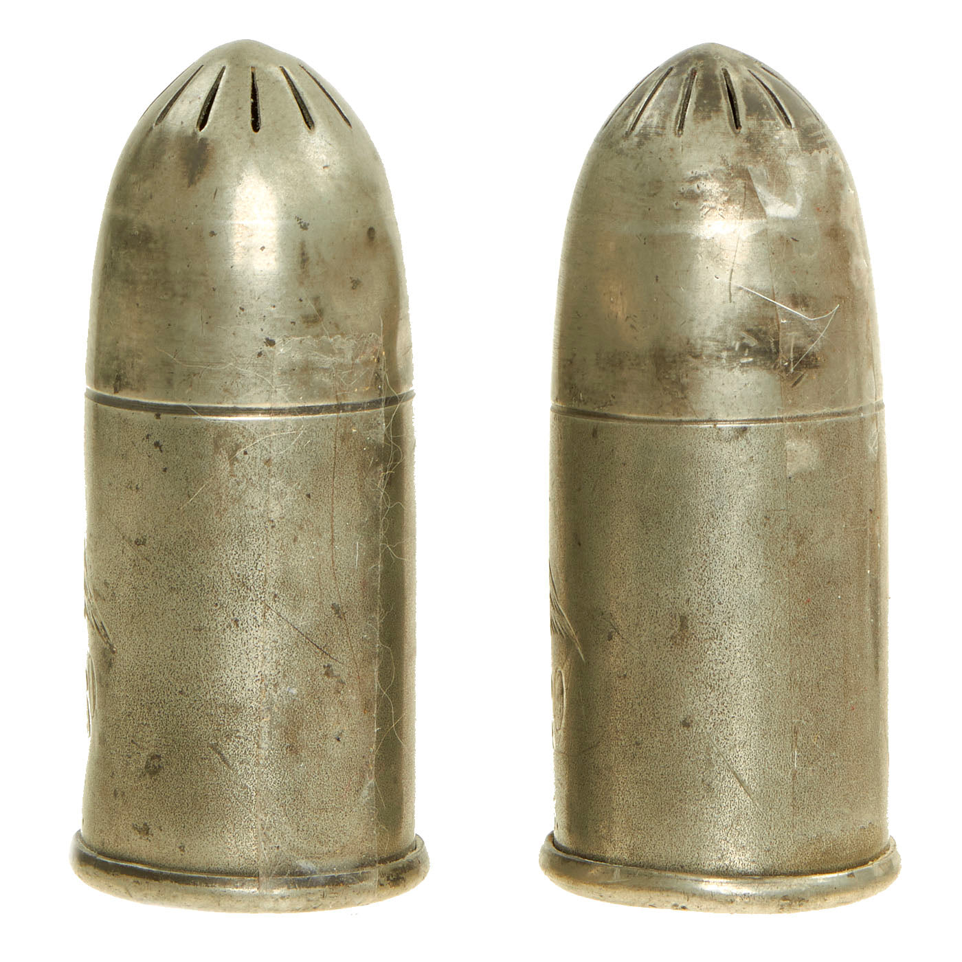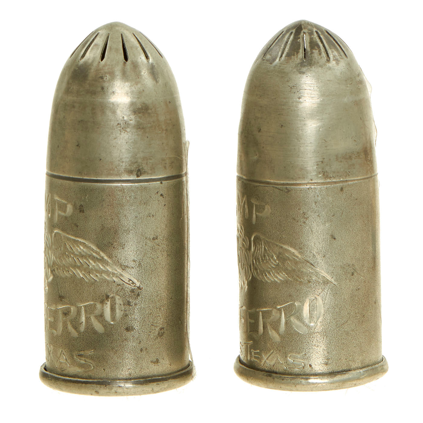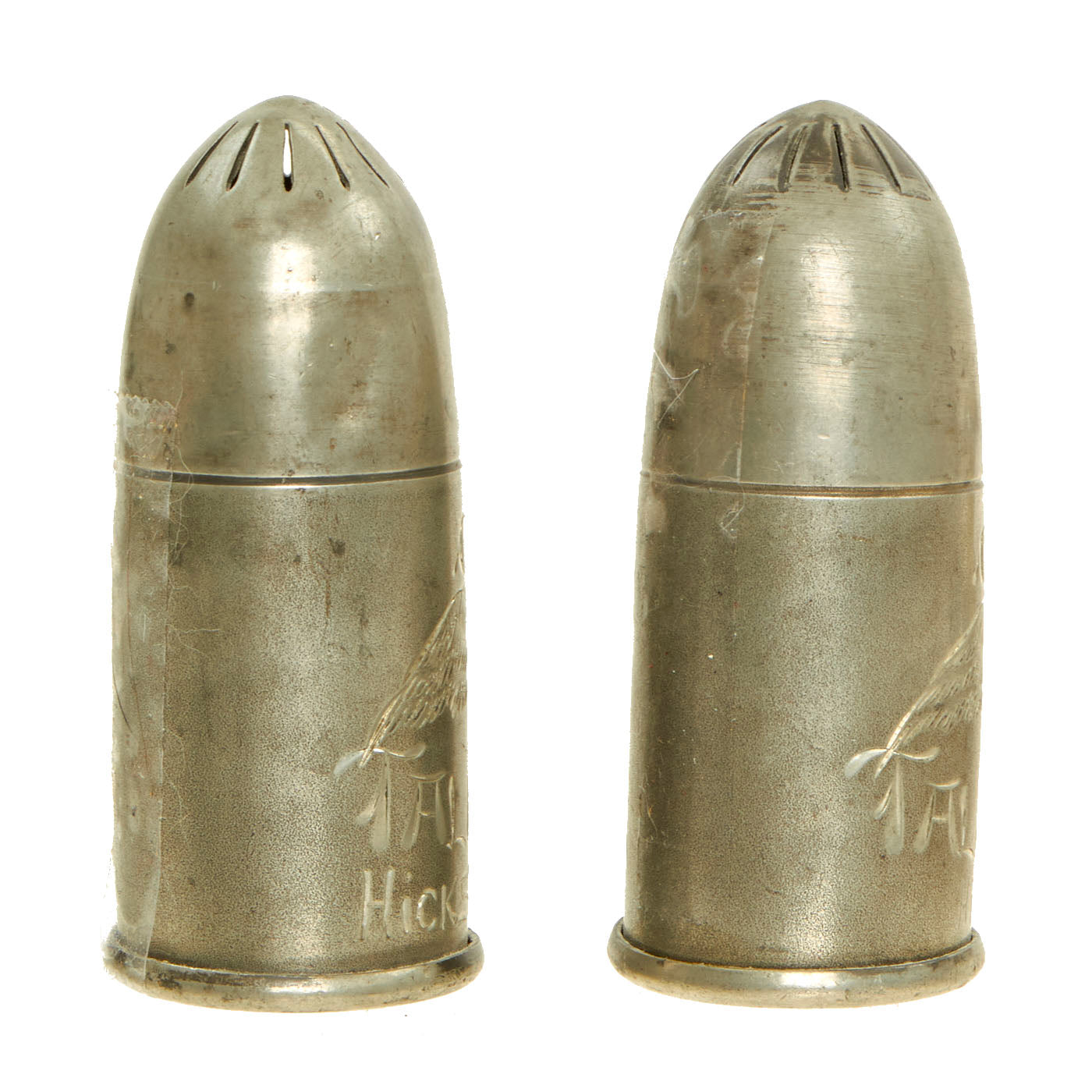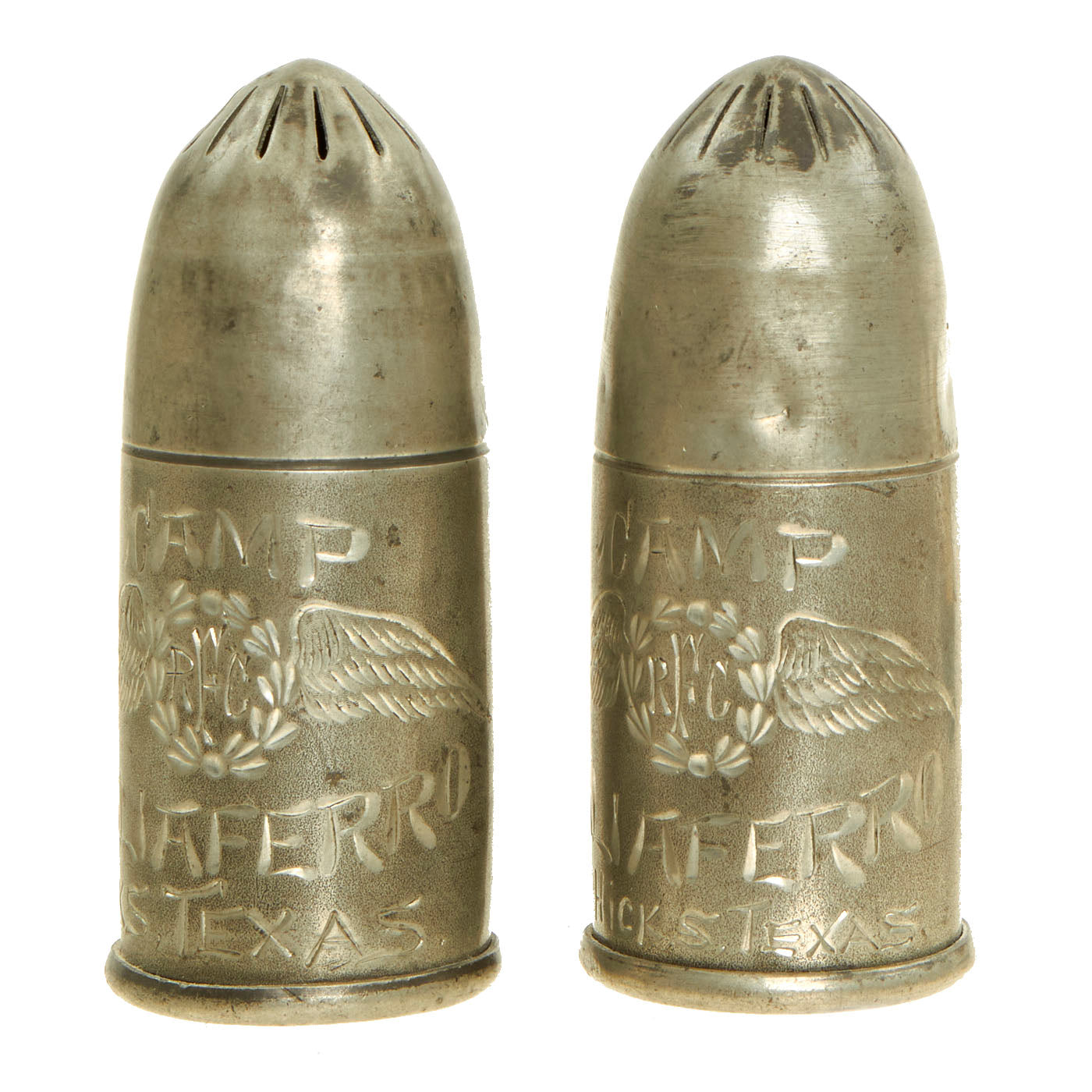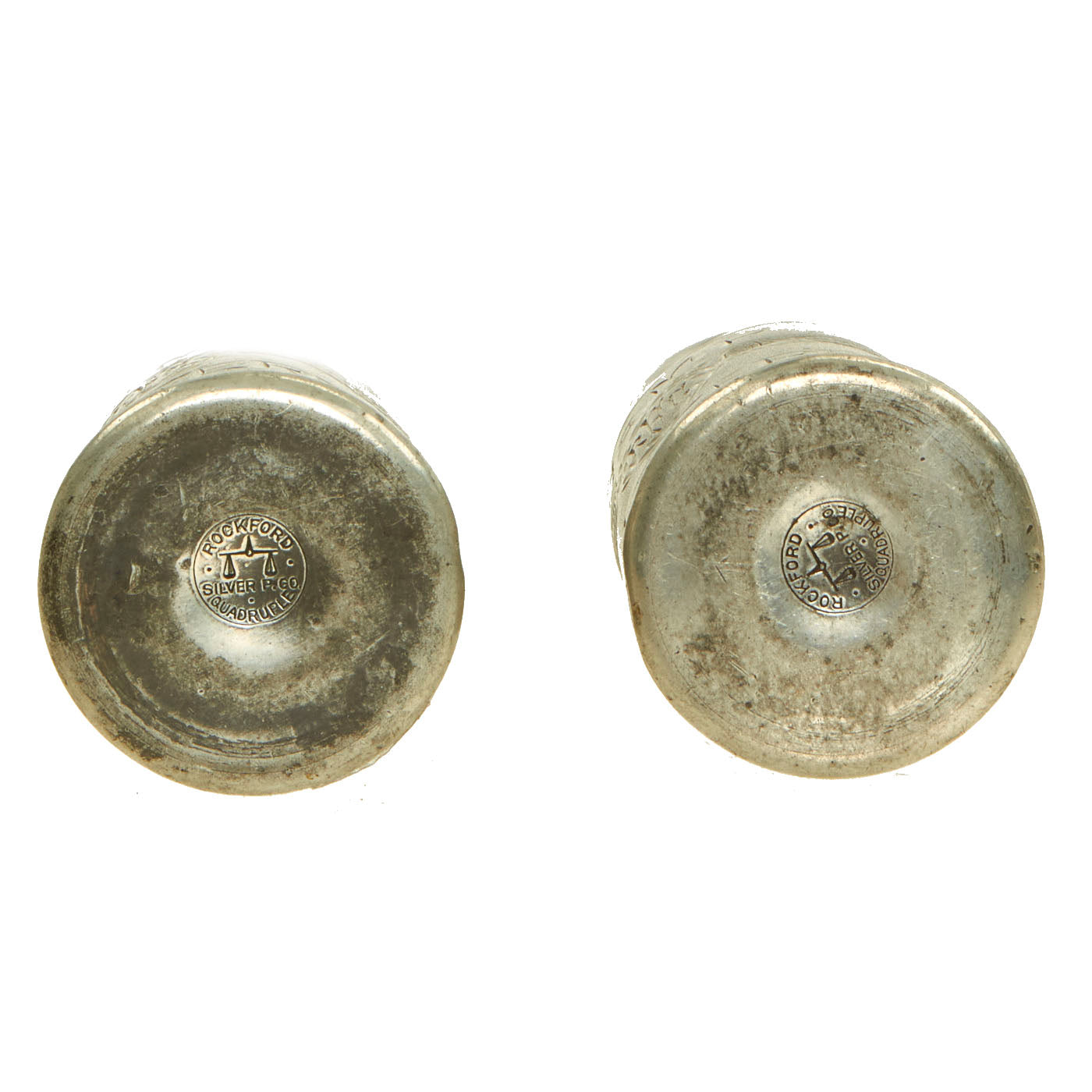 - (2) Rockford Silver Camp Taliaferro Engraved Salt & Pepper “Bullet” Shakers: The salt and pepper shakers are both marked on the bottom with Rockford Silver Quadruple. The face of the shakers has CAMP (RFC Insignia) TALIAFERRO HICKS TEXAS engraved on them. Both are in lovely condition.