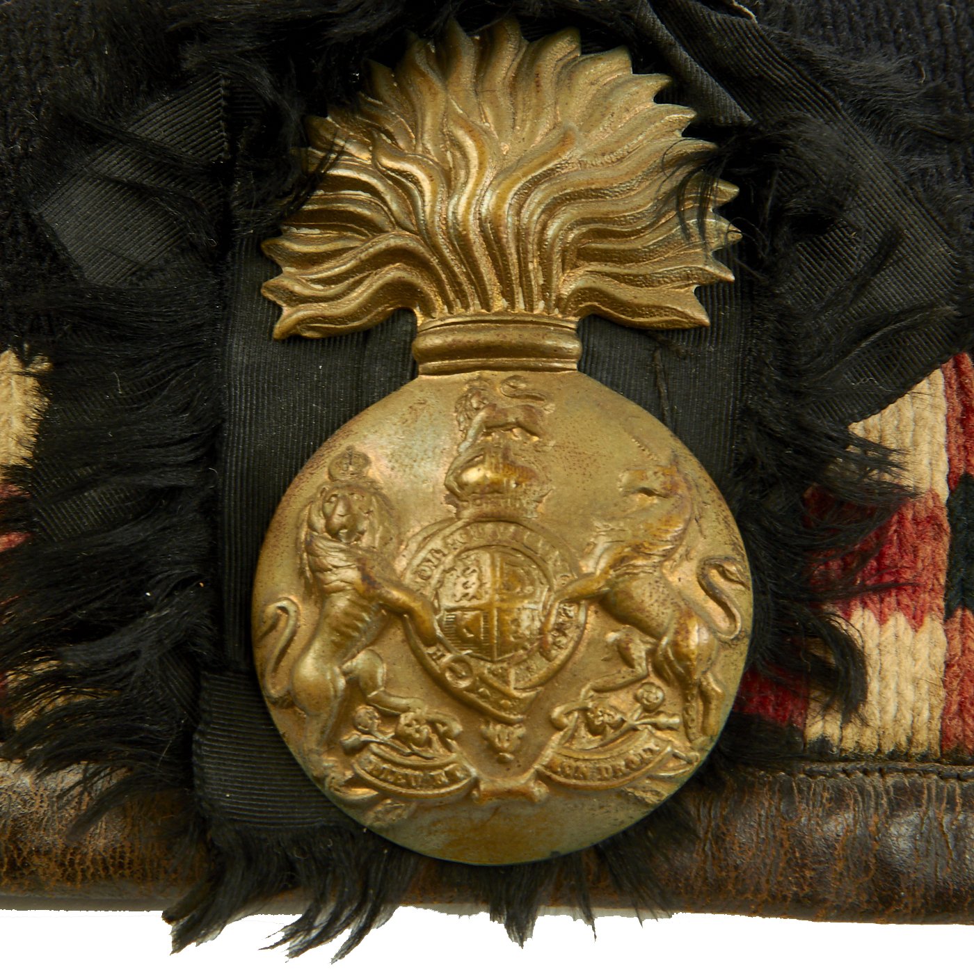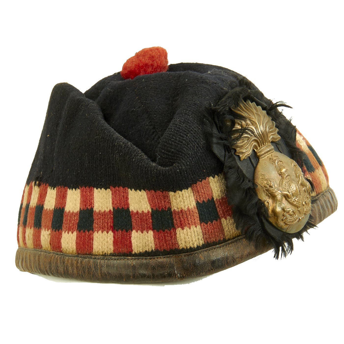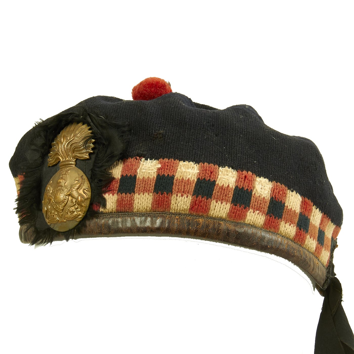 This example is in good condition, though it does show wear consistent with long service, both inside and out. The inside liner is split along most of the top, and the side stiffeners can be seen. It has the correct red, white, and black "diced" checkerboard pattern on the sides, with a nice rosette on the left side. Attached to this is a very nice brass "Flaming Bomb" Cap Badge from the Royal Scots Fusiliers regiment, with the correct "King's Crown" in the badge.