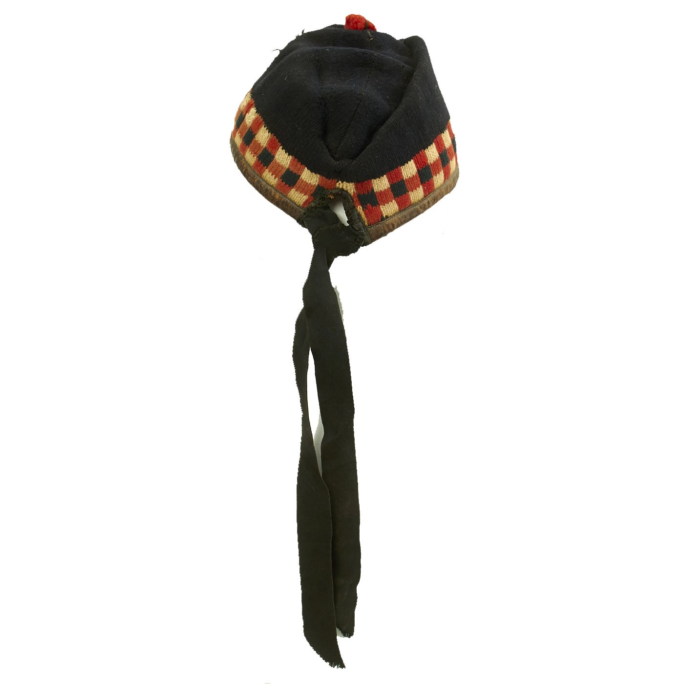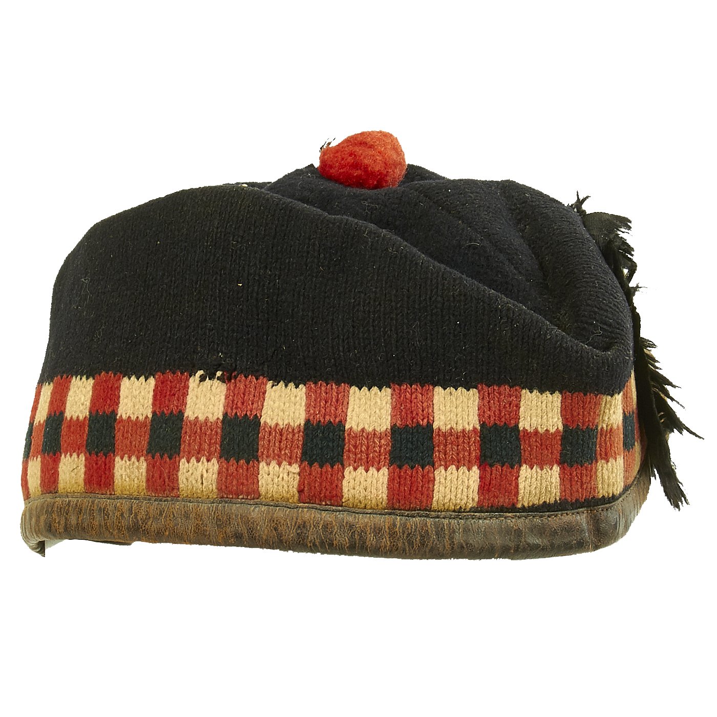 Original Item: Only One Available. The glengarry bonnet, or side cap, is a traditional Scots cap made of thick-milled woollen material, decorated with a toorie (small pom pom) on top, frequently a rosette cockade on the left side, and ribbons hanging behind. It is normally worn as part of Scottish military or civilian Highland dress, either formal or informal, as an alternative to the Balmoral bonnet or tam o' shanter. For many years it was the standard headgear of all highland regiments in the British Army, except for the Black Watch, who retained a blue Balmoral Bonnet.