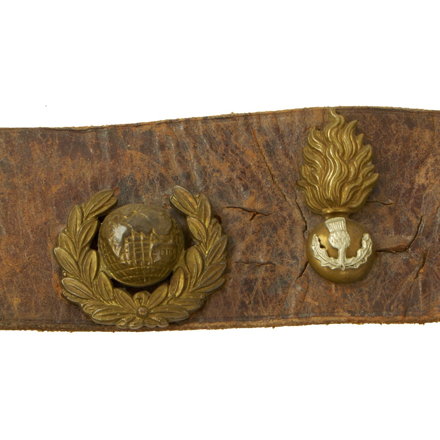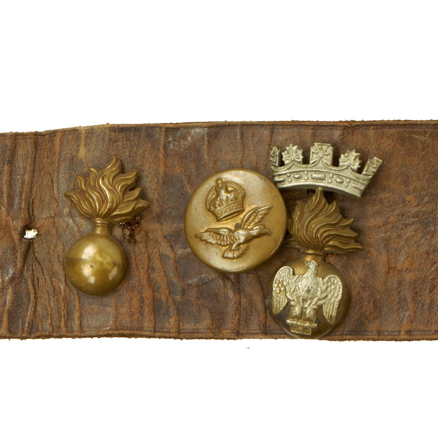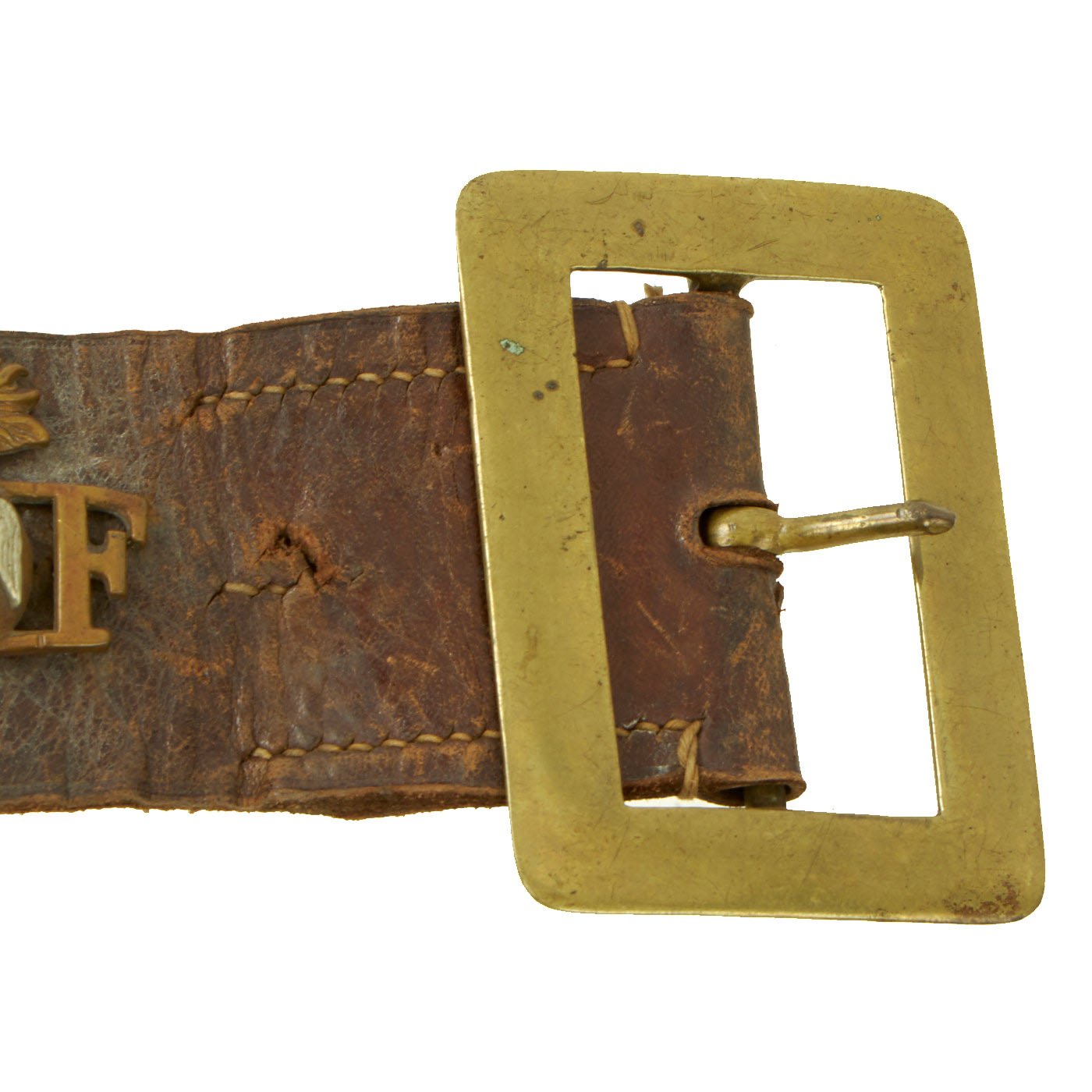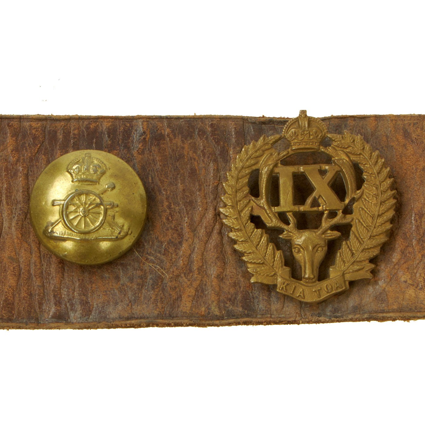 This example offered in very good condition features a brown leather belt with a rectangular brass buckle, most likely British private purchase. It features an impressive 16 items in total attached to it, secured by a mixture of split pins, safety pins, and leather stripping. A few are installed via their own attachment tabs. Most look to be British forces regimental badges from various units, with some other insignia. Units represented include the Royal Flying Corps, the New Zealand IX Regiment, the Royal Artillery, and more. The belt measures about 36 inches long and 1 3/4 inches wide, with a brass buckle on the end.