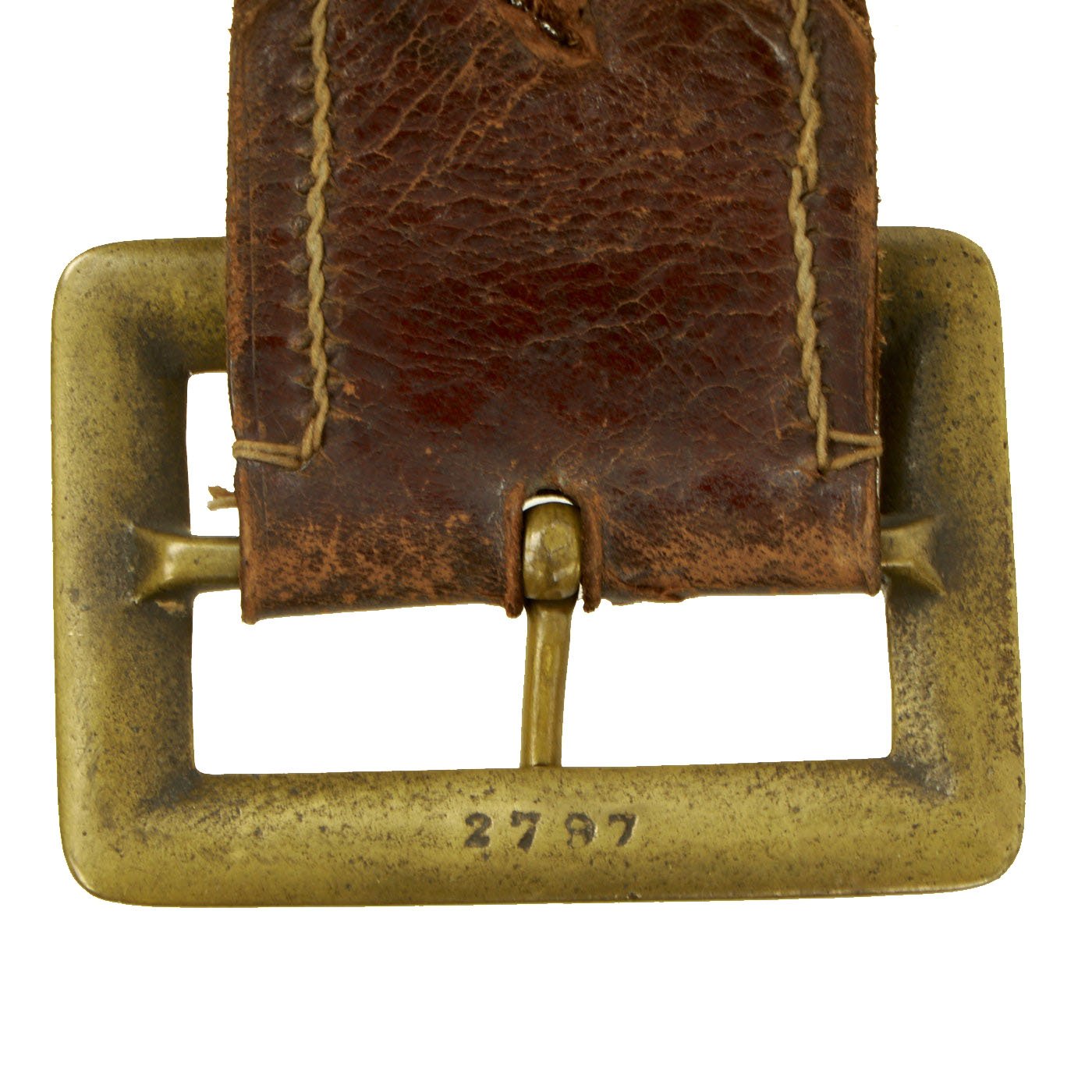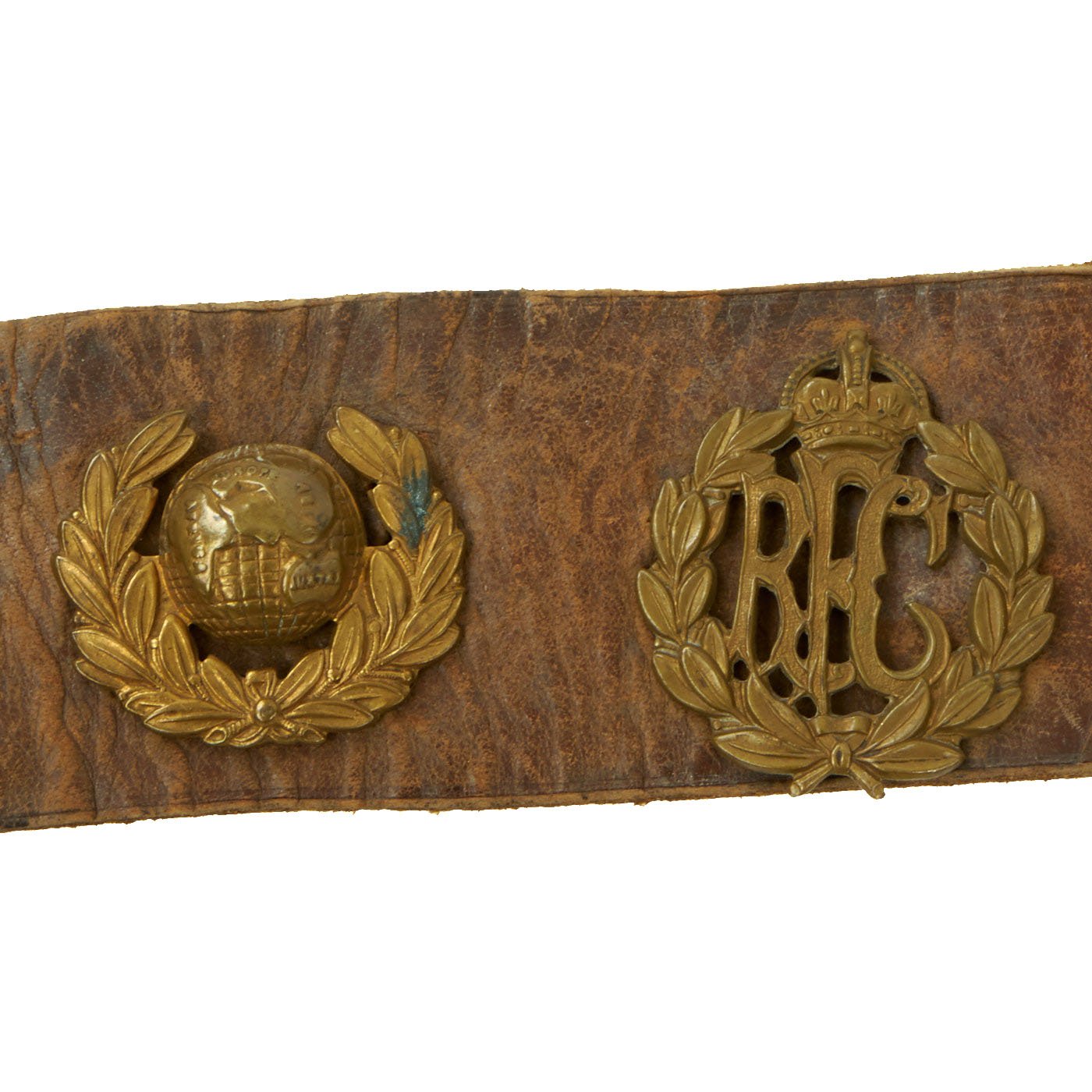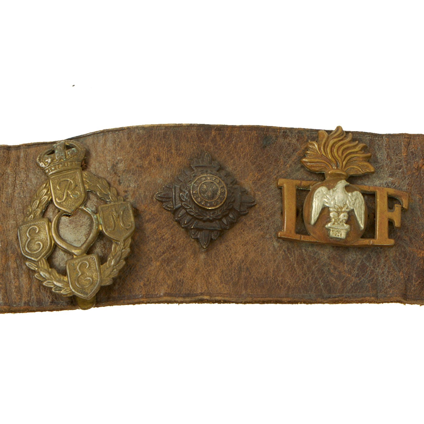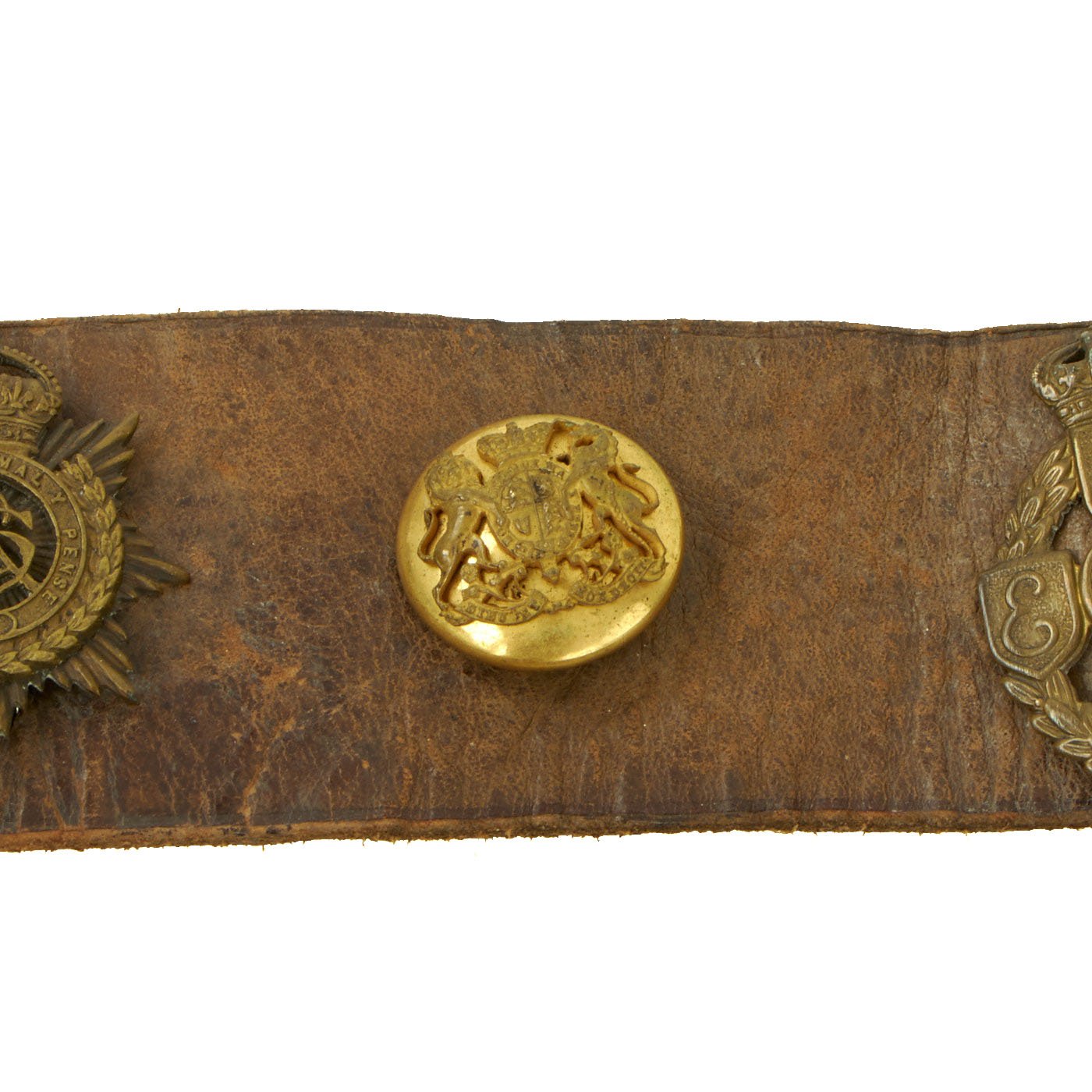This example offered in very good condition features a brown leather belt with a rectangular brass buckle, most likely British private purchase. It features an impressive 16 items in total attached to it, secured by a mixture of split pins, safety pins, and leather stripping. A few are installed via their own attachment tabs. Most look to be British forces regimental badges from various units, with some other insignia. Units represented include the Royal Flying Corps, the New Zealand IX Regiment, the Royal Artillery, and more. The belt measures about 36 inches long and 1 3/4 inches wide, with a brass buckle on the end.