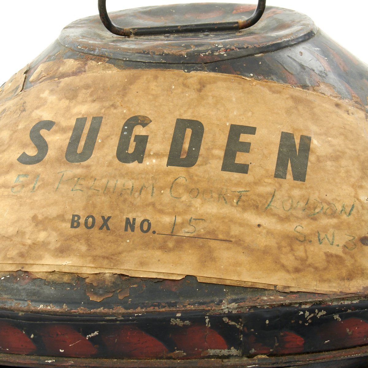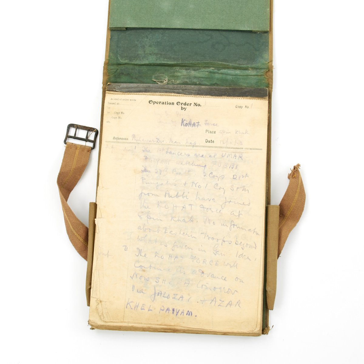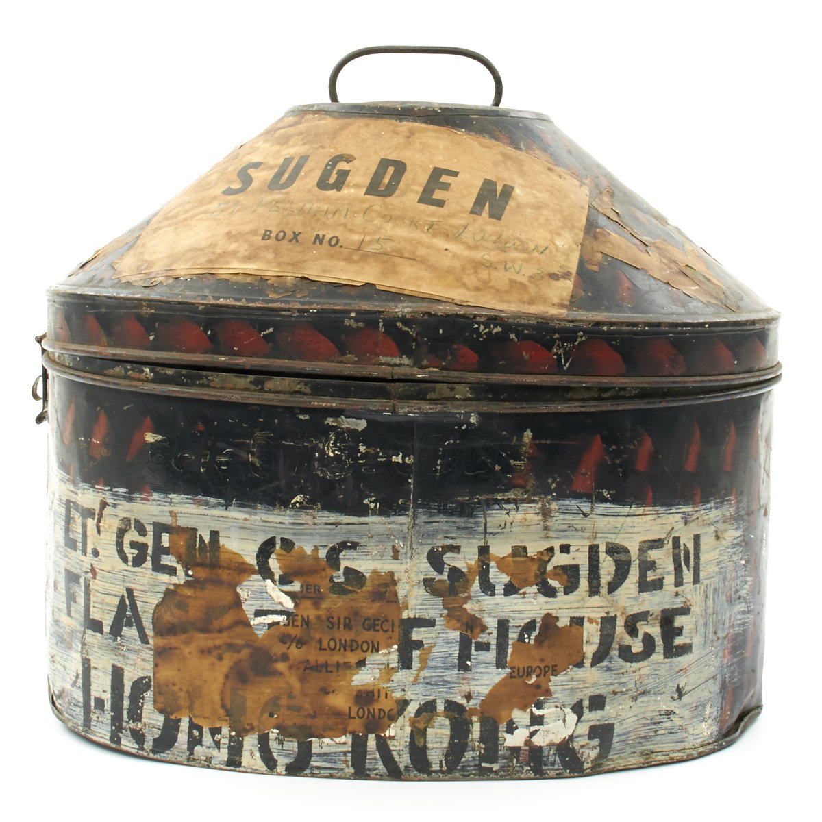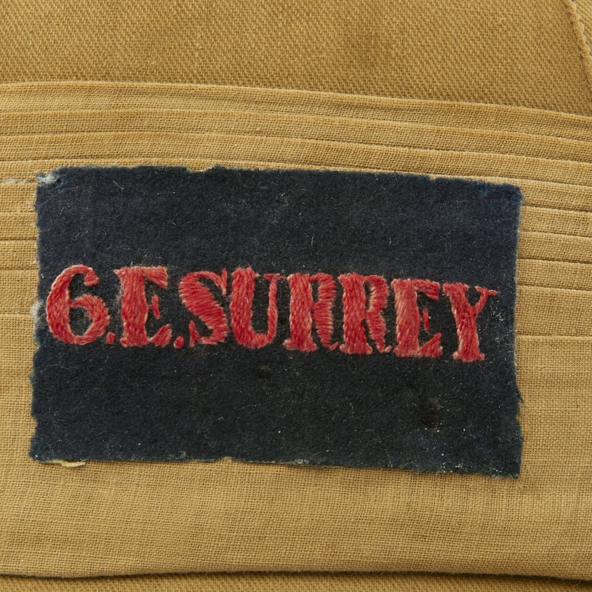 Included in the set are a fantastic high quality Sun Pith helmet. The helmet features and embroidered patch to the left side that reads 6. E. SURREY in red thread mounted on a dark blue wool background. The helmet is offered in excellent condition. The tin transit chest which is named SUGDEN with long address on the top, along with an Orient Express label. The side is named to Lt. General Sugden with an address in Hong Kong. Also included is an Operation Orders Book detailing troop movements and orders of the 14th K.G.O Sikhs.