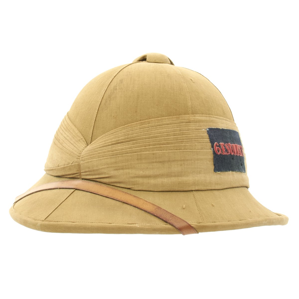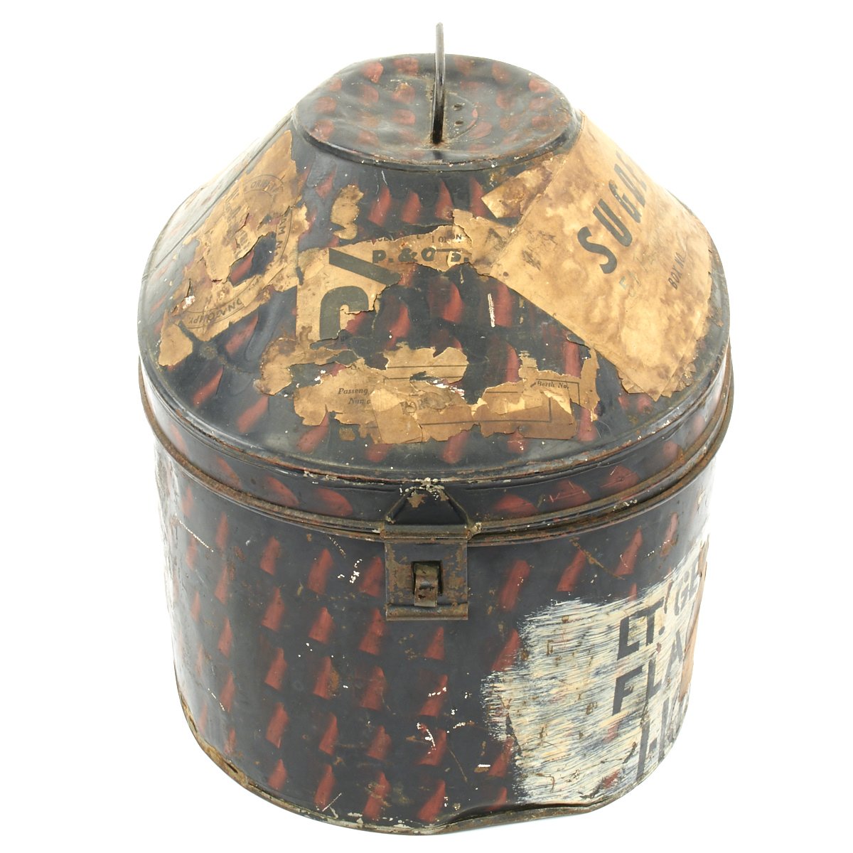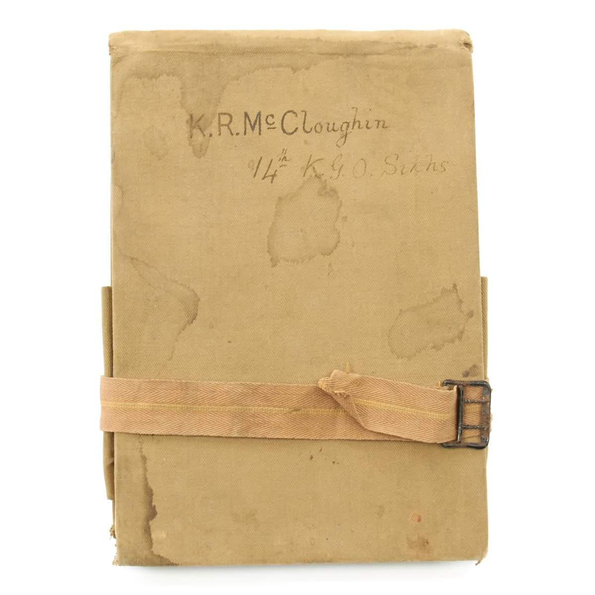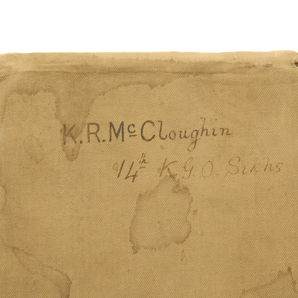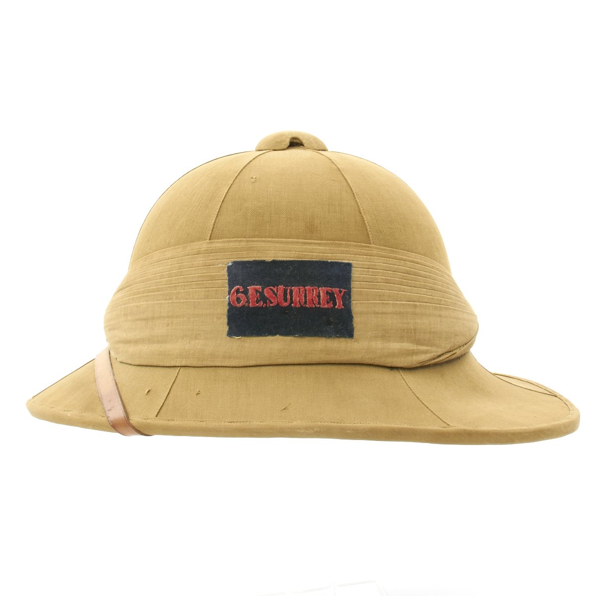Included in the set are a fantastic high quality Sun Pith helmet. The helmet features and embroidered patch to the left side that reads 6. E. SURREY in red thread mounted on a dark blue wool background. The helmet is offered in excellent condition. The tin transit chest which is named SUGDEN with long address on the top, along with an Orient Express label. The side is named to Lt. General Sugden with an address in Hong Kong. Also included is an Operation Orders Book detailing troop movements and orders of the 14th K.G.O Sikhs.