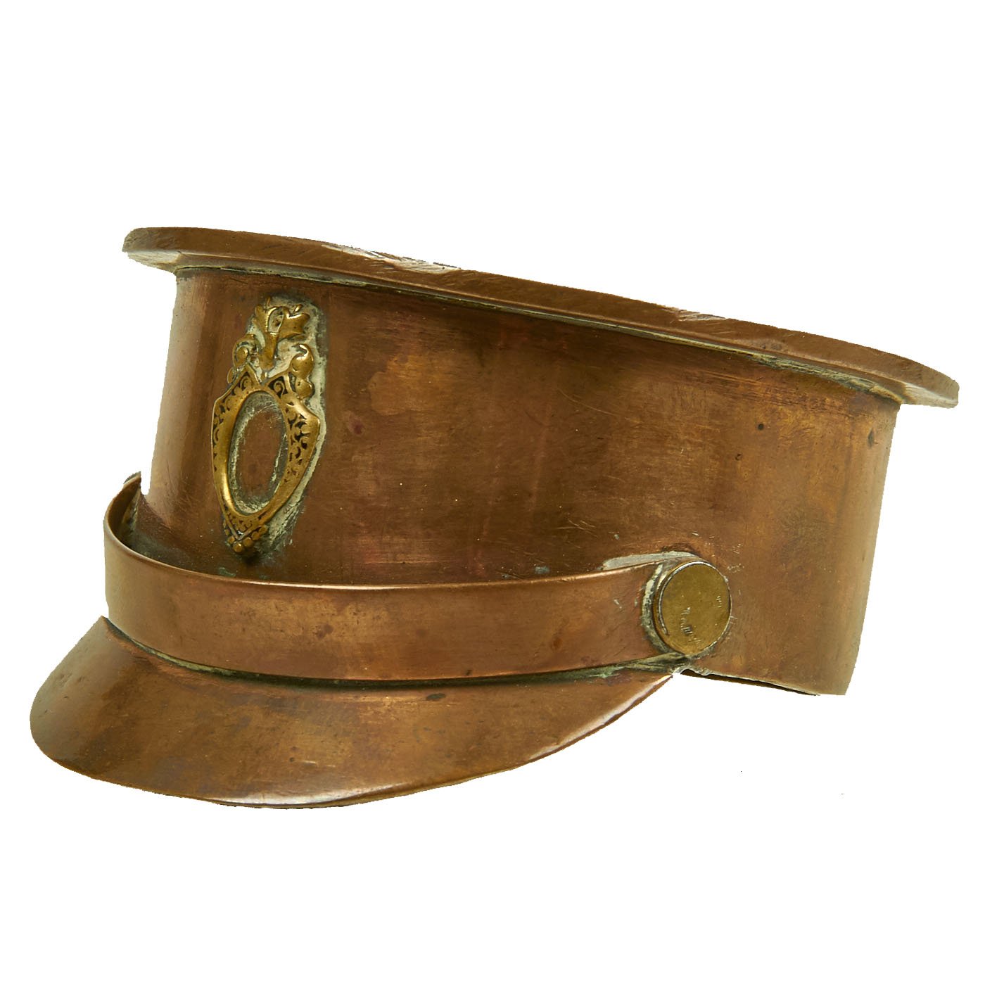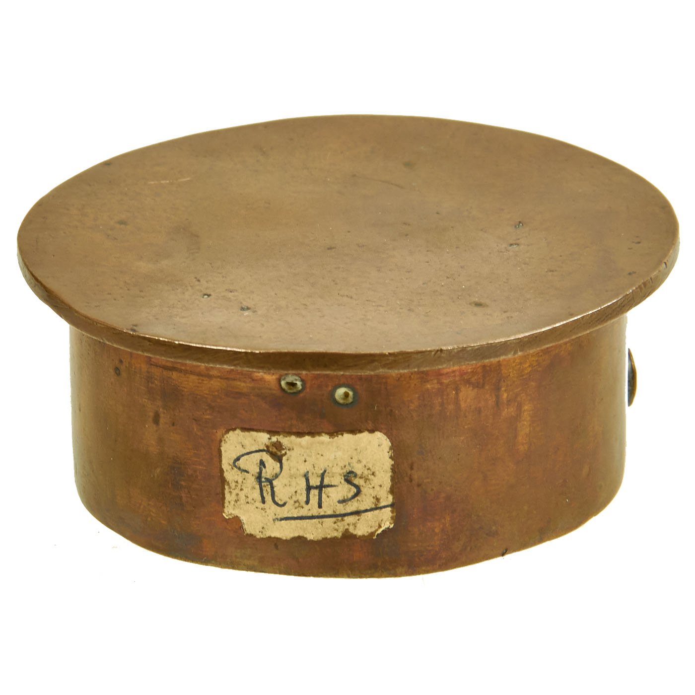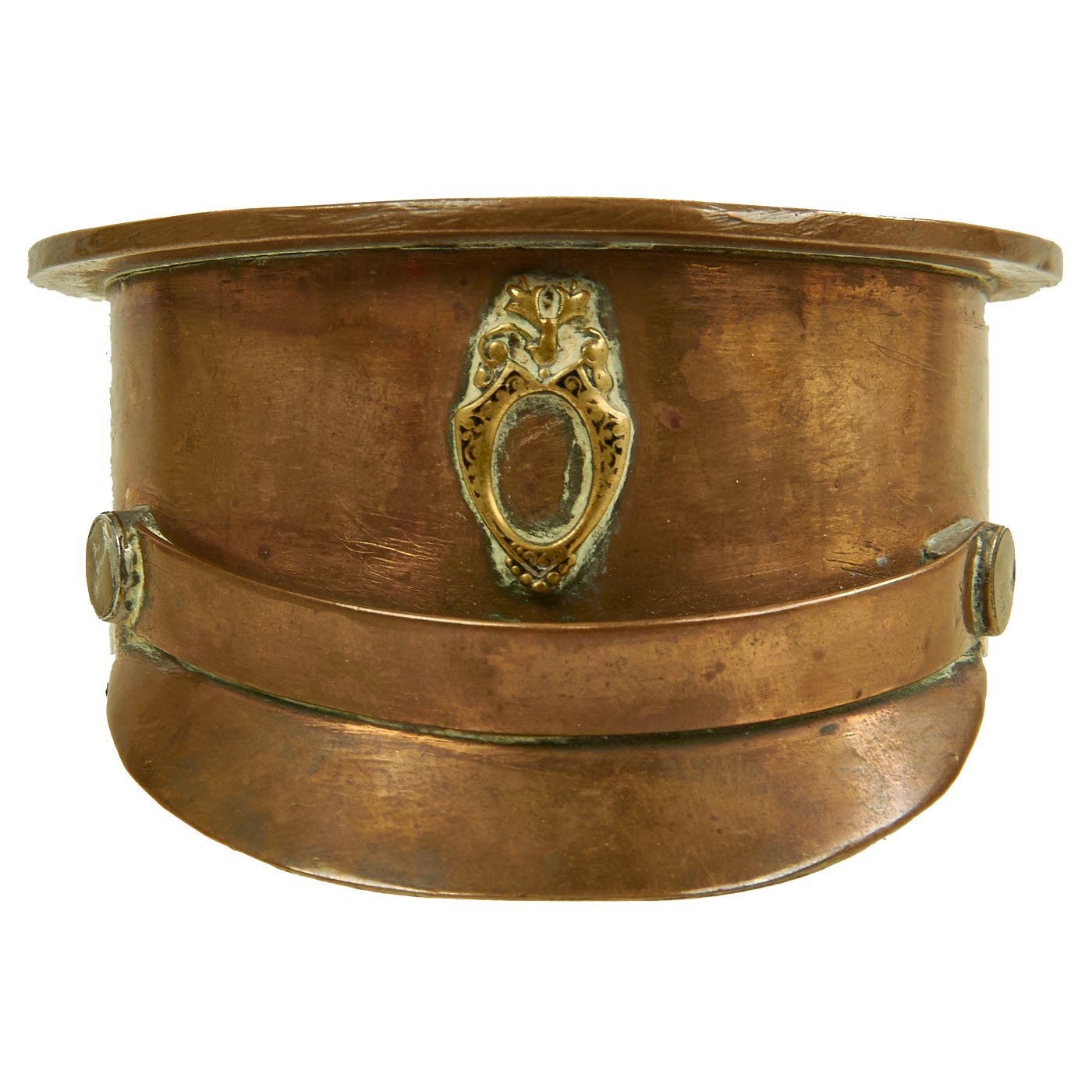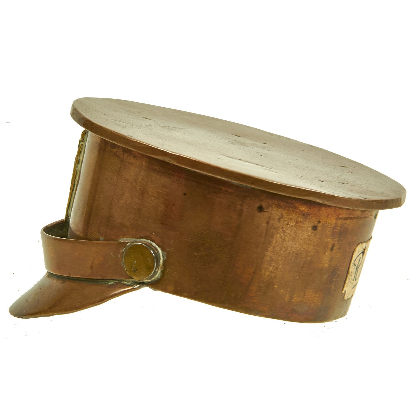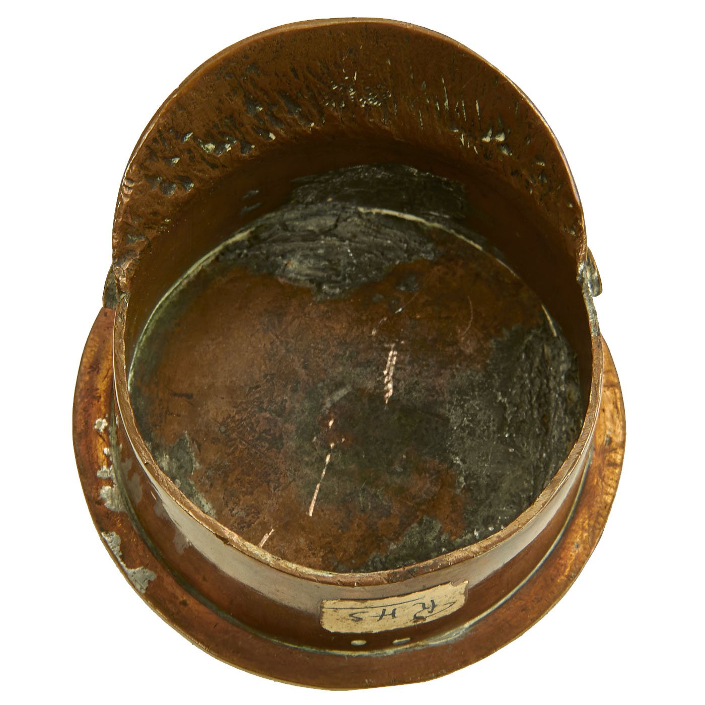 Original Item: One-of-a-kind. This is a fantastic piece of World War One Trench Art! Featuring dark brass patina finish from an artillery shell casing that measures approximately 2.5" in diameter. Soldered to the front appears to be the Stag Head for a Canadian Seaforth Highlander cap badge, but we aren't sure. Overall a really nice eye appealing piece of Great War Trench Art!