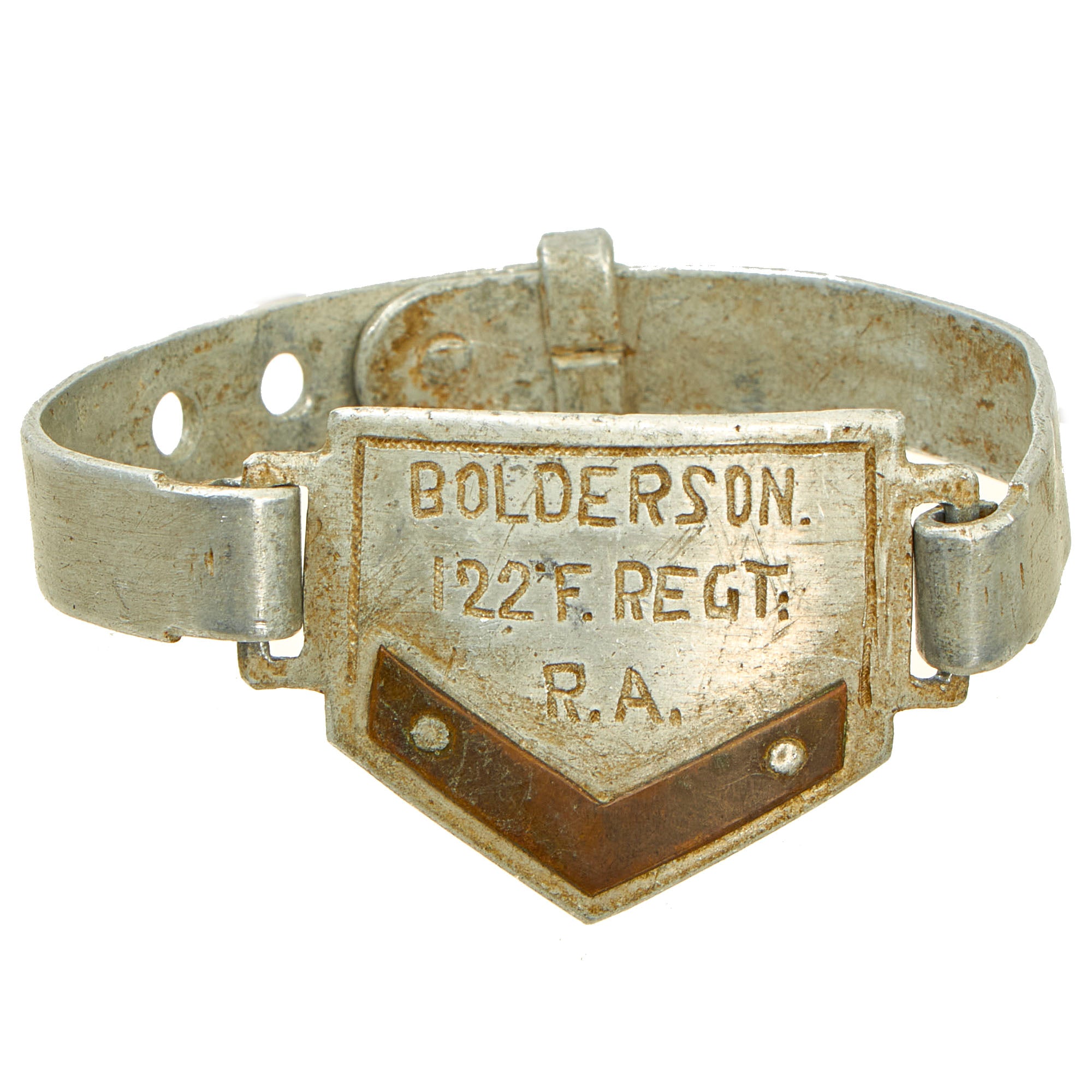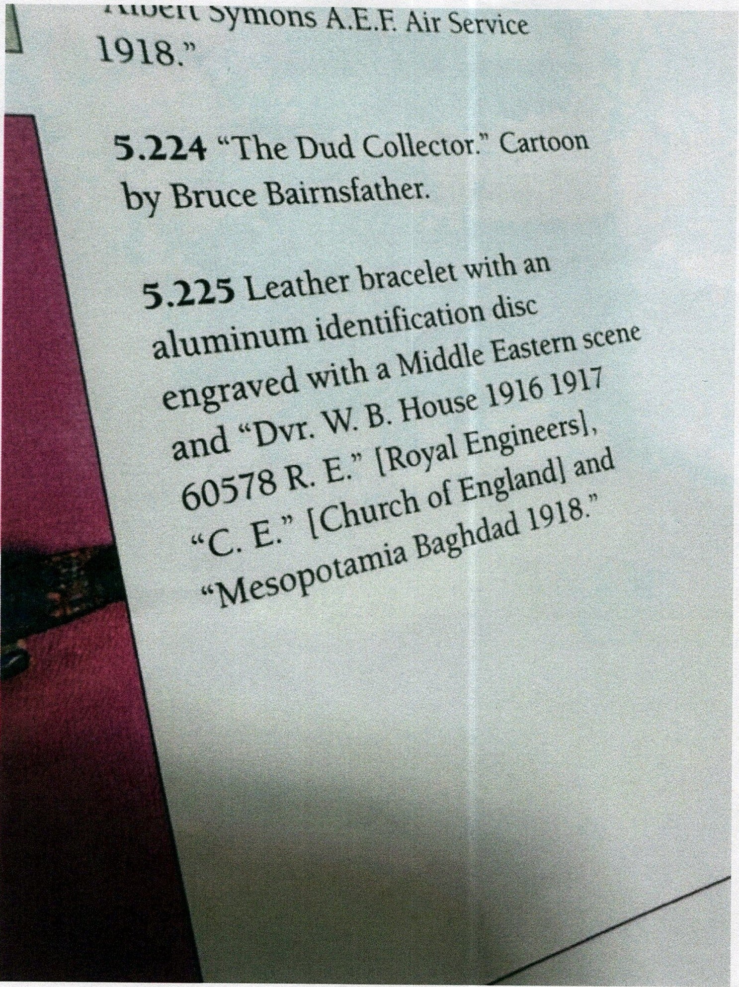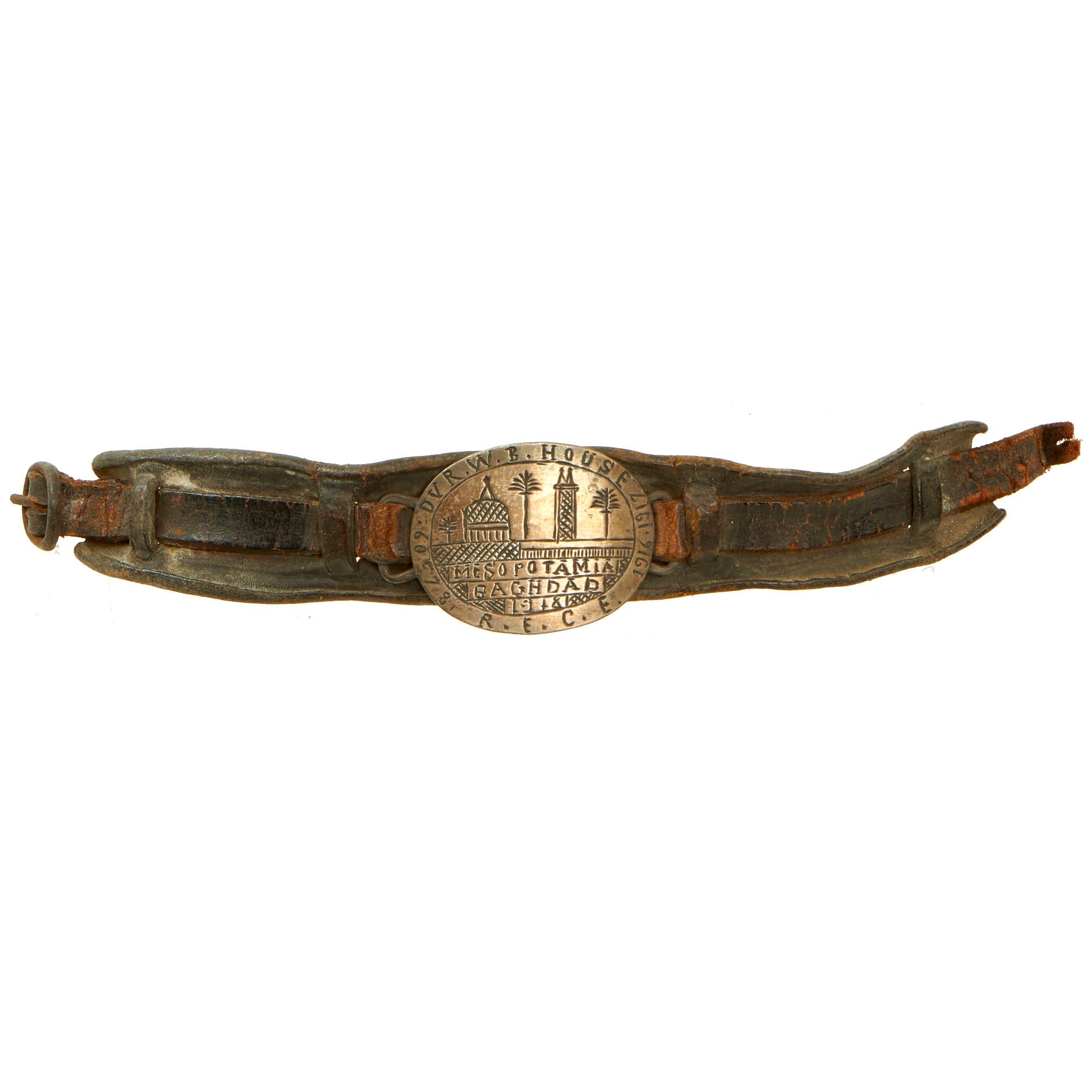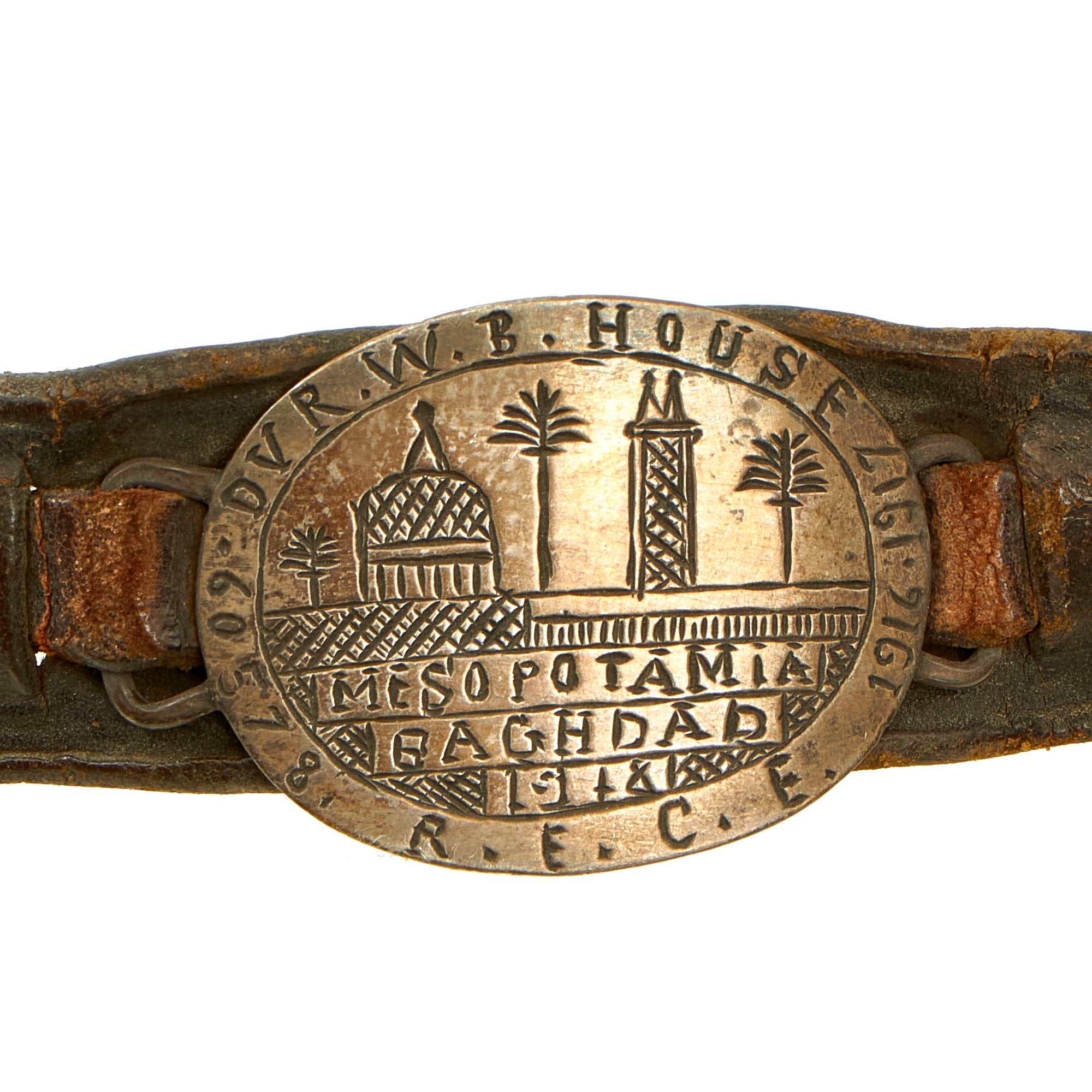 “Leather bracelet with an aluminum identification disc engraved with a Middle Eastern scene and Dvr. W.B. House 1916 1917 60578 R. E. (Royal Engineers), C. E. (Church of England) and Mesopotamia Baghdad 1918.”