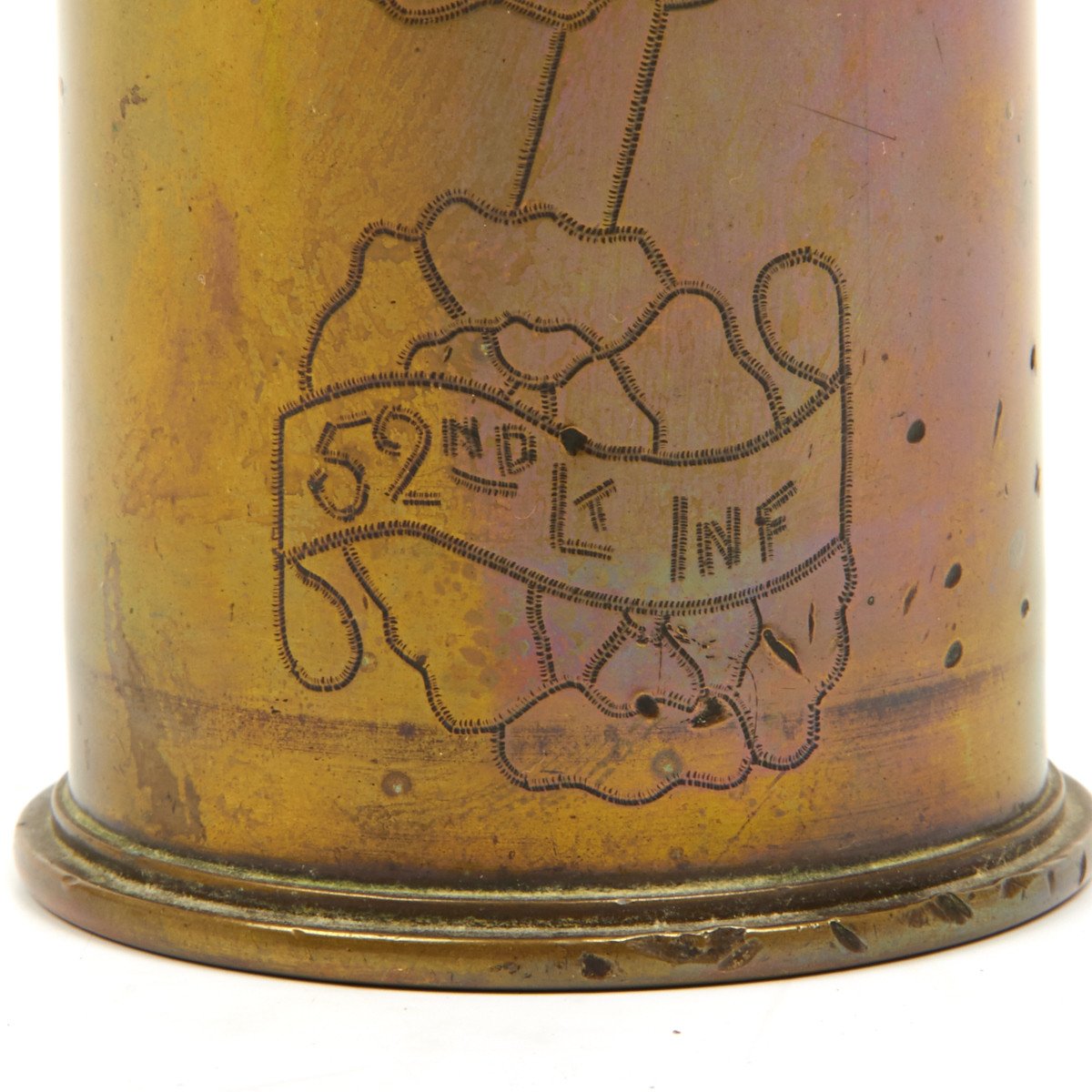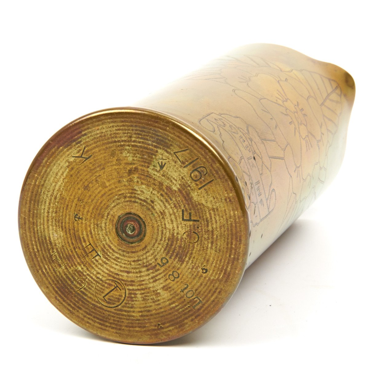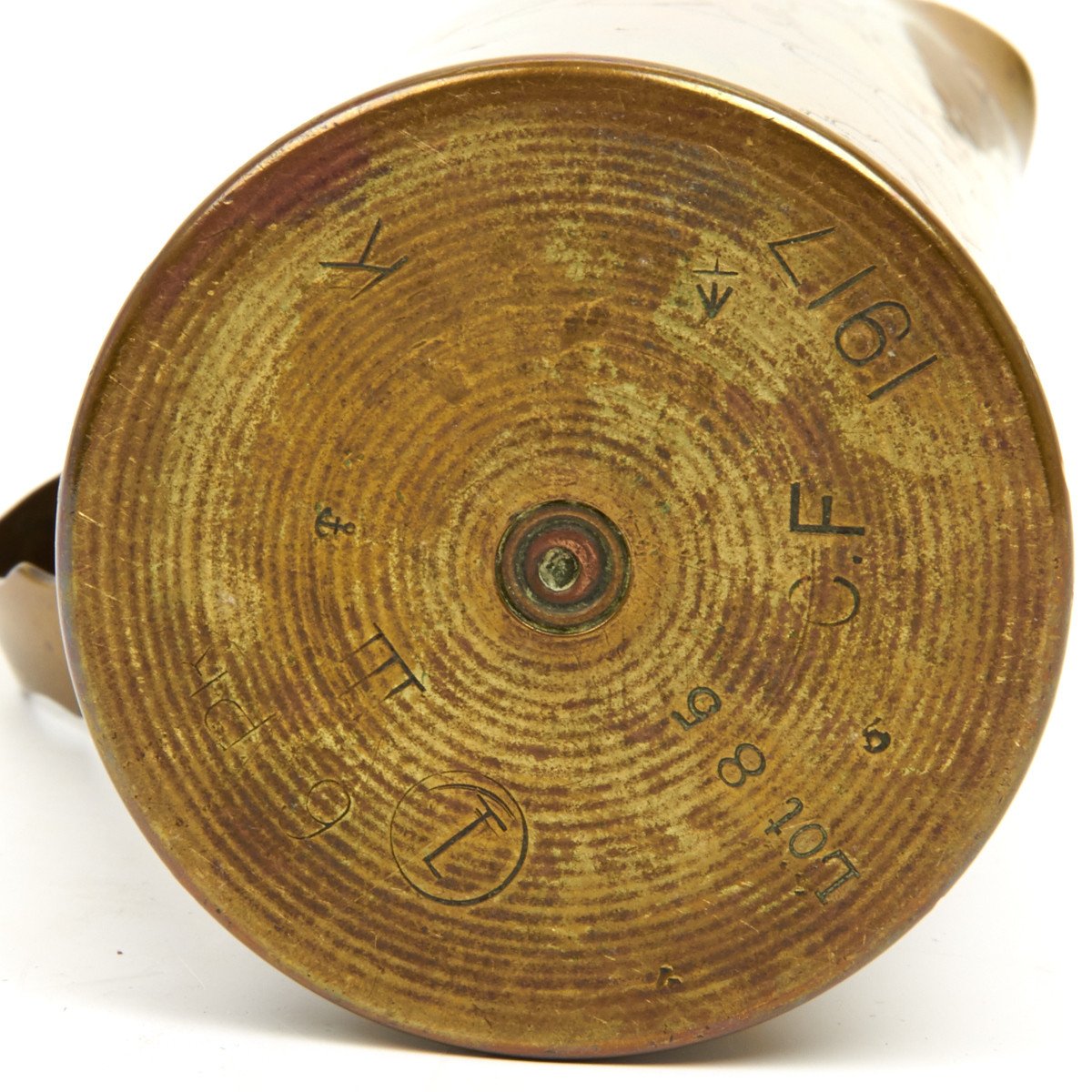 Original Item: One-of-a-kind. This is a charming piece of Great War history. It is an original British Navy 1917 dated brass artillery shell case that contained a 6 LB projectile complete with full original markings including Broad Arrow on bottom.