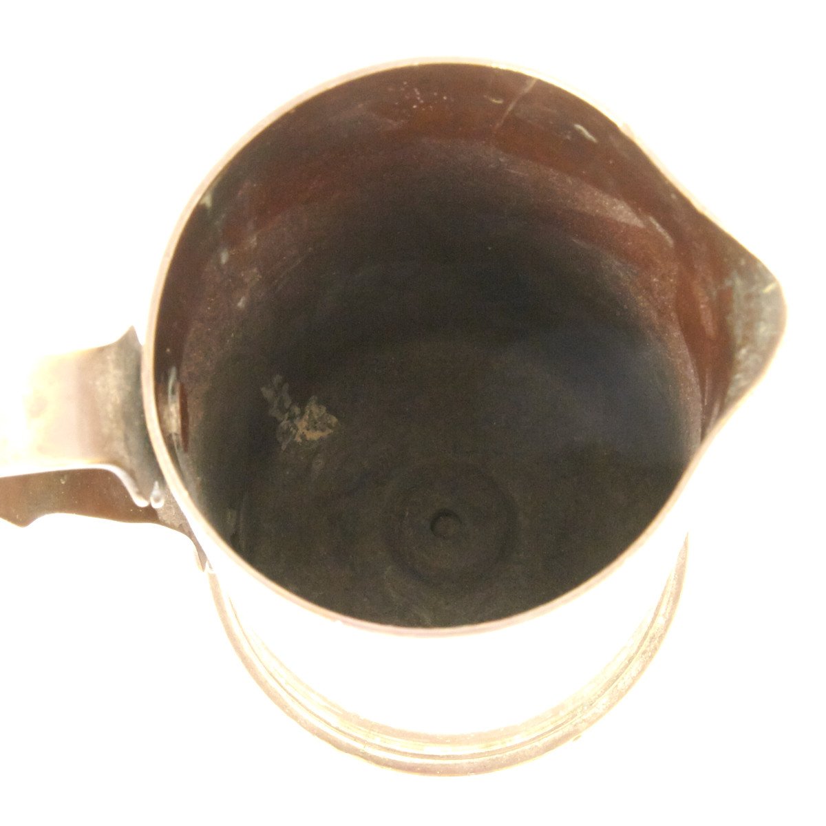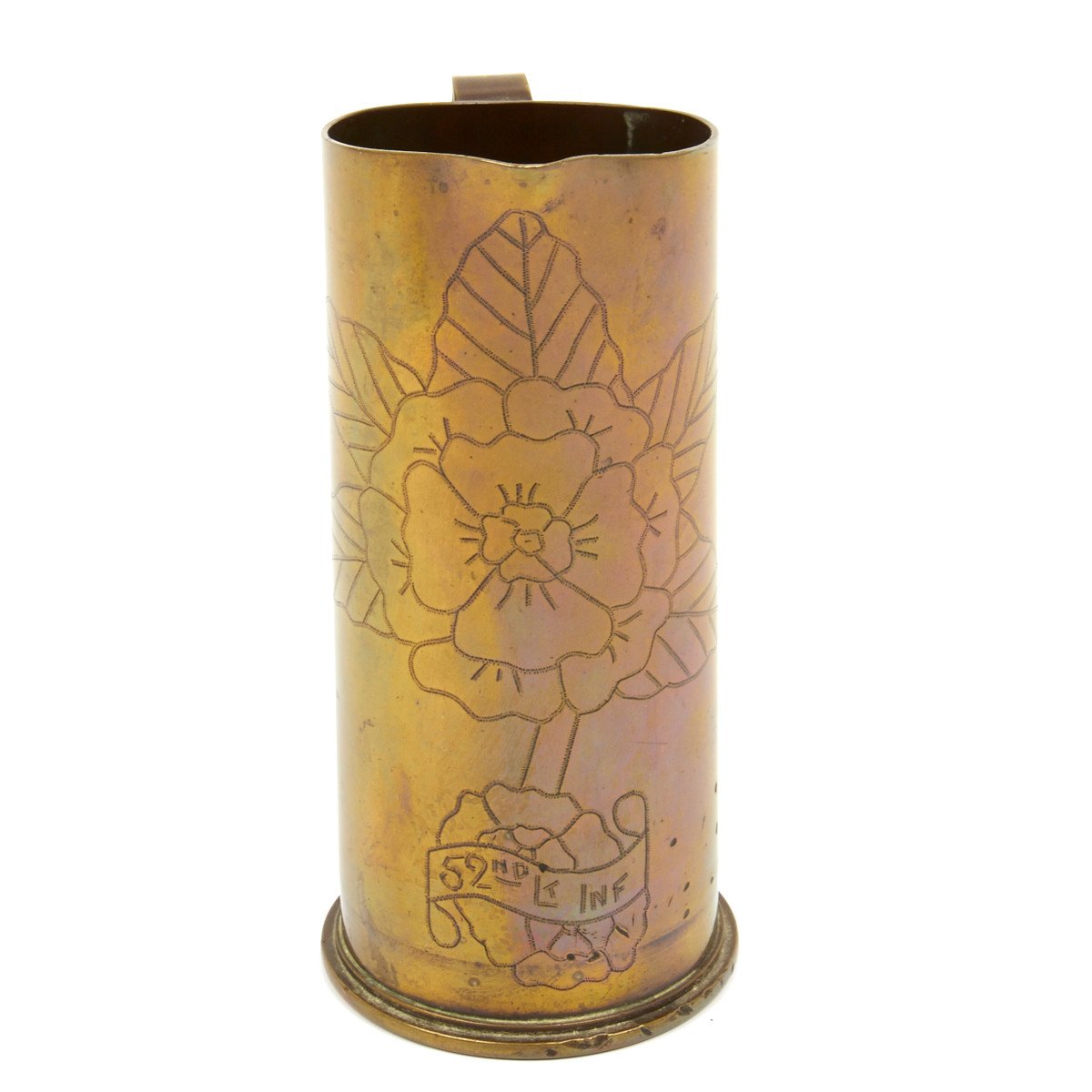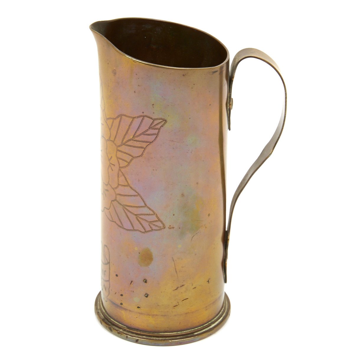 Since brass is unsuitable for drinking water we feel this was made as a watering jug for flowers however it may have been originally fashioned to pour water into a Vickers Machine gun water jacket which because of the small opening is not an easy task. Nevertheless, this is a charming piece of WW1 Trench Art.