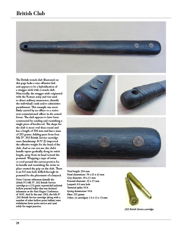 The British trench club illustrated on this page lacks a true offensive feel and appears to be a hybridization of a swagger stick with a trench club. Historically, the swagger stick originated with the Roman army and was used to direct military maneuvers, identify and individual's rank, and to administer punishment. This example was most likely carried by an officer or senior non-commissioned officer in the armed forces. The club appears to have been constructed by sanding and varnishing a single piece of hardwood. The shape for the club is more oval than around and has a length of 394 mm and has a mass of 295 grams. Adding parts from four Mk IV .303 British Service cartridge cases (headstamp; B IV J) improved the effective weight for the head of the club. And as one can see, the club's handle tapers gradually along its entire length, away from its head toward the pommel. Wrapping a type of twine or cord around the cutout portion for its handle and varnishing the twine in place created the grip on the club. There is an 8.0 mm hole drilled through its pommel for the placement of lanyard.