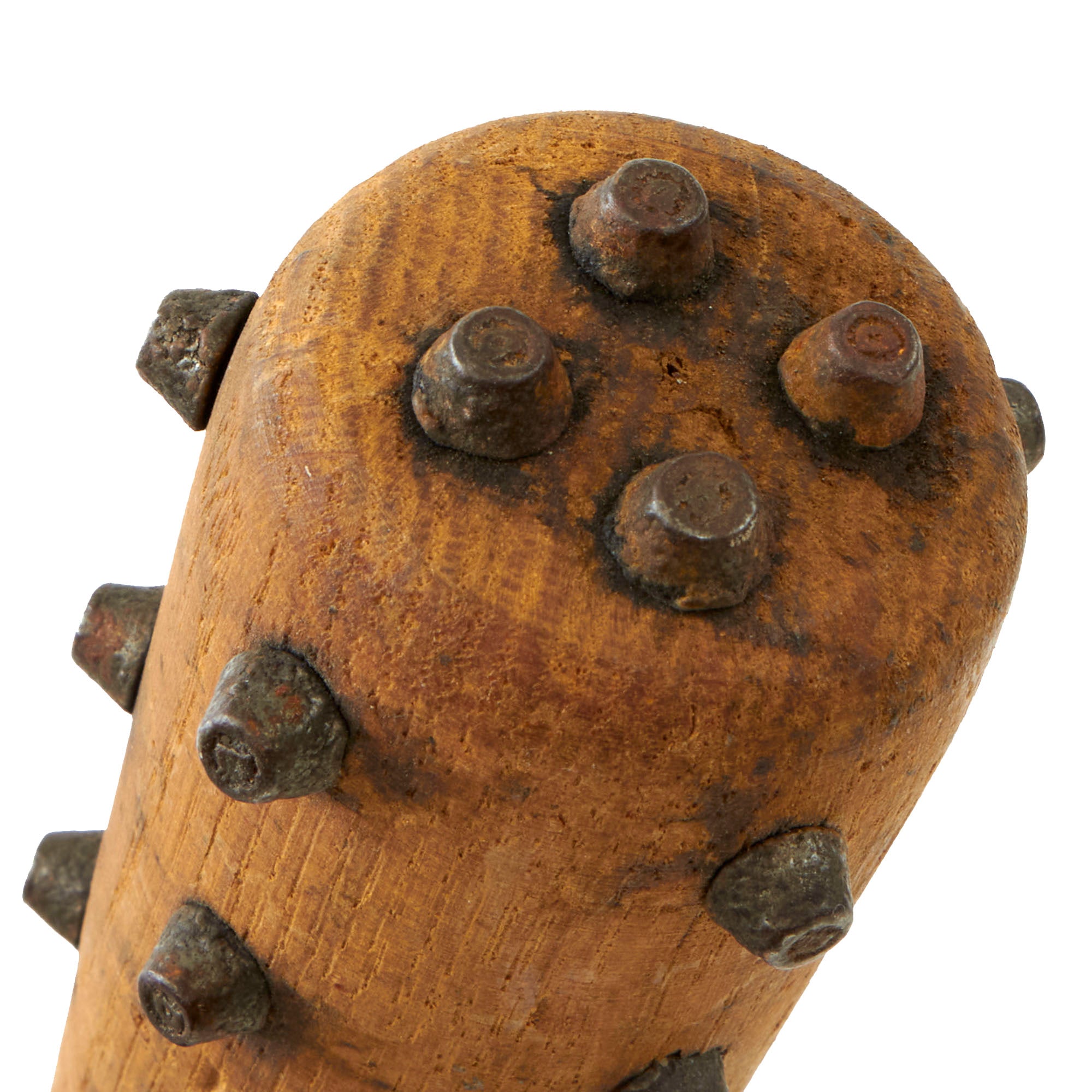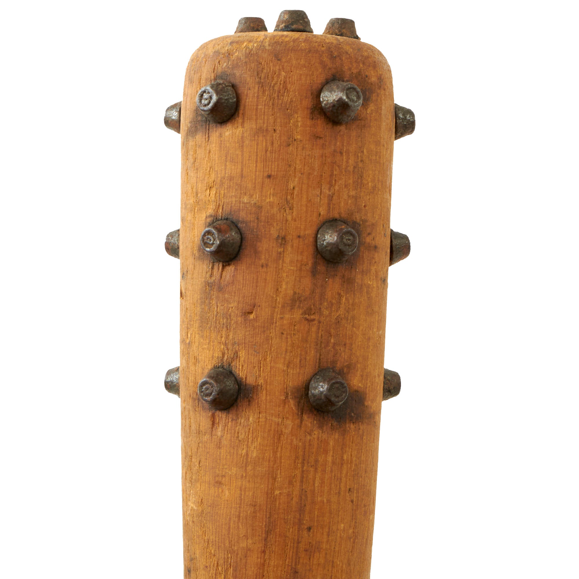 This is a fantastic example of a World War One British trench raiding mace or club with 19 hobnails. Its length approximates 16 1/2 inches and has a mass of nearly 1 lb. The diameter of the head from one point to another is approximately 2 inches. The wood has aged wonderfully and may have originally been a billy club by its appearance. An incredible example of a nearly impossible to find Great War British Trench Mace.