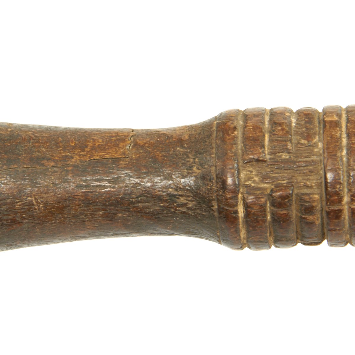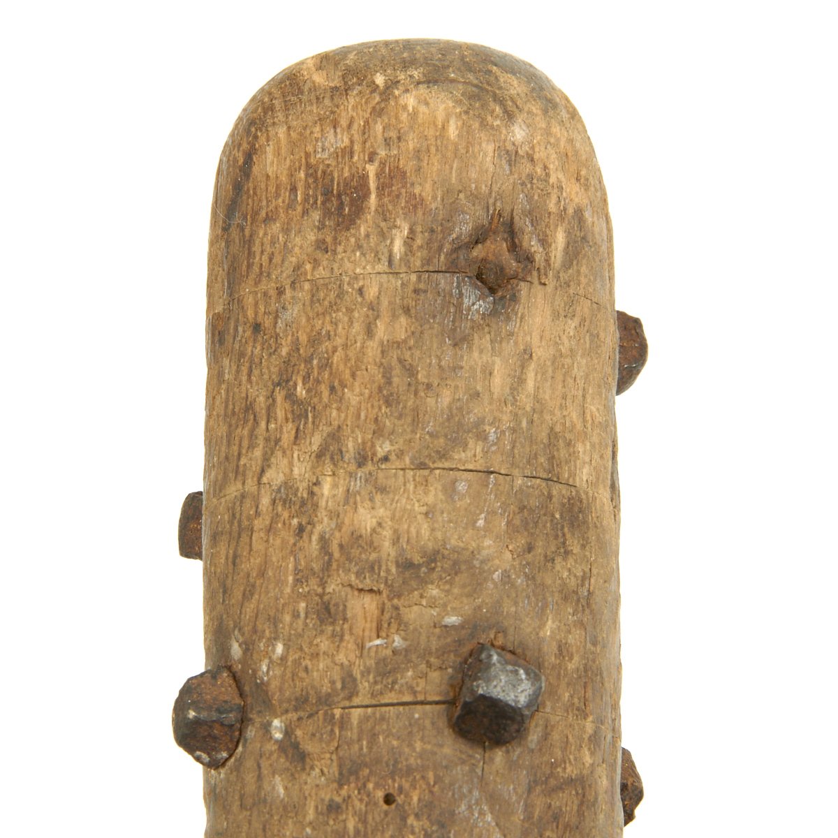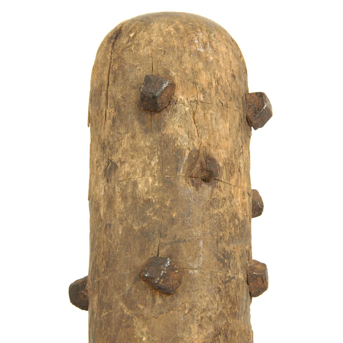 This example has a 18 inch wood shaft with a partial lead core (the upper section has fallen out) to what was originally the upper 6 or 7 inches of the head. The head of the club is encircled with rows of iron hobnails or studs, which would shatter a soldier's skull with ease. The some studs are long absent but you can see where they were embedded into the shaft. Base has lanyard hole where a leather lanyard would have been secured. Clearly made up in field workshops, these proved highly effective and are extremely hard to find on today's collector market. Purchased from a collection used in a new publication on weapons of the Great War. Exceptionally rare.