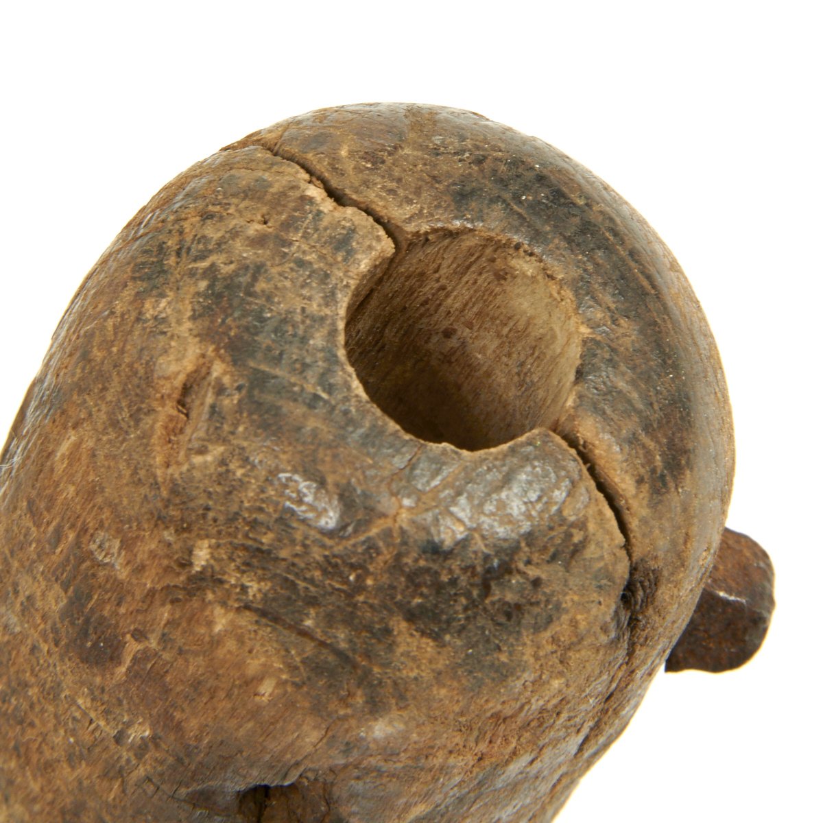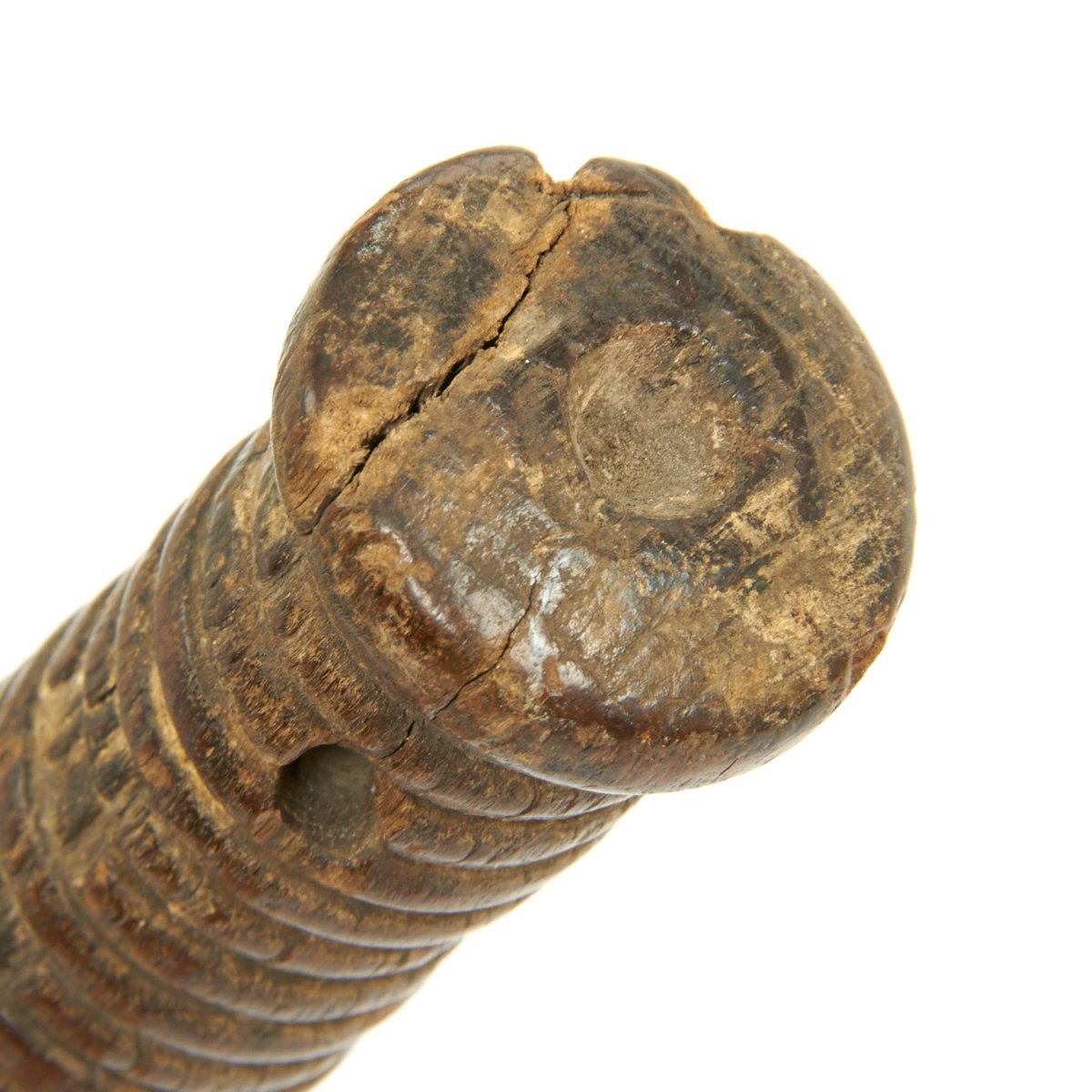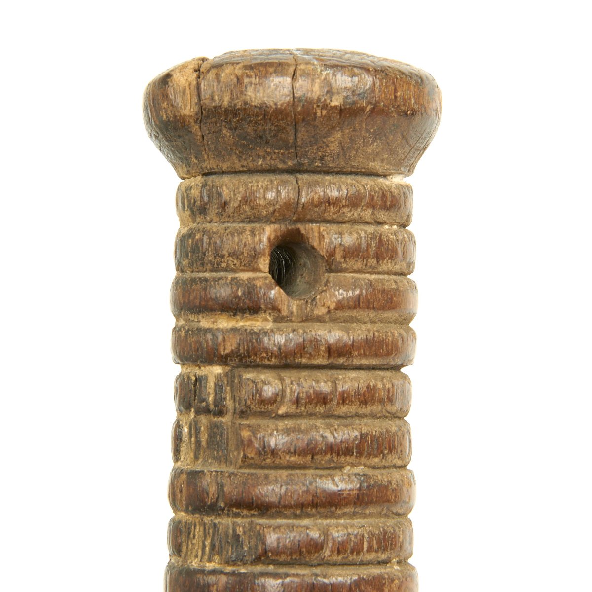 This example has a 18 inch wood shaft with a partial lead core (the upper section has fallen out) to what was originally the upper 6 or 7 inches of the head. The head of the club is encircled with rows of iron hobnails or studs, which would shatter a soldier's skull with ease. The some studs are long absent but you can see where they were embedded into the shaft. Base has lanyard hole where a leather lanyard would have been secured. Clearly made up in field workshops, these proved highly effective and are extremely hard to find on today's collector market. Purchased from a collection used in a new publication on weapons of the Great War. Exceptionally rare.