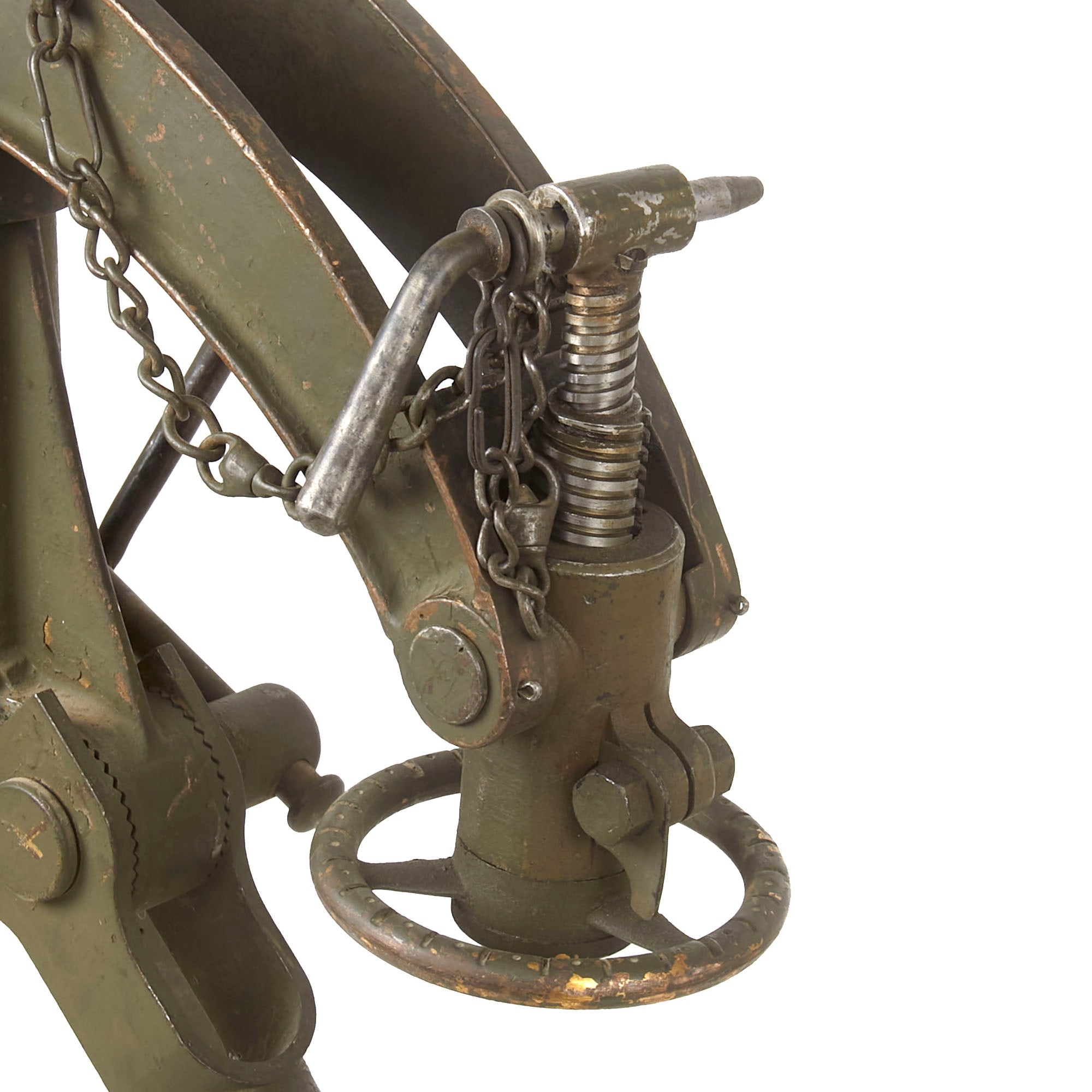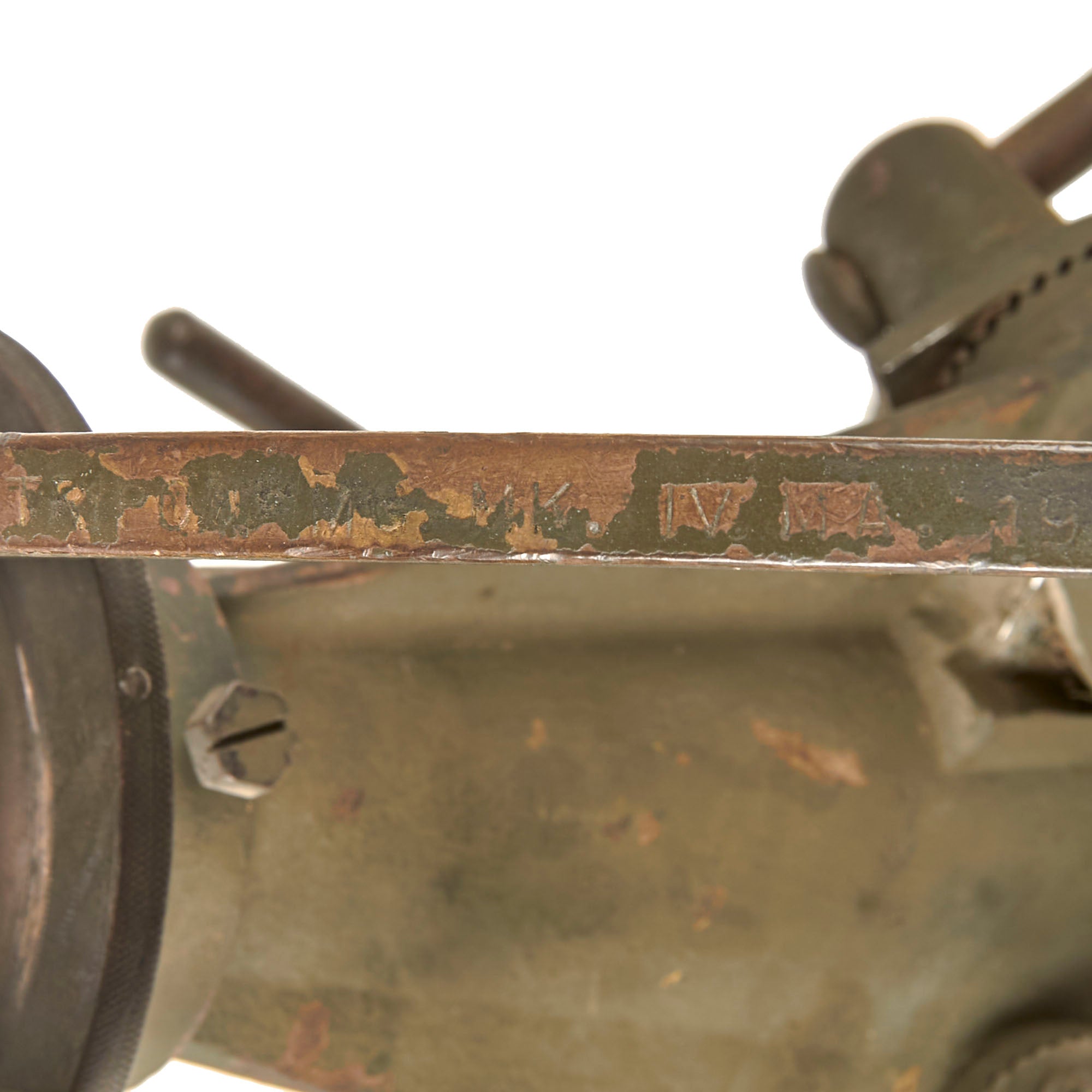 The gun comes with an extremely hard to find complete Vickers Tripod, with a brass crosshead and elevation mechanism. It does not have any data plate on the legs, and looks to be an interwar or WWII issue example, paired with an earlier produced gun. The tripod is fitted with a British brass crosshead which has some great markings on the top: MOUNT. TRIPOD. MG. MK. IV. MA. 1933., which is the tripod designation and probably the location and date of manufacture. It is also marked №326 towards the front, which would have matched it with a specific gun at some time during service. The elevation mechanism is present and functional, as are both cross pins, and all of the retaining chains look to be present, definitely a rarity.