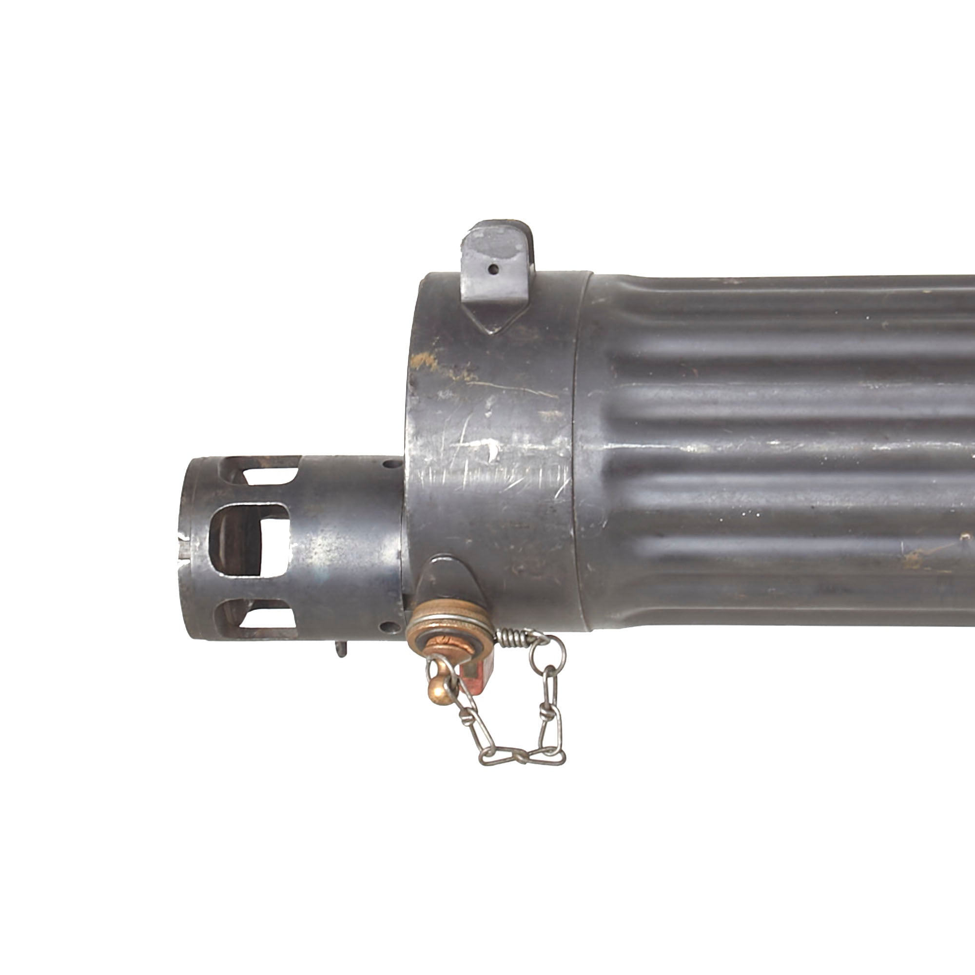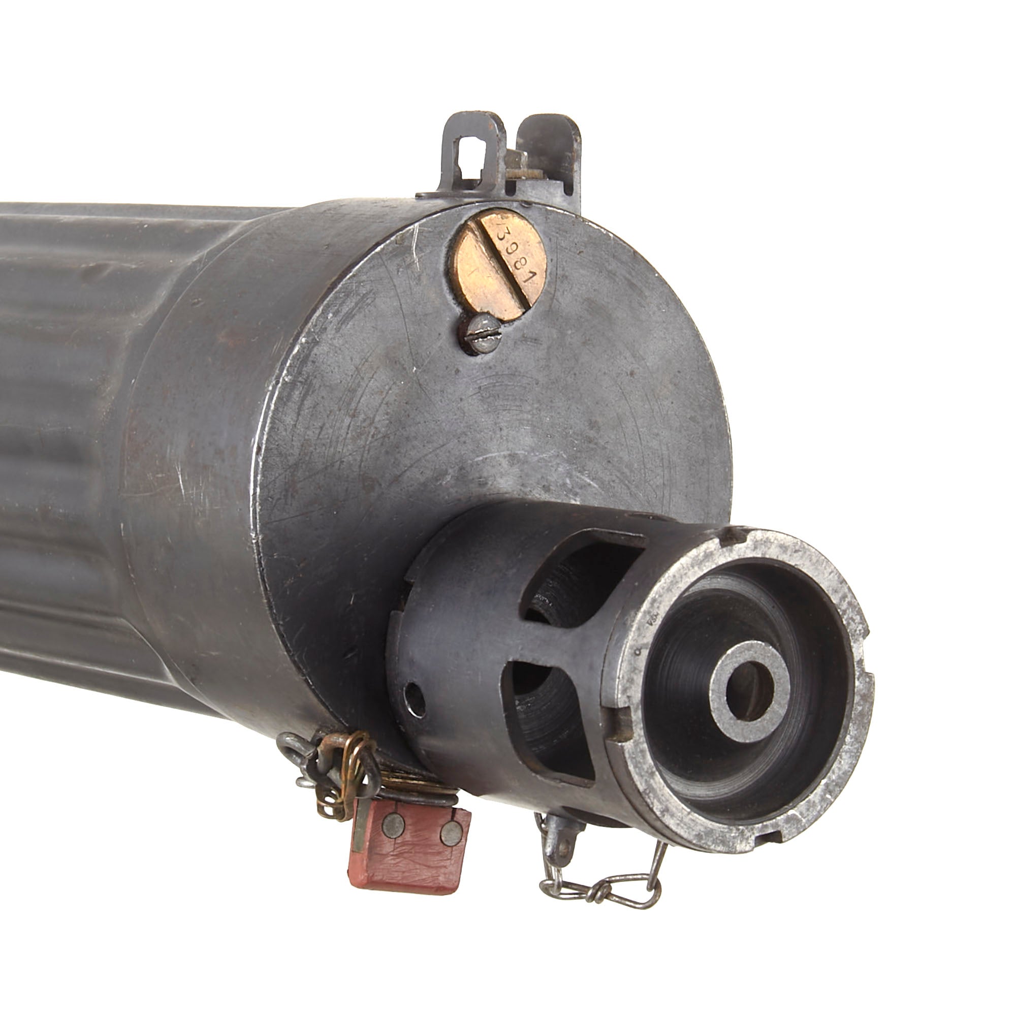 The inside of the receiver still incorporates some of the internal components, such as the crank assembly, which can still be moved back and forth with spring action due to the intact fussee spring assembly. It also has an intact steel feed block, which should be able to mount a dummy belt if desired. Behind this is a solid piece of aluminum, riveted in place to prevent any interface with the rear of the feed block, and there is no lock or barrel inside the display gun. A truly fantastic display set!