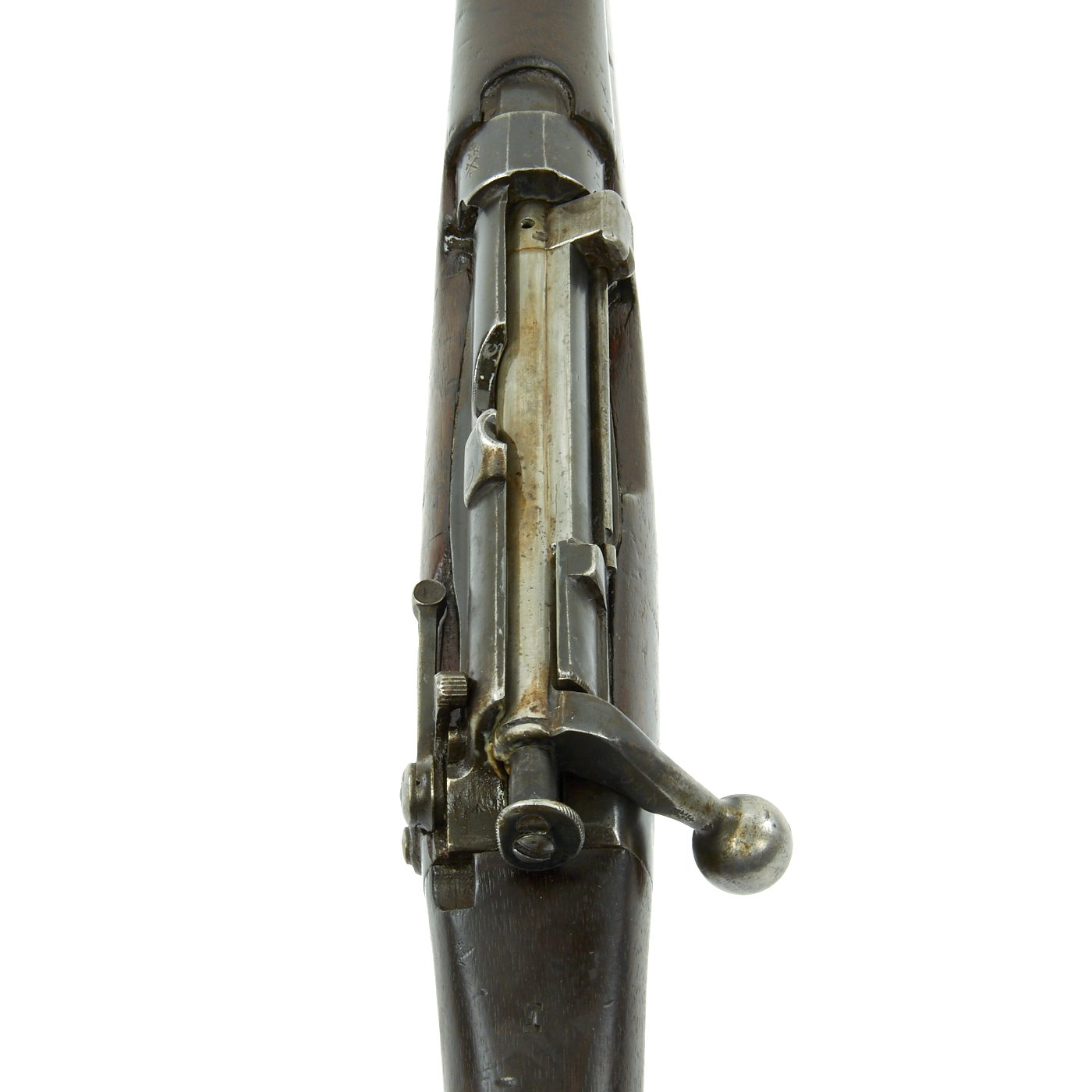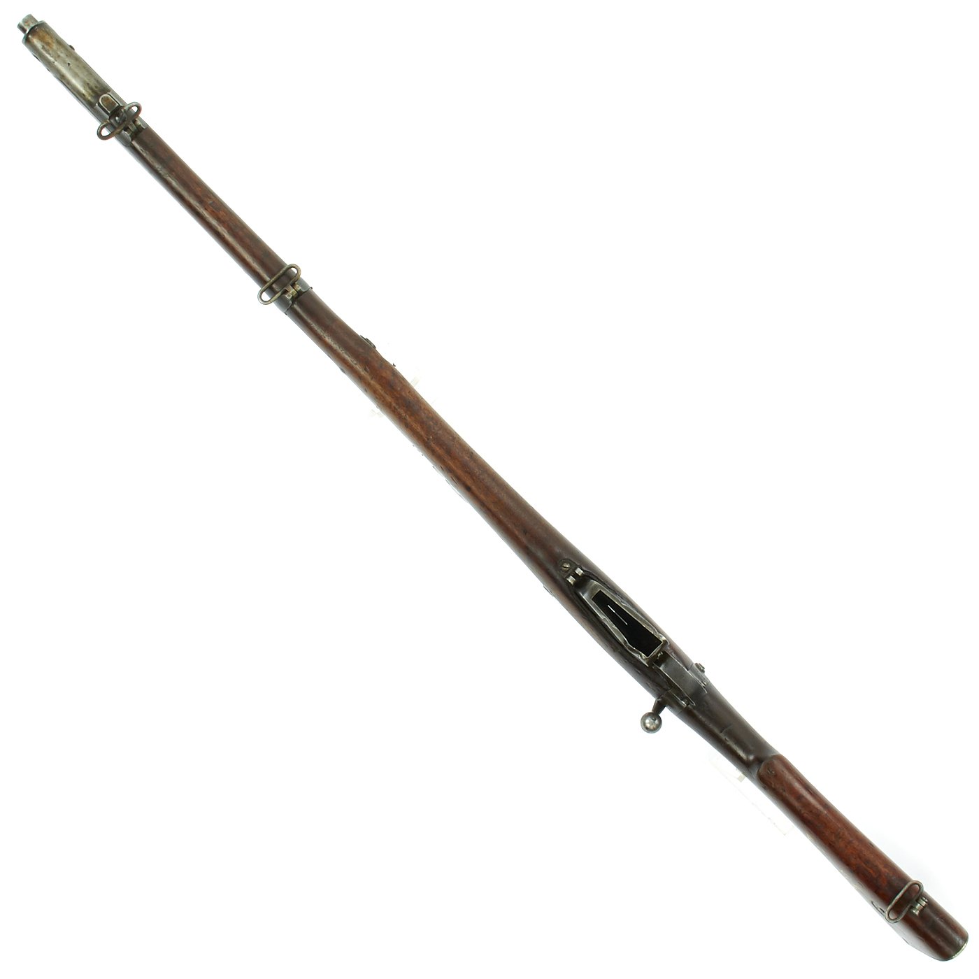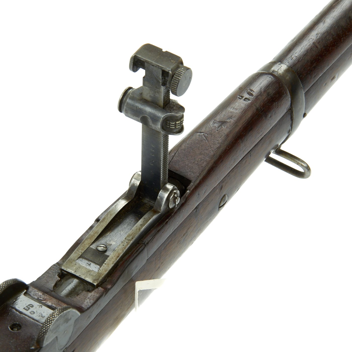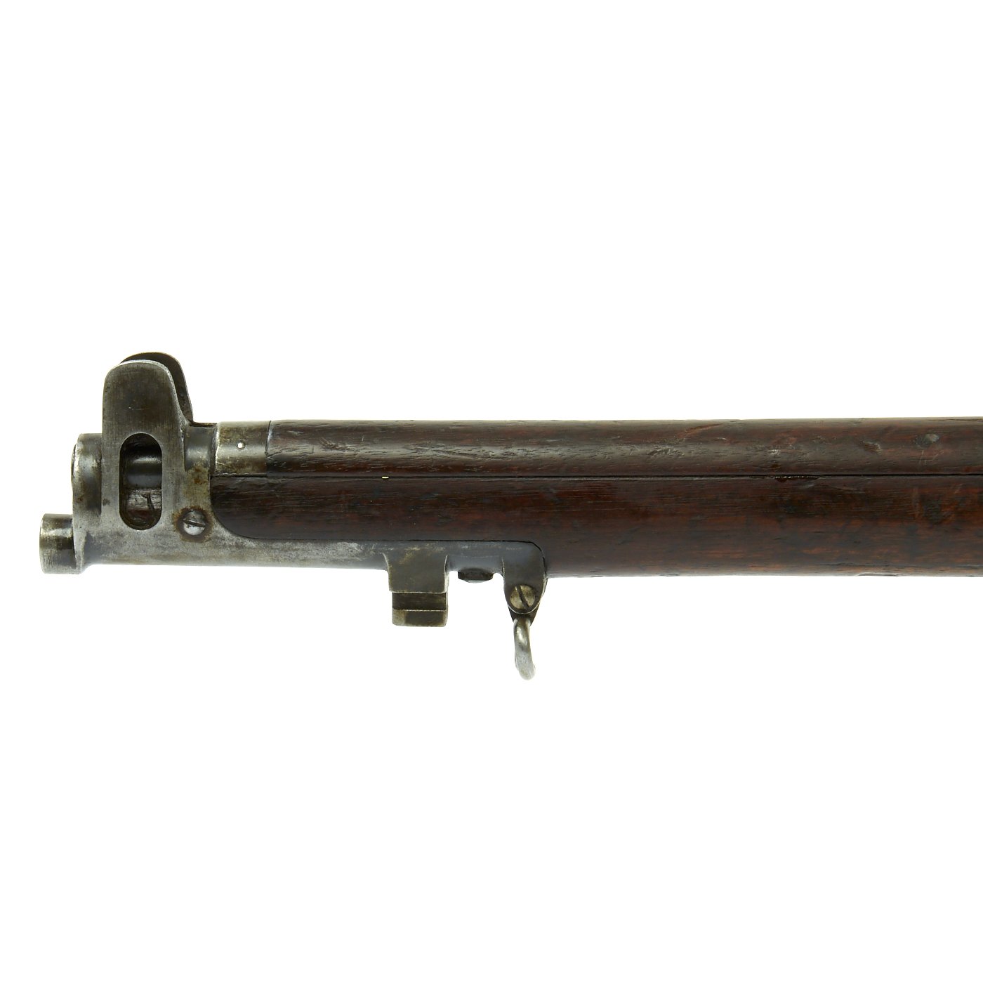It is still fitted with the LONG RANGE REAR FLIP SIGHT and the the correct DIAL SIGHT half way down the left side of the barrel. It also has the EARLIEST "pinched" fore sight protector and the EARLIEST version of the lower hand guard, incorporating steel wings screwed directly into the wood. Really a great piece of history here!