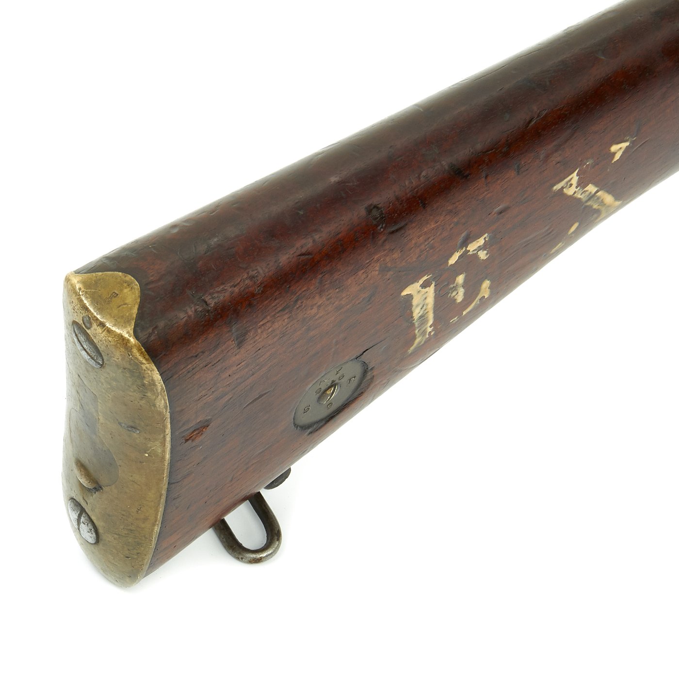 As time passed it saw extensive service, and there are numerous proofs and markings on the stock and metal, some of which are no longer completely legible. There are still regimental markings on the buttstock marking disc.